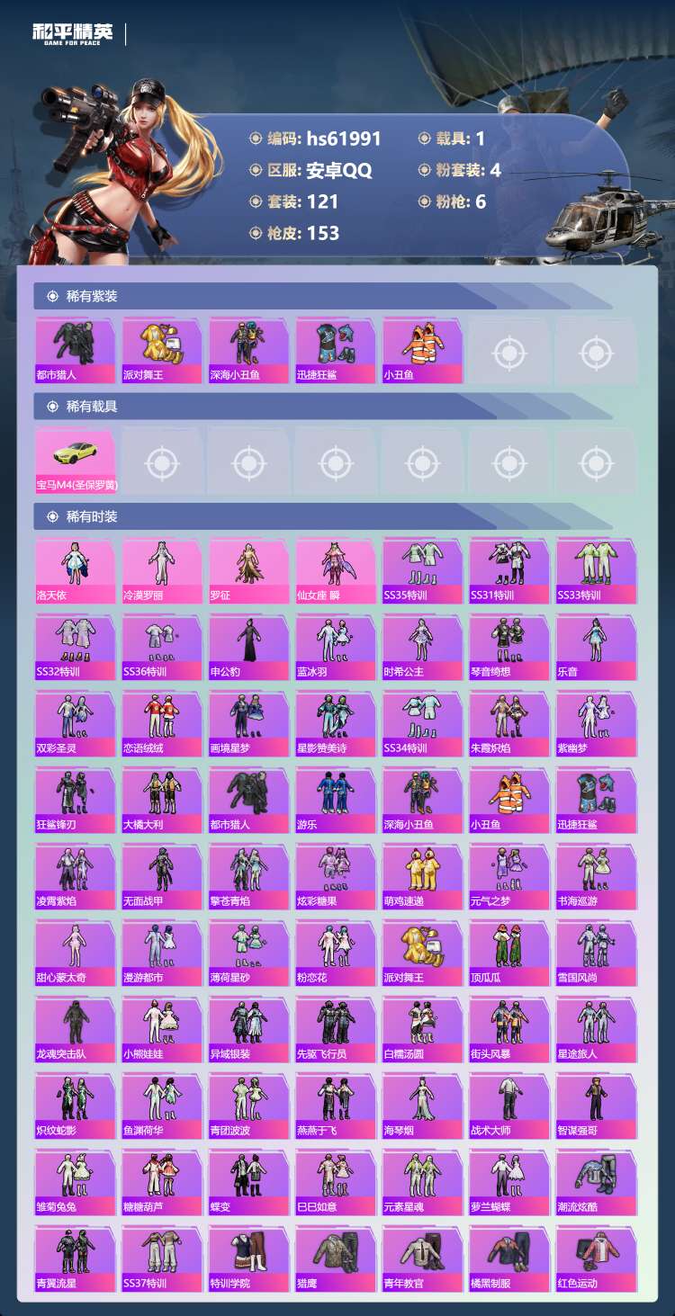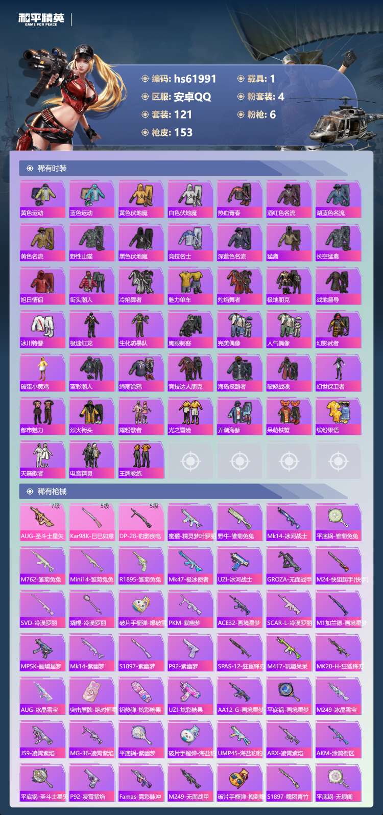 hs61991 安卓手Q-6王牌印记-4粉装-6特效枪-1载具-44620热力值-121套装-153