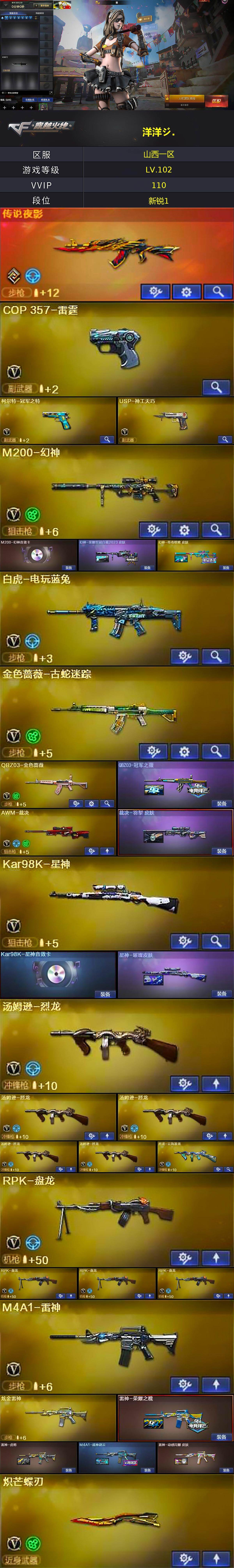 【热门武器】:传说夜影,QBZ03-金色蔷薇,HK417-朱雀,M200-幻神,金色蔷薇-古蛇迷踪,修罗-古蛇迷踪,死亡之眼,白虎-电玩蓝兔,柯尔特-冠军之特,Kar98K-星神,炼狱-迷你小钢,M4A1-黑骑士*3,汤姆逊-烈龙*5,RPK-盘龙*4,加特林-炼狱*2,毁灭-孙三炮,COP-白鲨,沙鹰-修罗*3,炽芒蝶刃,黄金猫猫手套-白鲨