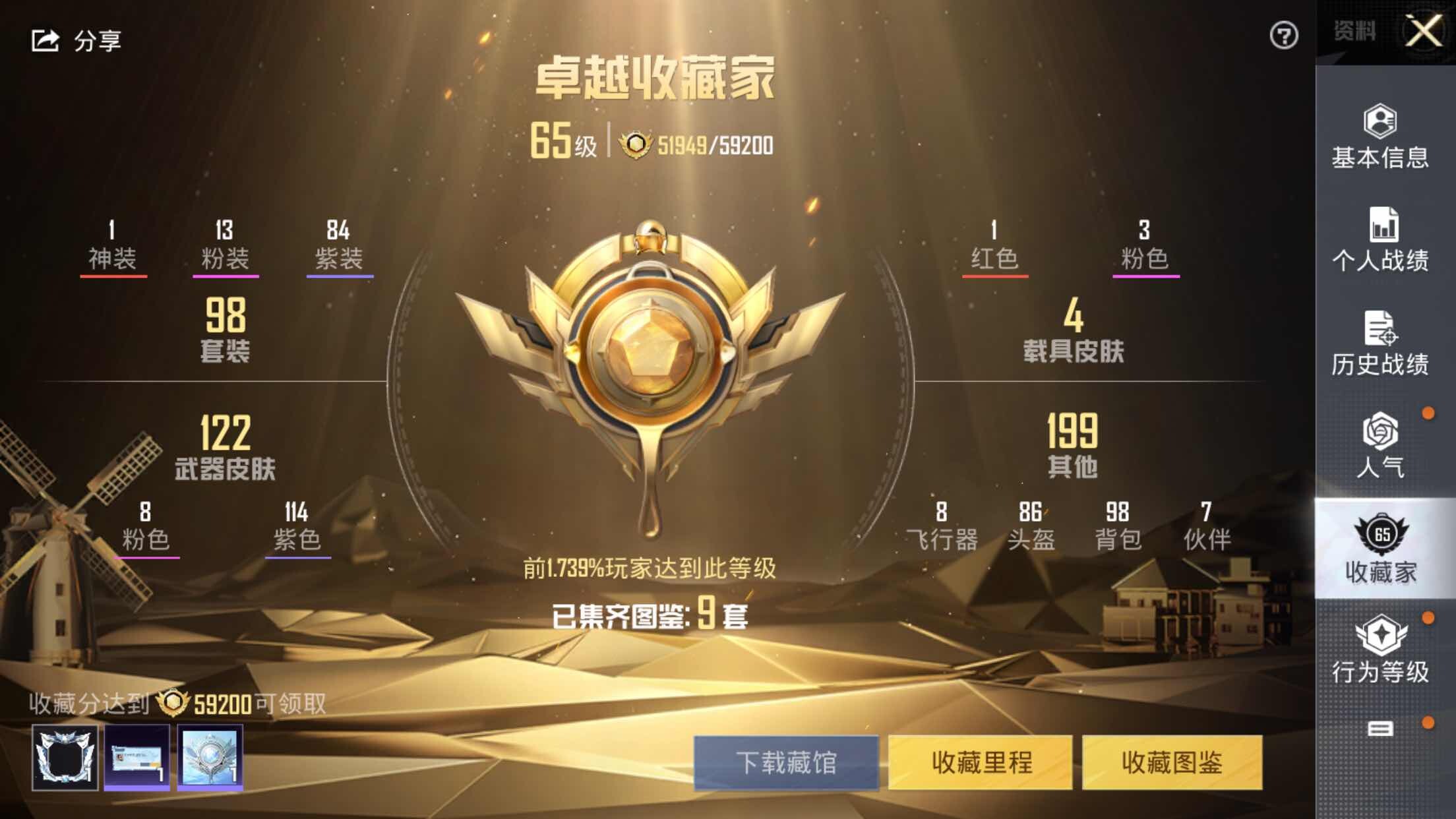 1神装-13粉装-8特效枪-4载具-5粉色飞行器-57935热力值-8王牌印记-98套装-132枪皮