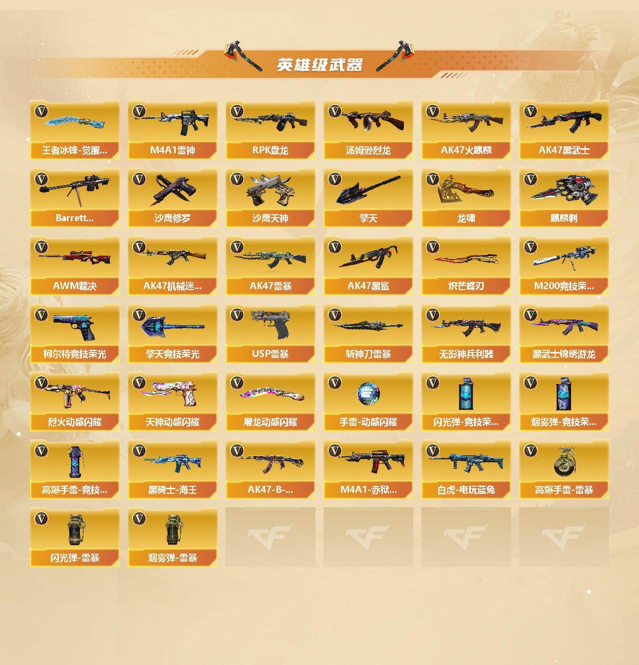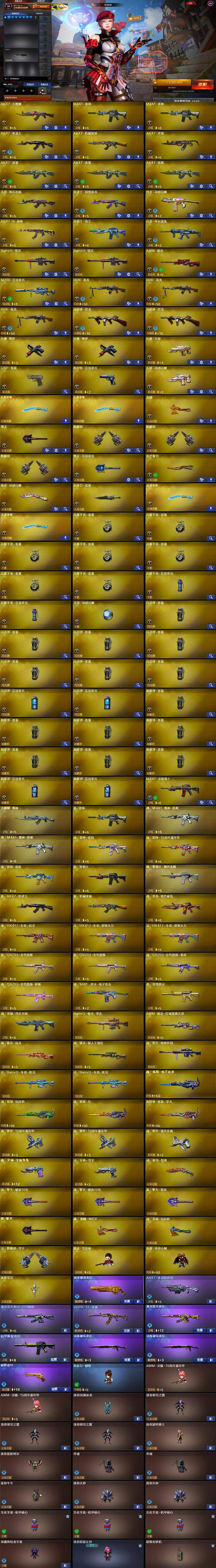 【热门武器】:M200-竞技荣光,白虎-电玩蓝兔,炼狱-迷你小钢,汤姆逊-烈龙*2,RPK-盘龙*3,斯泰尔-蝴蝶,降世魔童,裁决-雪莉杨,USP-雷暴,沙鹰-修罗*2,炽芒蝶刃