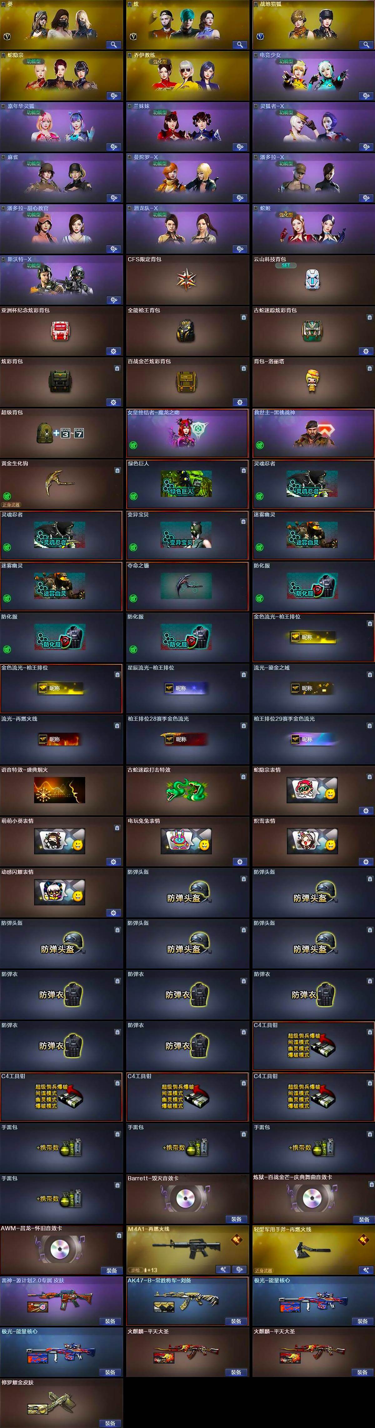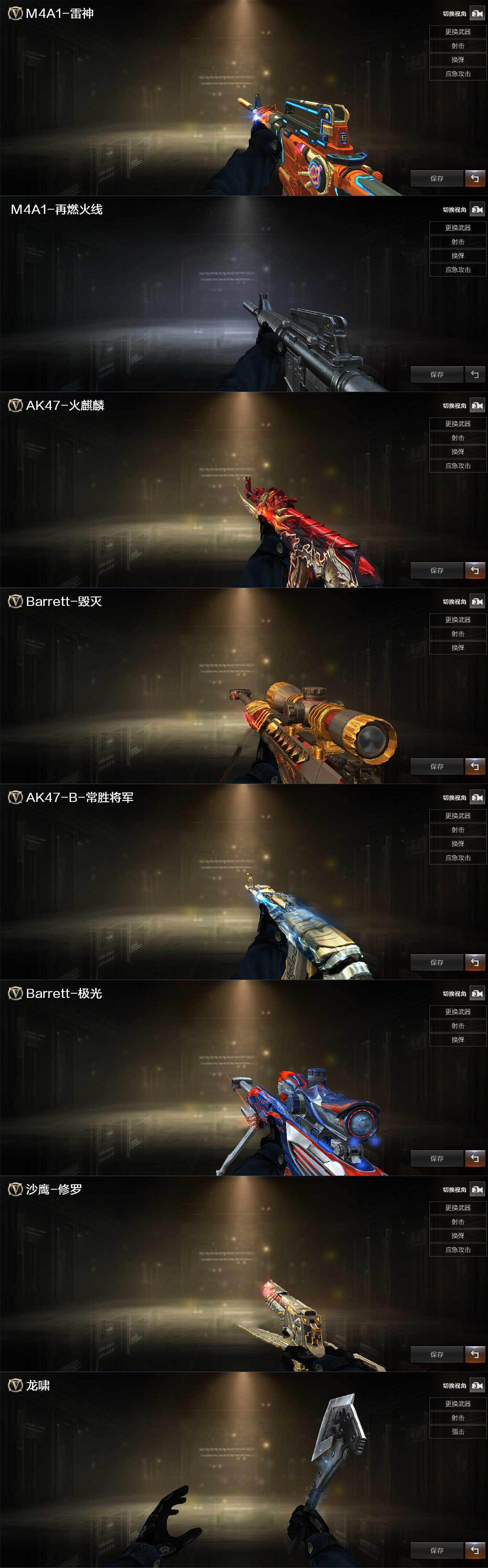 【皮肤】:雷神-源计划2.0专属 皮肤,M4A1-再燃火线,火麒麟-平天大圣*2,毁灭-英雄计划 皮肤,AK47-B-常胜将军-刘备,极光-能量核心*2,修罗耀金皮肤,轻型军用手斧-再燃火线