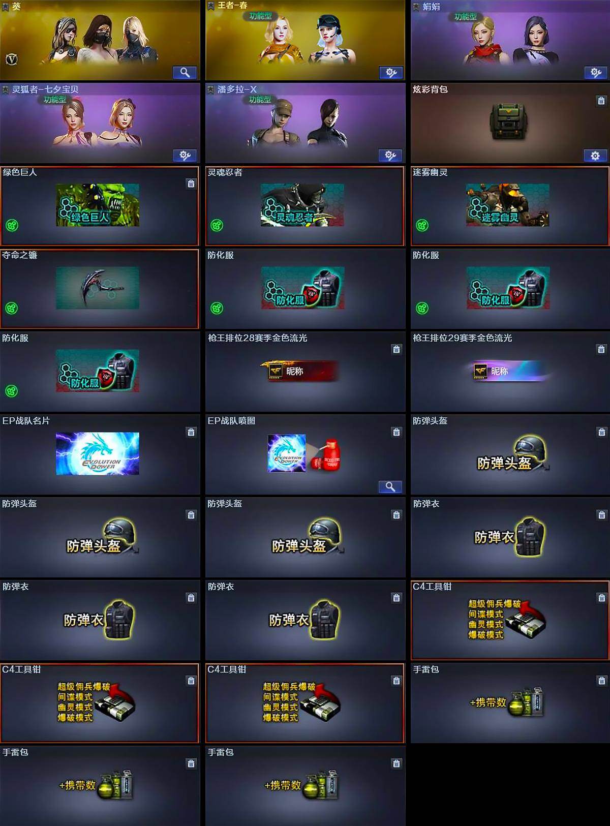 【道具】:炫彩背包,绿色巨人,灵魂忍者,迷雾幽灵,夺命之镰,防化服*3,枪王排