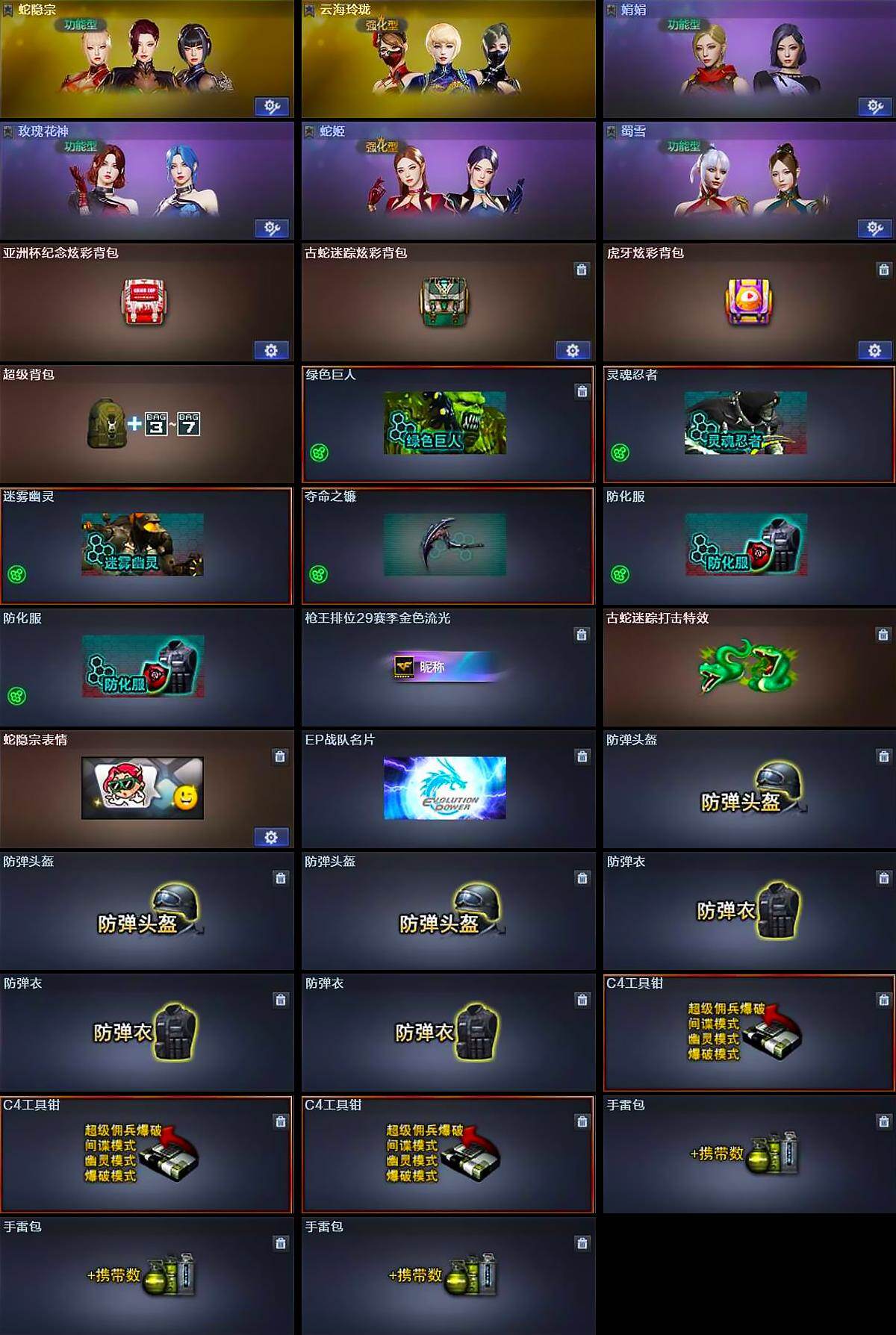 【道具】:亚洲杯纪念炫彩背包,古蛇迷踪炫彩背包,虎牙炫彩背包,超级背包,绿色巨人,灵魂忍者,迷雾幽灵,夺