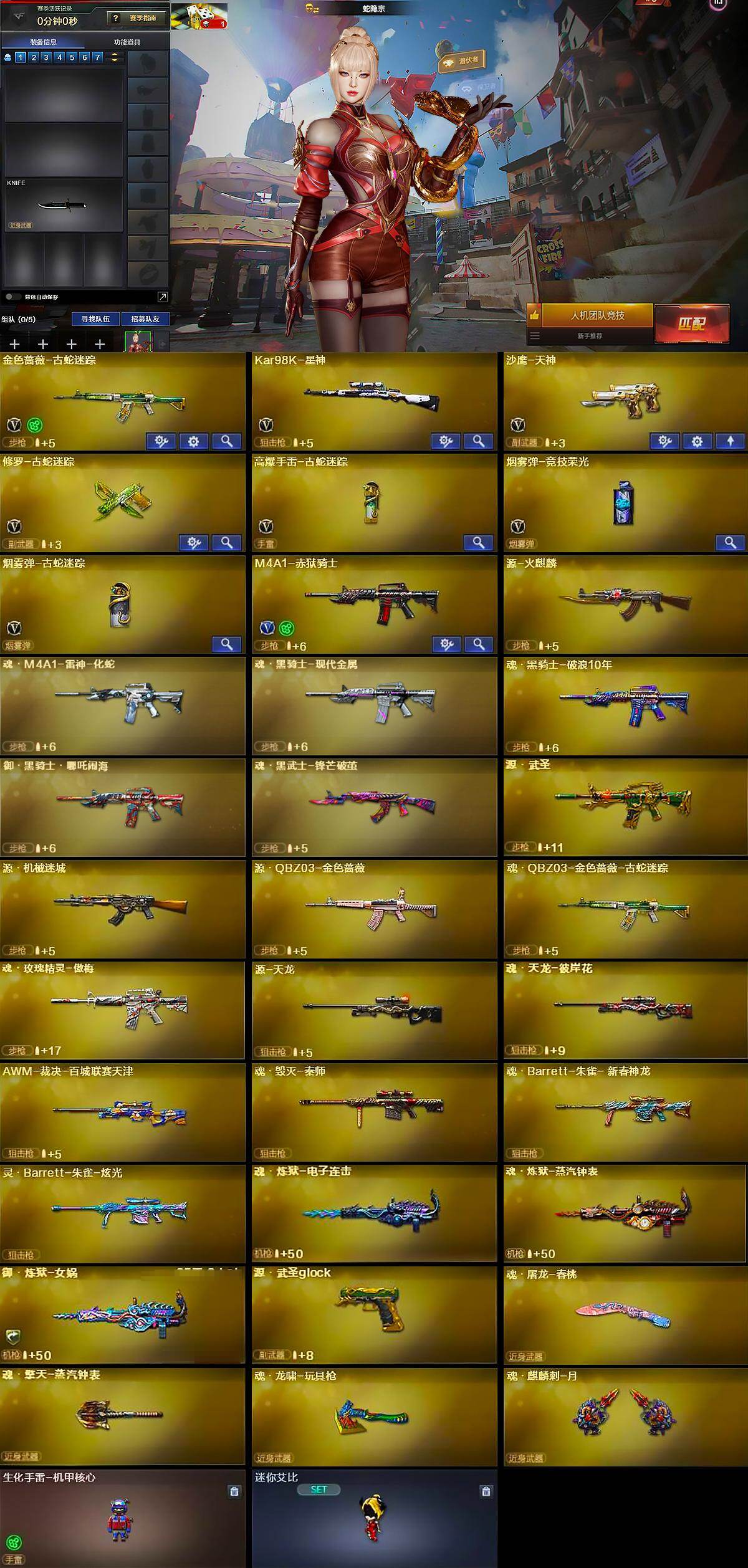 【英雄级武器】:金色蔷薇-古蛇迷踪,Kar98K-星神,沙鹰-天神,修罗-古蛇迷踪,高爆手雷-古蛇迷踪,烟雾弹-竞技荣光,烟雾弹-古蛇迷踪,M4A1-赤狱骑士