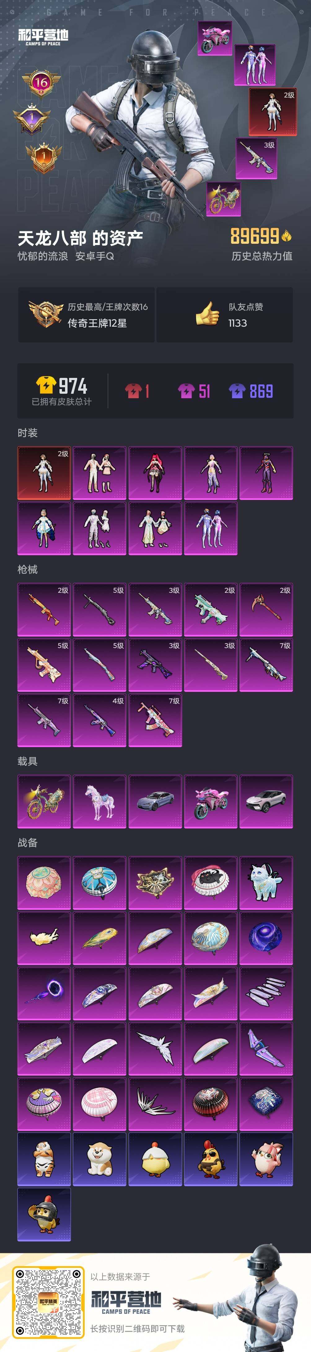 【店主推荐捡漏号!可直接换绑】安卓 手Q-1神装-8粉装-13特效枪-5载具-7粉色飞行器-89699热力值-16王牌印记-174套装-259枪皮【红色神装等级】:镜域双华-欧若拉(二级)【红色角色神装】:镜域双华-欧若拉【热门品类】:粉装-梦幻火箭,套装-深海小丑鱼,套装-小丑鱼,套装-龟仙人,套装-粉红小猪,角色-8号机,角色-Mark.06【粉色套装】:粉装-梦幻火箭,角色-洛天依,粉装-