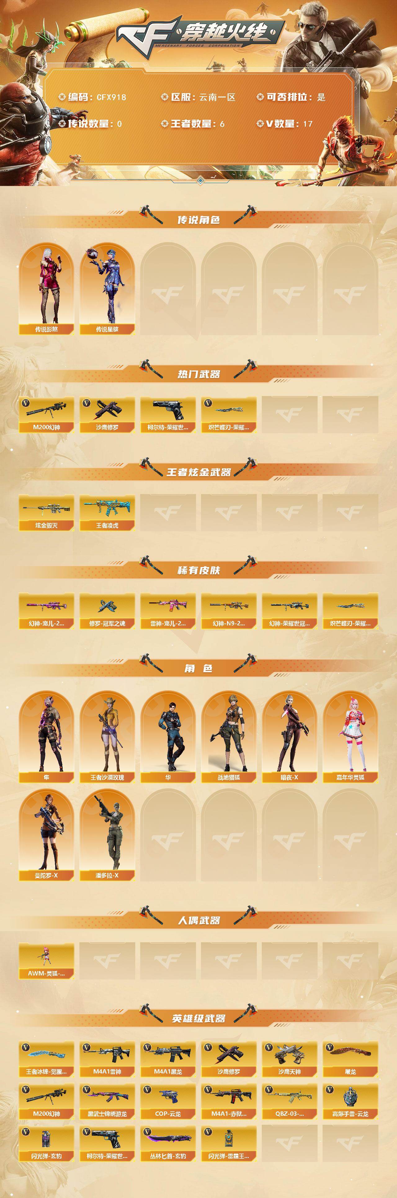 【CFX918】14V/100级/元帅/6王者/1炫金/3英雄/传说星骇/传说影煞/M200_幻神/柯尔特-荣耀世冠白鲨2023/沙鹰_修罗/炽芒蝶刃-荣耀世冠白鲨2023 皮肤/王者凌虎/炫金毁灭/幻神-宠儿-2021MVP/M200-幻神-N9-2022MVP/幻神-荣耀世冠白鲨2023 皮肤/雷神-宠儿-2019MVP/修罗-冠军之魂/隼/华/战地猎狐/王者沙漠玫瑰/暗夜-X/嘉年华灵狐/曼陀罗-X/潘多拉-X/AWM-灵狐-15周年嘉年华/M4A1_黑龙/M4A1_雷神/黑武士-锦绣游龙