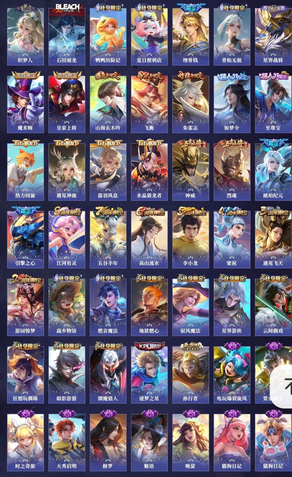 贵族7 荣耀典藏1 珍品传说1 传说皮肤11 史诗皮肤89 皮肤数量337