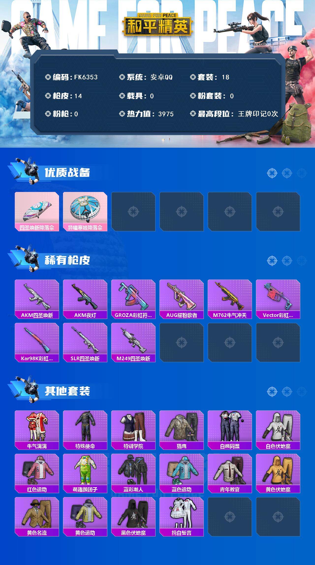 【FK6353】18套装/装备14/战备21/热力值3975/四圣焕新降落伞/异瞳寒姬降落伞/AKM-四圣焕新/AKM-夜灯/GROZA-彩虹符号/AUG-耀粉歌者/M762-牛气冲天/Vector-彩虹符号/Kar98K-彩虹符号/SLR-四圣焕新/M249-四圣焕新/牛气满满/特殊使命/特训学院/猎鹰/白熊同盟/白色伏地魔/红色运动/萌趣颜团子/蓝彩潮人/蓝色运动/青年教官/黄色伏地魔/黄色
