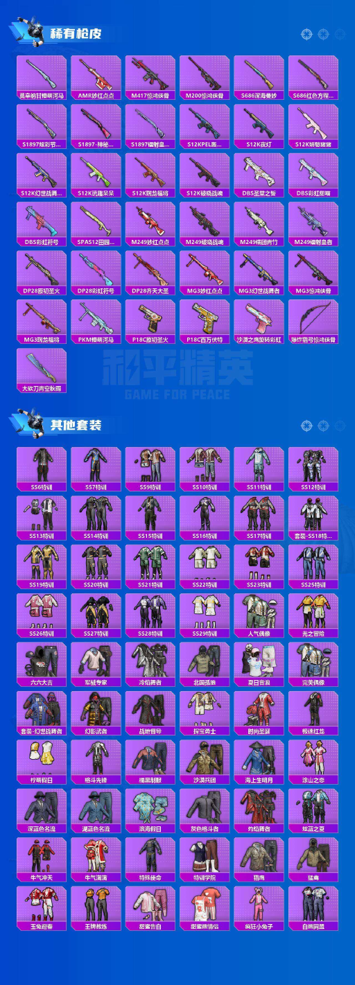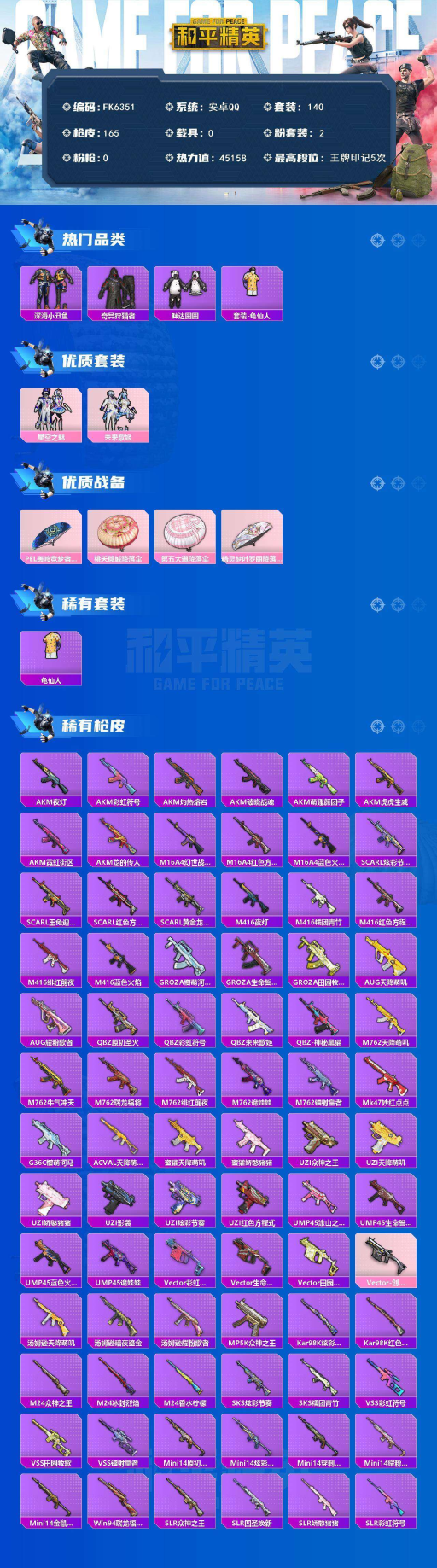 材号-双字ID-伞苒 套装-深海小丑鱼,套装-奇异狩猎者,套装-胖达圆圆,粉装-星空之魅,粉装-未来歌姬-安卓 手Q-2粉装-0特效枪-0载具-0粉色飞行器-45158热力值-5王牌印记-140套装-165枪皮 【热门品类】:套装-深海小丑鱼,套装-奇异狩猎者,套装-胖达圆圆,套装-龟仙人 【粉色套装】:粉装-星空之魅,粉装-未来歌姬 【粉色降落伞】:PEL轰鸣竞梦者降落伞,桃