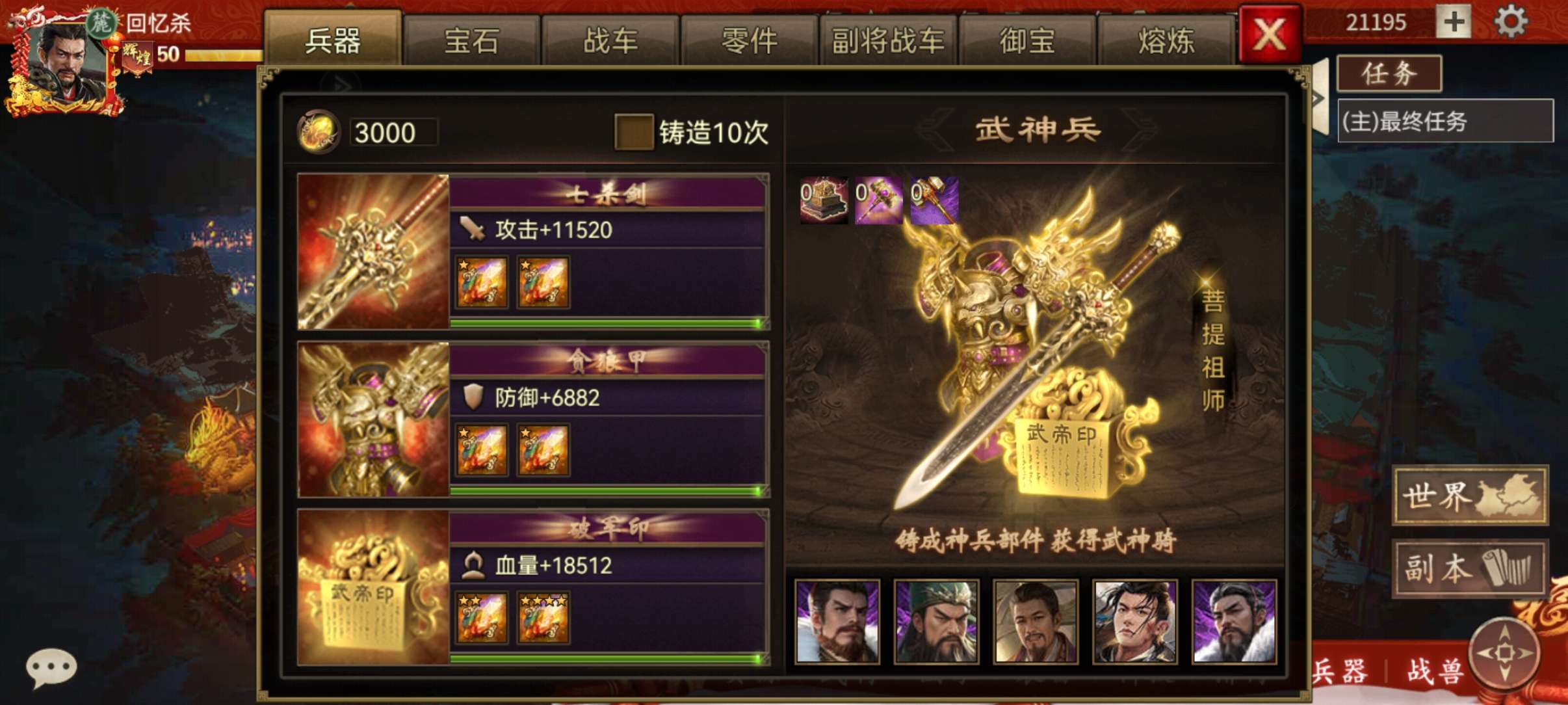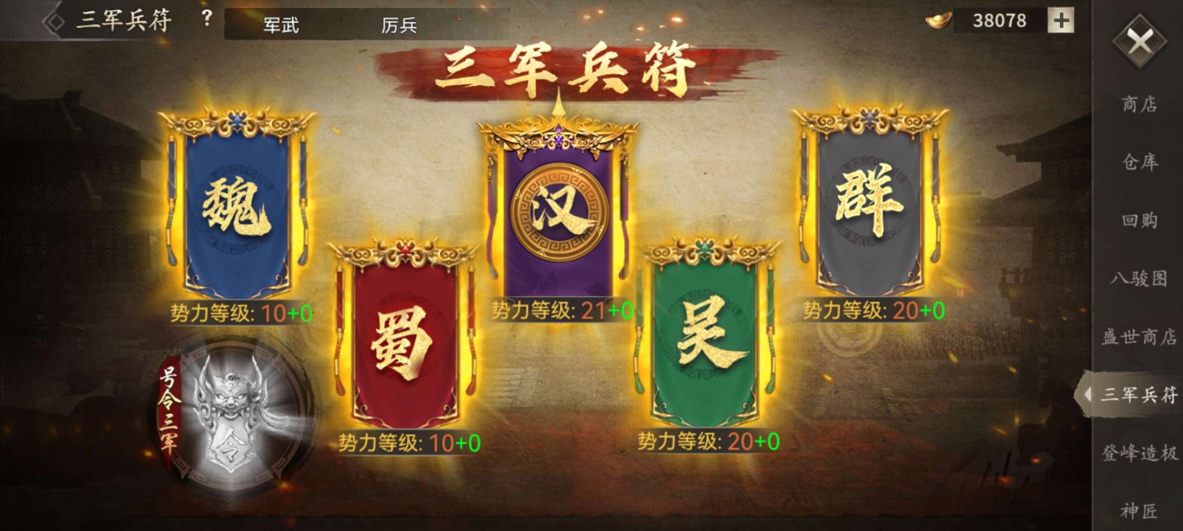 看图,满配皇帝68万,6.3层武圣,有鼎,有将军令,麒麟,金龙,1车辉煌3级差20%进度,汉旗等等