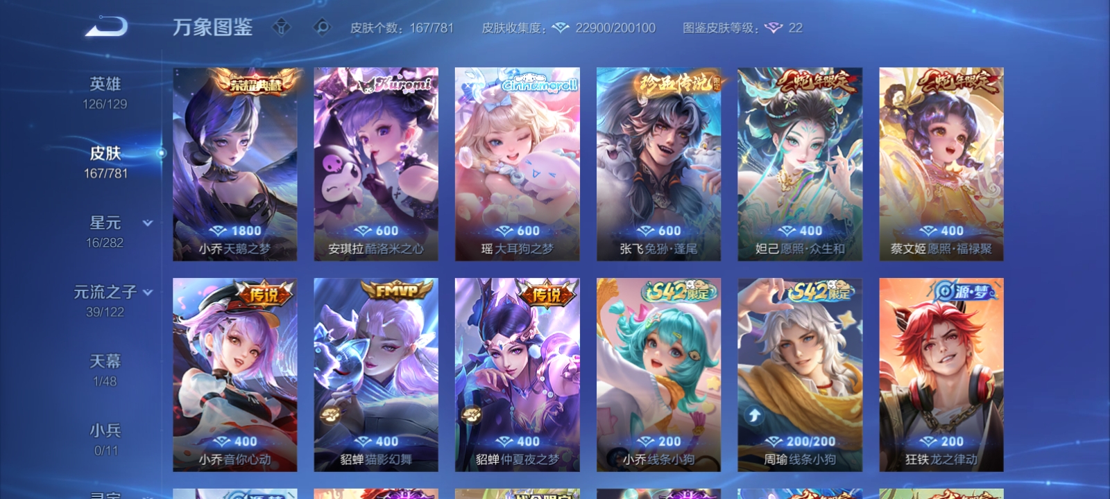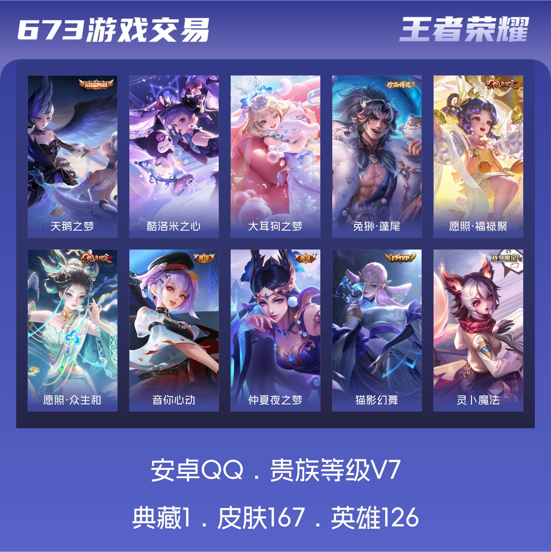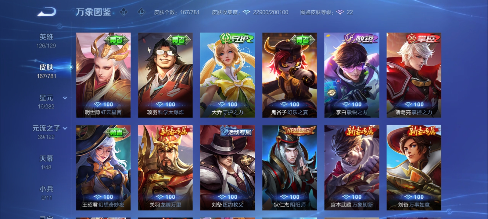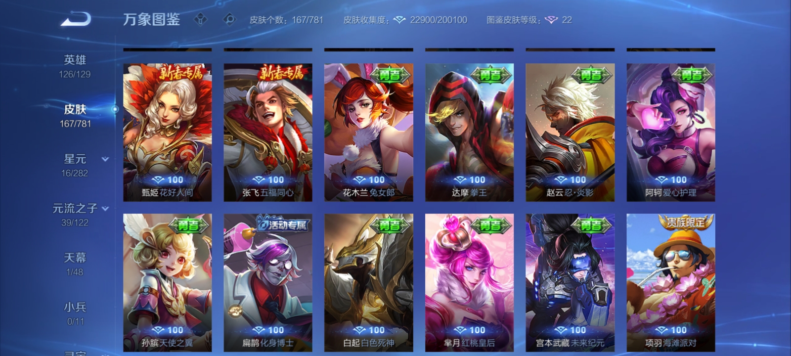 V7 皮肤167 英雄126 荣耀黄金 荣耀典藏1 珍品传说3 星传说1 传说5 其他皮肤163