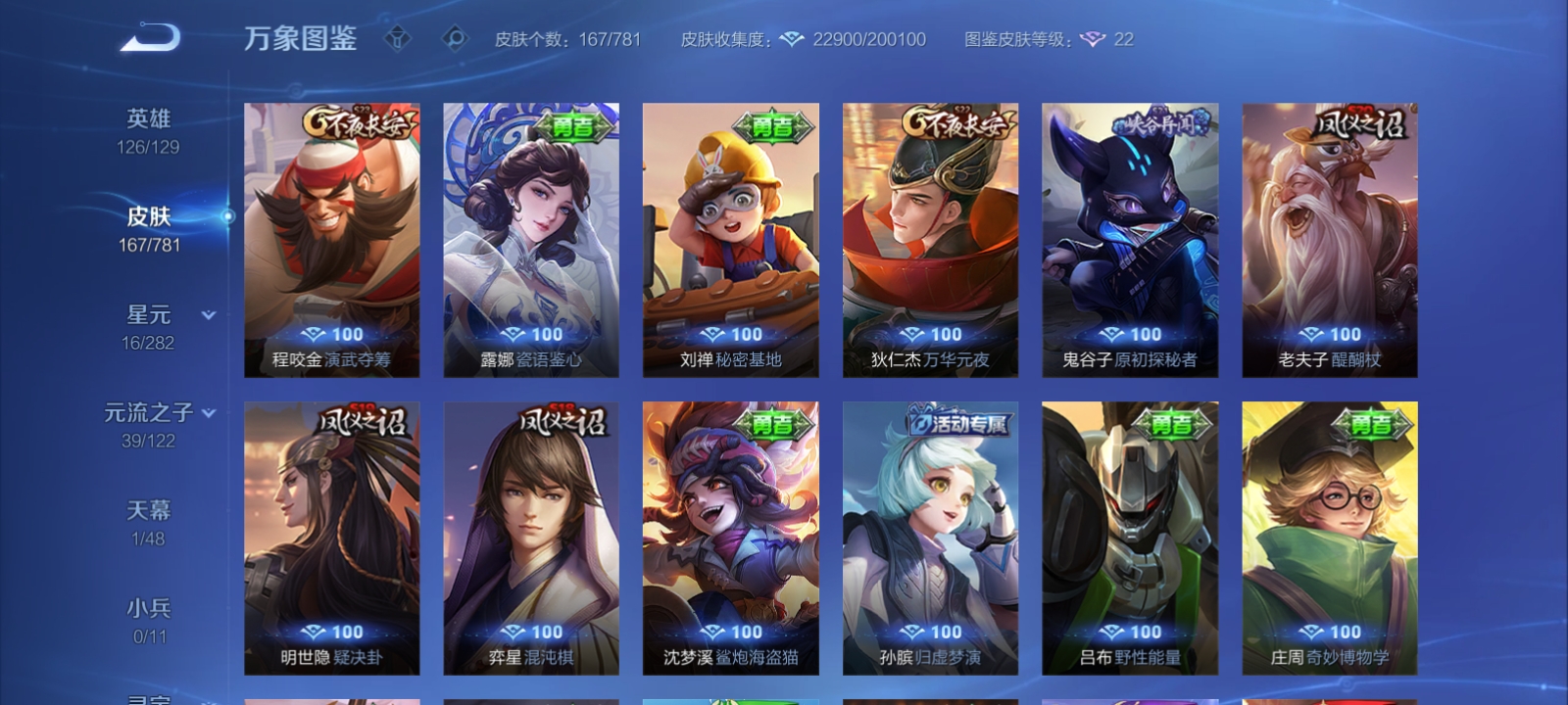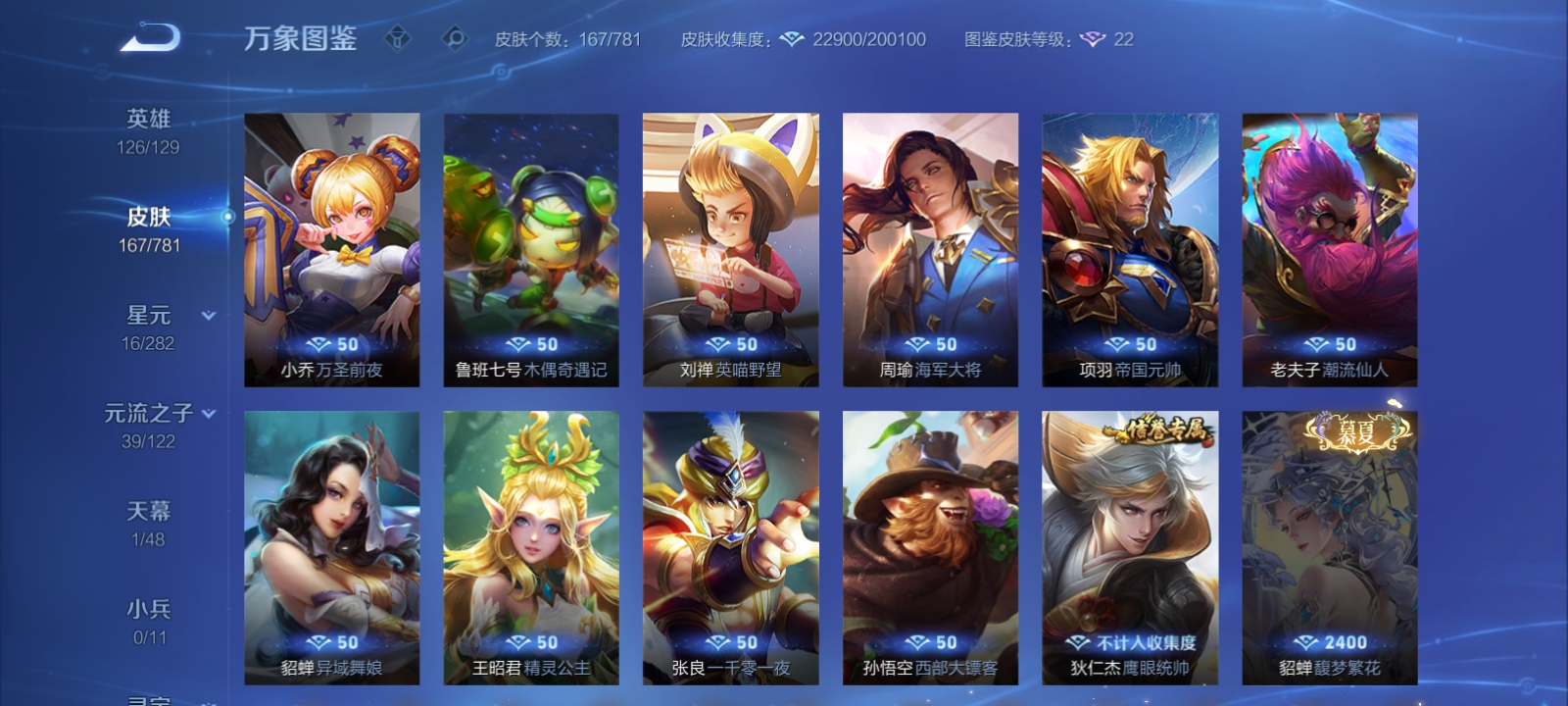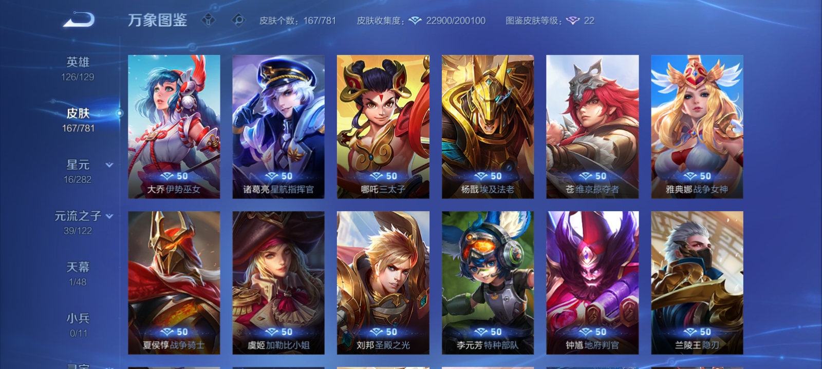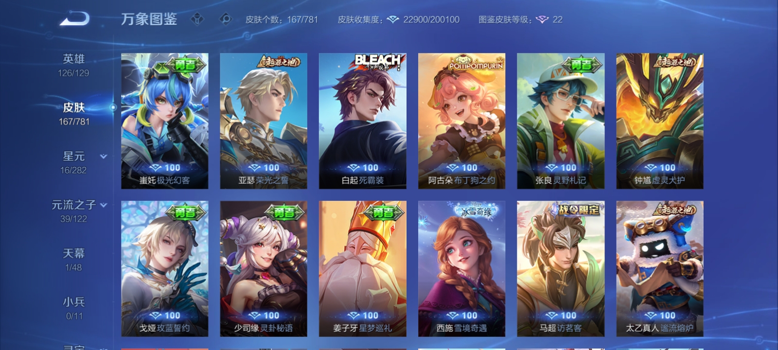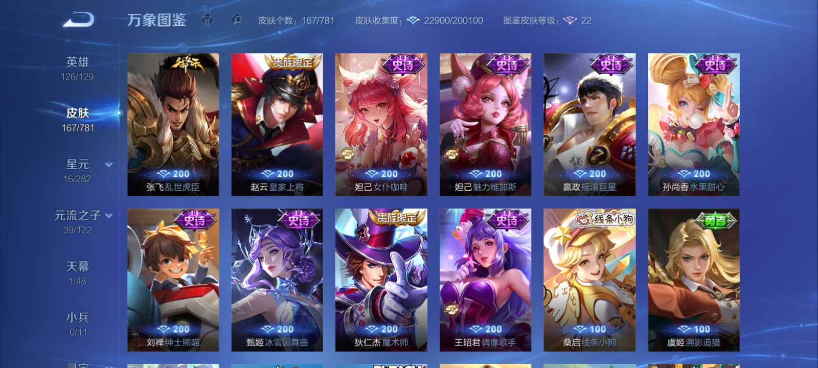 V7 皮肤167 英雄126 荣耀黄金 荣耀典藏1 珍品传说3 星传说1 传说5 其他皮肤163