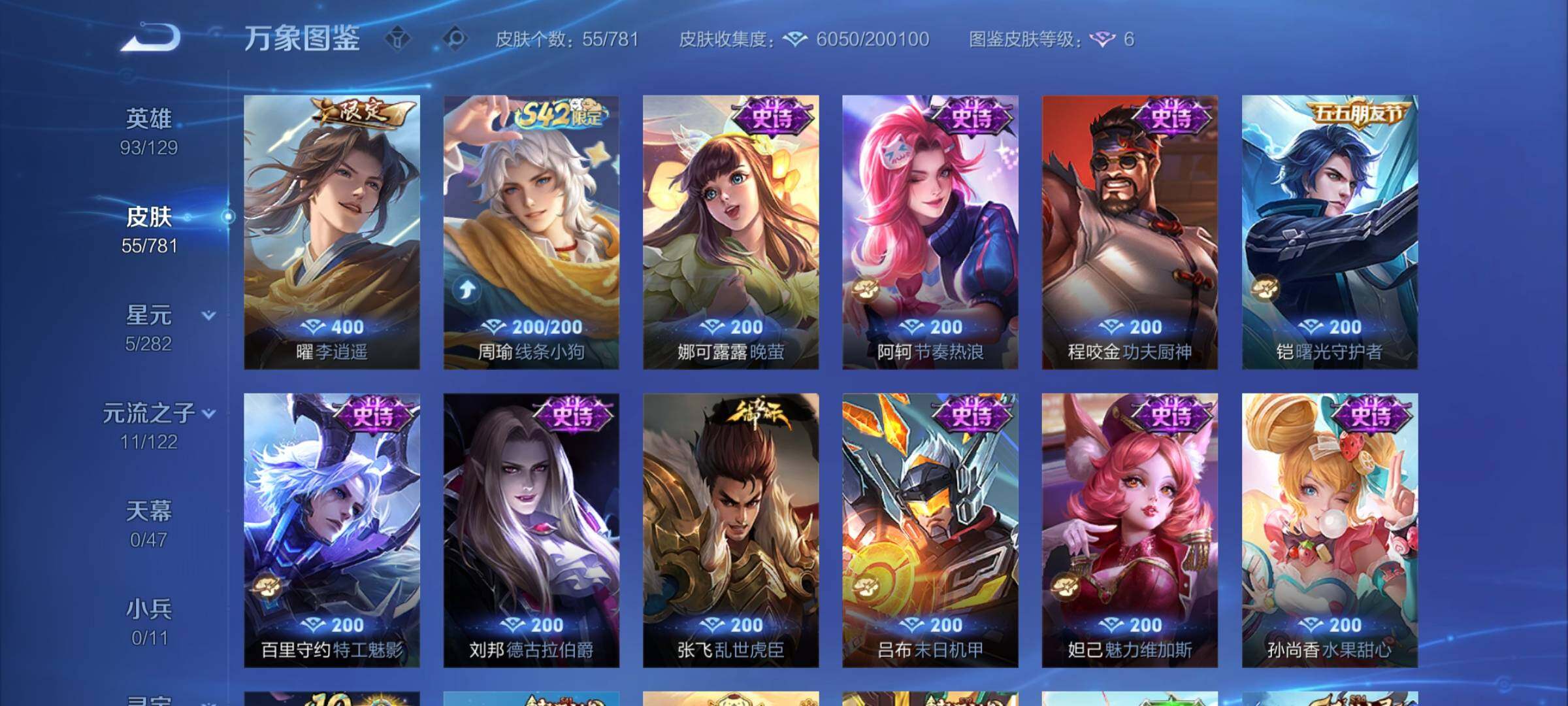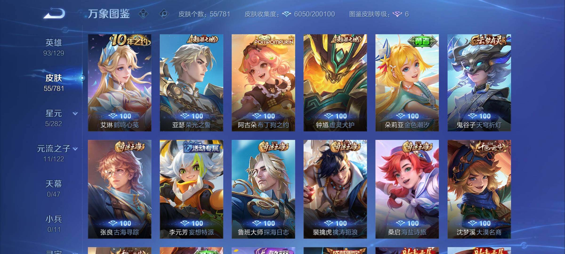 【传说皮肤】:曜李逍遥 【限定皮肤】:狄仁杰阴阳师,项羽海滩派对,兰陵王金庭之子,沈梦溪大漠名商,裴擒虎擒涛扼浪,曜李逍遥 ,鲁班大师探海日志,桑启海盐诗旅,张良古海寻踪,鬼谷子天穹祈灯【赛季限定】:兰陵王金庭之子,沈梦溪大漠名商,桑启海盐