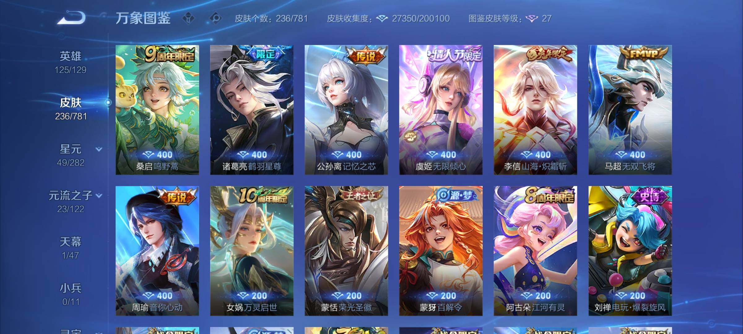 【传说皮肤】:桑启鸣野蒿,诸葛亮鹤羽星尊,公孙离记忆之芯,虞姬无限倾心,李信山海炽霜斩,马超无双飞将,周瑜音你心动【限定皮肤】:姜子牙天穹之誓,狄仁杰阴阳师,赵云皇家上将,墨