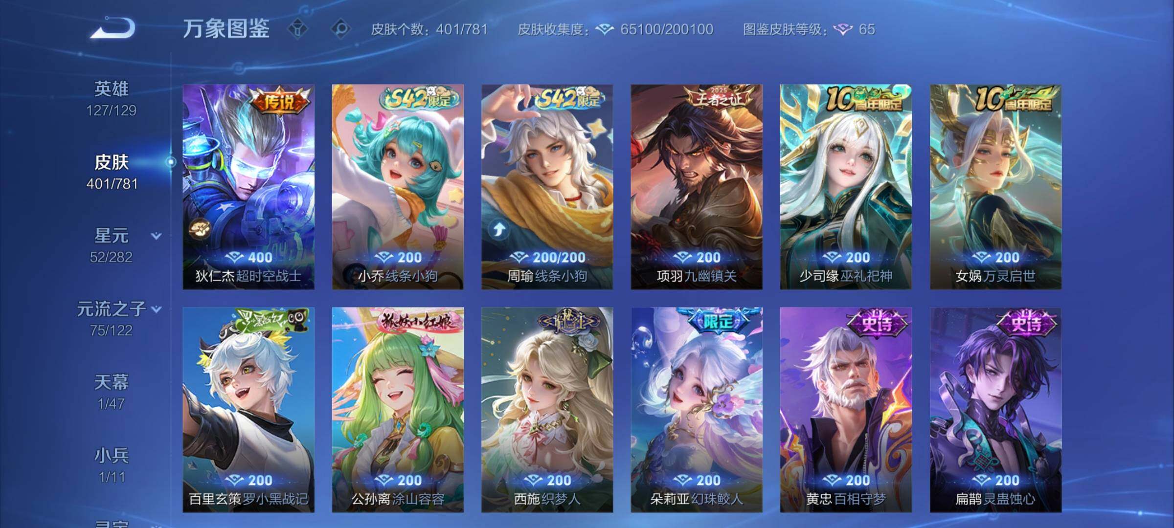 可换绑【V9高质量特色传说精品号·韩信小乔无双·小乔典藏·黄金射手座·霜北刀·马年朵莉亚·情人节吕布貂蝉·马超铠琥珀纪元·夜礼服假面·永恒水手月亮·大乔时之奇旅·浮生妄·燃星之曲·枫霜尽·天魔缭乱·龙年全套·雪境奇遇小兵·贵族积分13万】5657星币 2星传说,43按键,1小兵,2灵宝,9王者印记,170五级铭文,可二次BX4741,安卓Q-V9-401皮肤-1