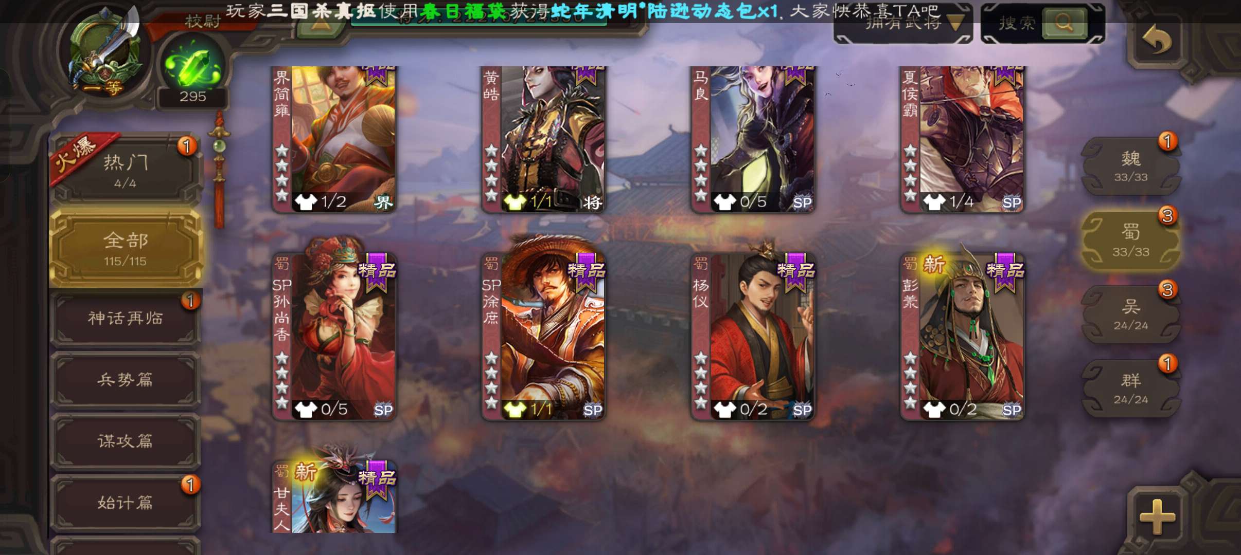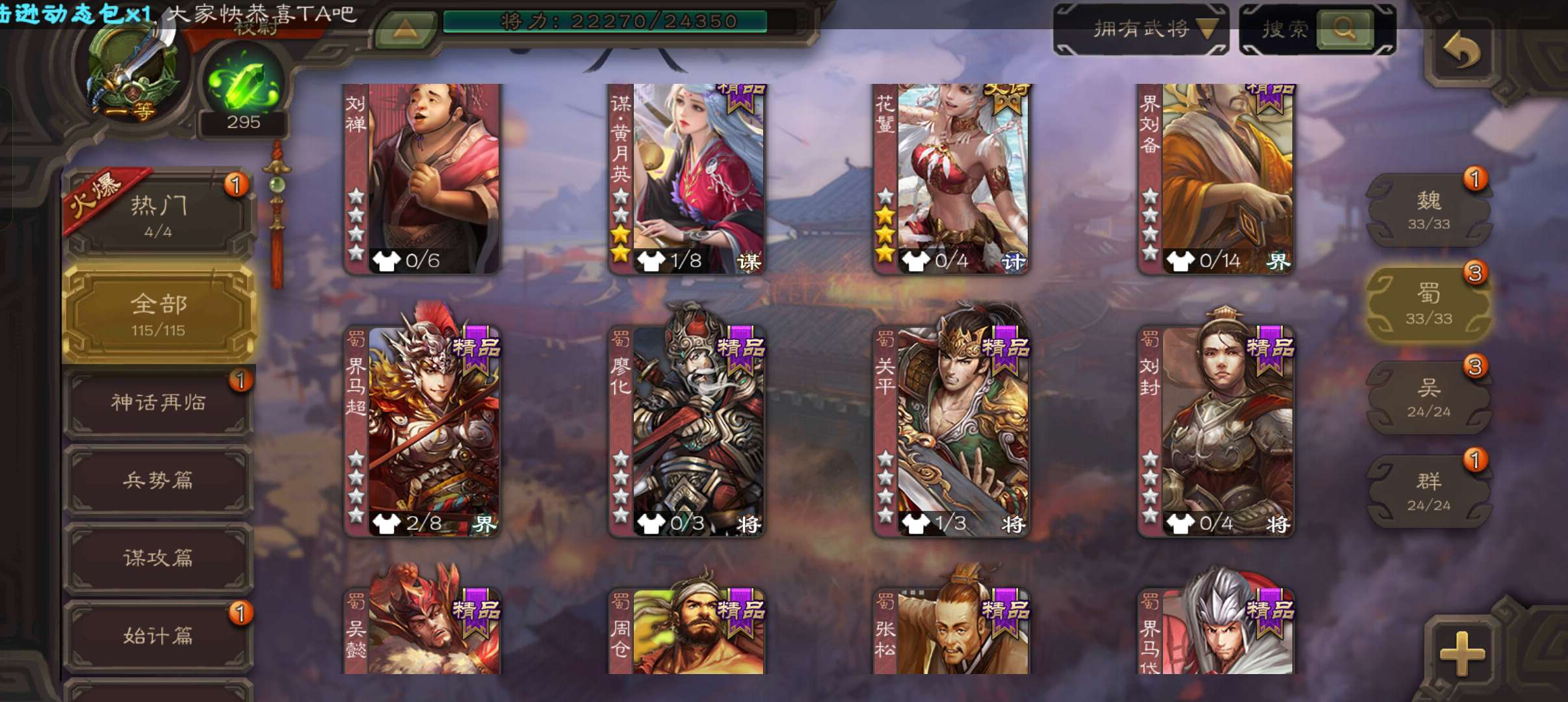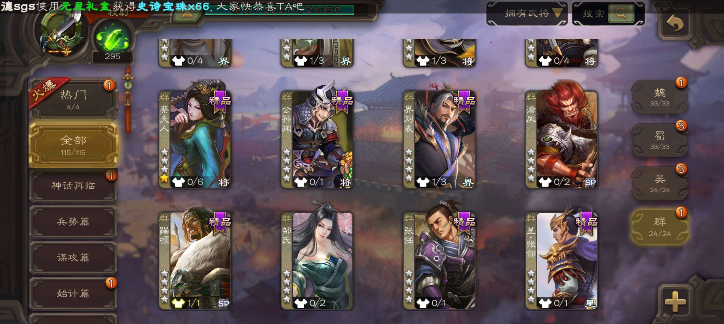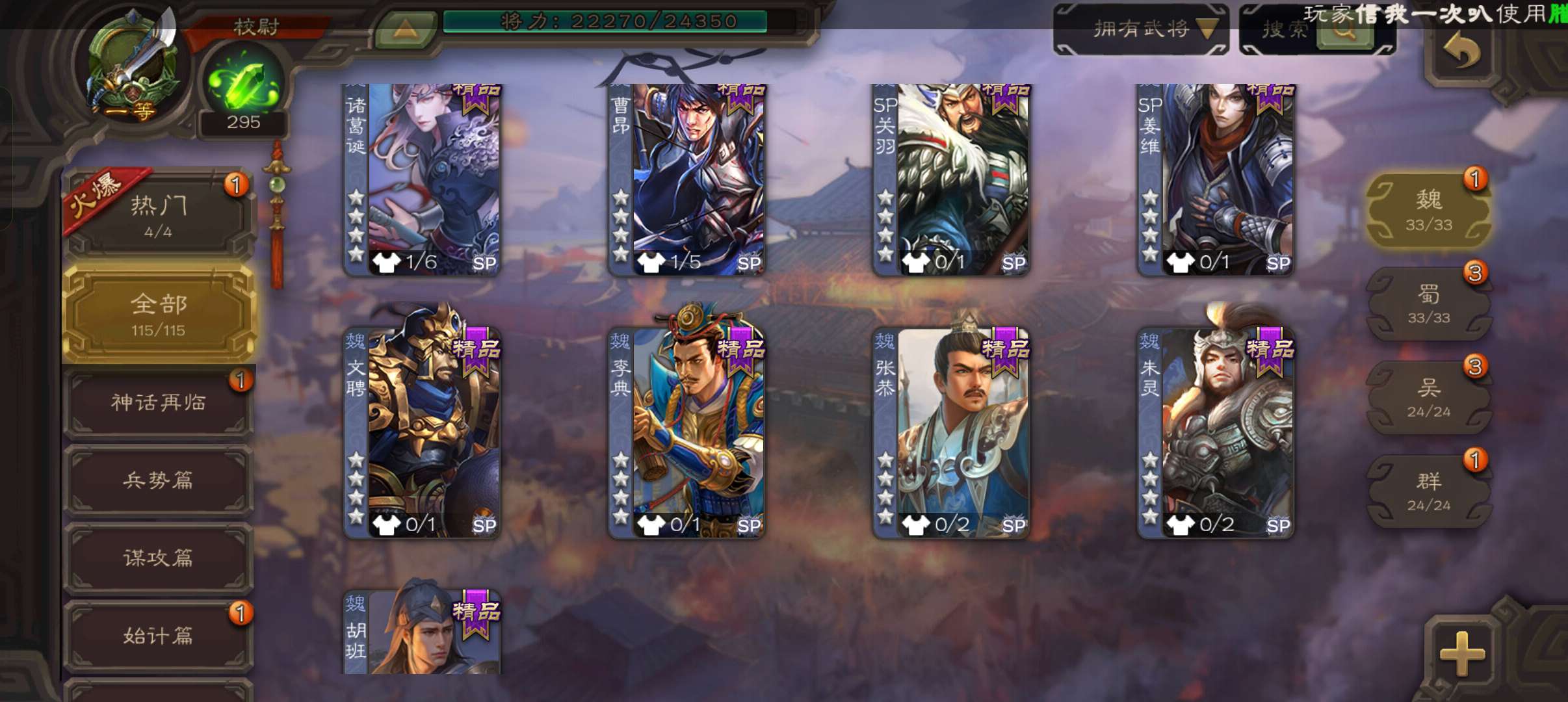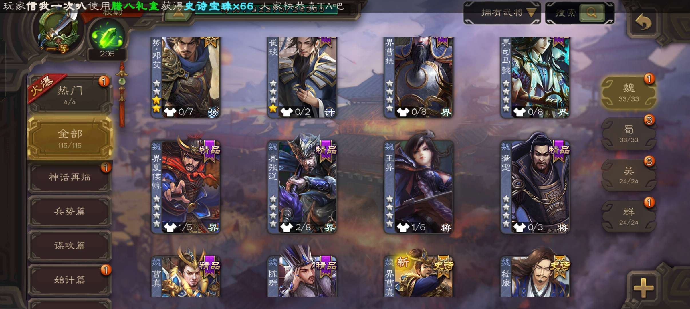 天工谋黄月英,势邓艾花鬘界曹真神张辽嵇康贺齐左慈7史诗一等校尉,甘夫人崔琰谋陈宫115将