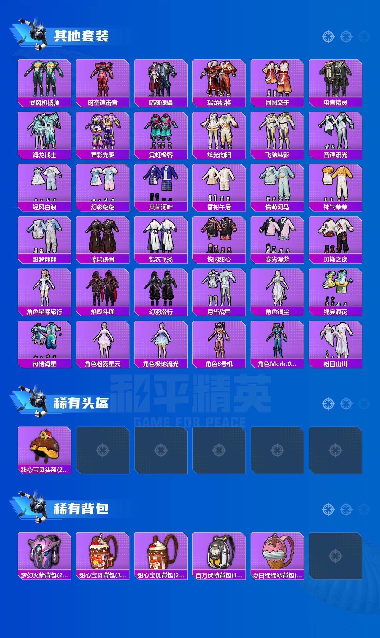 【粉色套装】:粉装-碧影闪光,粉装-第五大道,粉装-瑰丽时代,角色-呆萌星弥,角色-小可学妹,角色-圣堂之誓,角色-小叽联名款,角色-星梦奇缘,角色-千金淑猫,角色-绯穹魔姬,角色-镜中