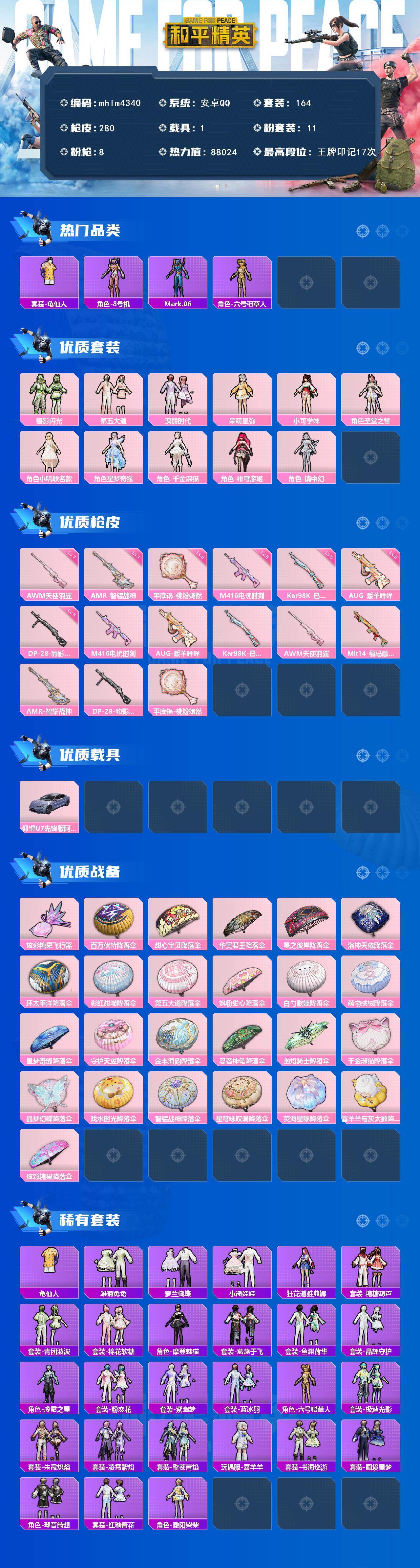【mhlm4340】安卓 手Q-11粉装-8特效枪-1载具-1粉色飞行器-88024热力值-17王牌印记-164套装-280枪皮