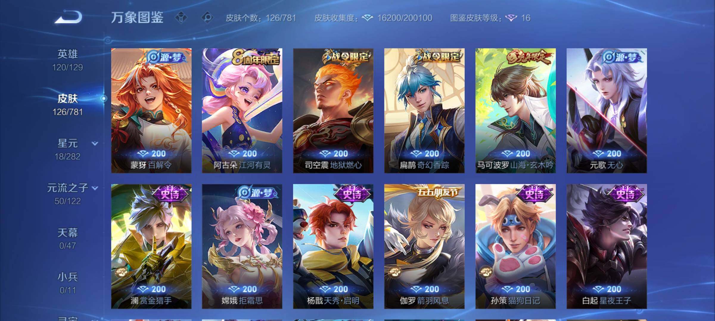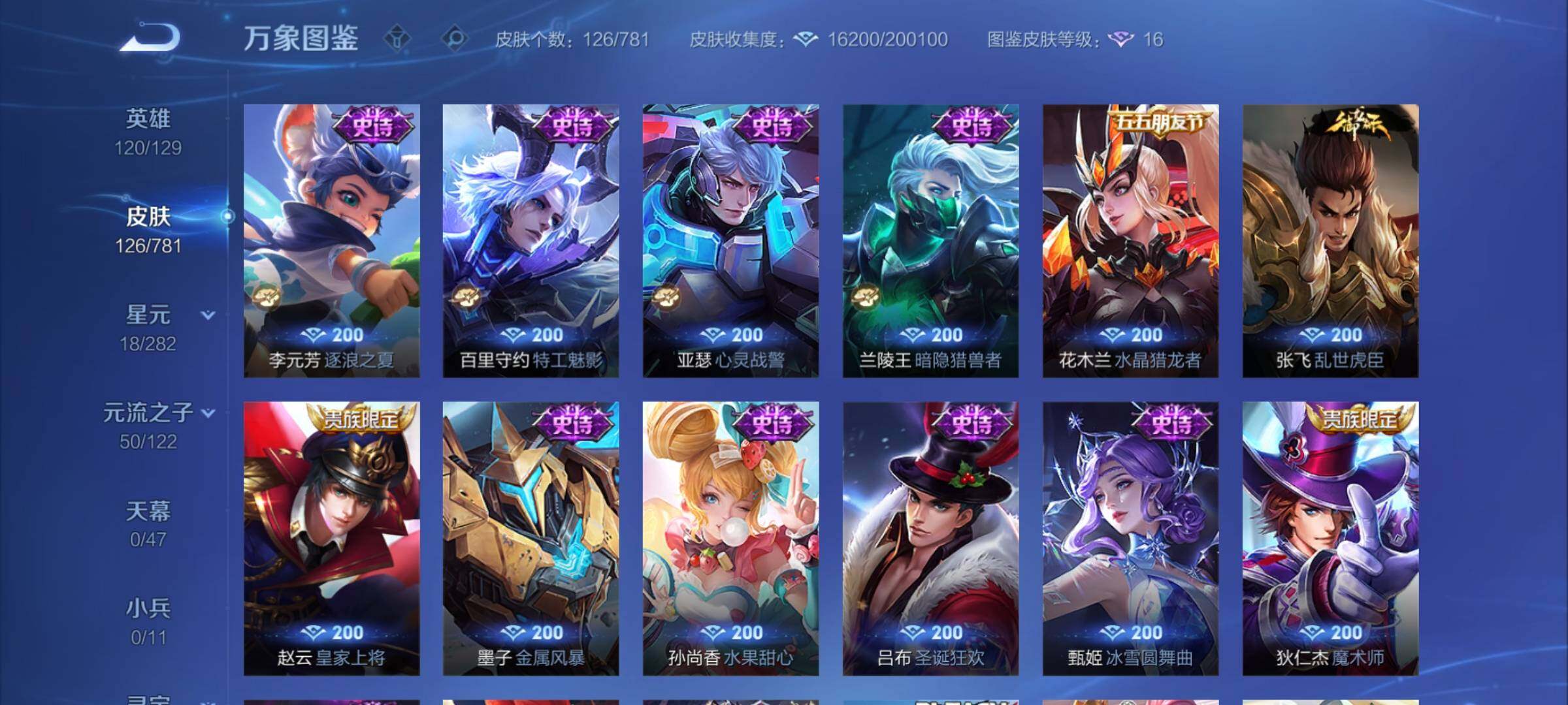 【英雄全皮】:影全皮【传说皮肤】:澜愿照九州拓,虞姬愿照岁时盈,云缨幻光神枪,桑启鸣野蒿,后羿黄金射手座【限定皮肤】:狄仁杰阴阳师,赵云皇家上将,高渐离玩趣恶龙,扁鹊奇幻香踪,元歌无心,马可波罗山海玄木吟,狄仁杰魔术师,达
