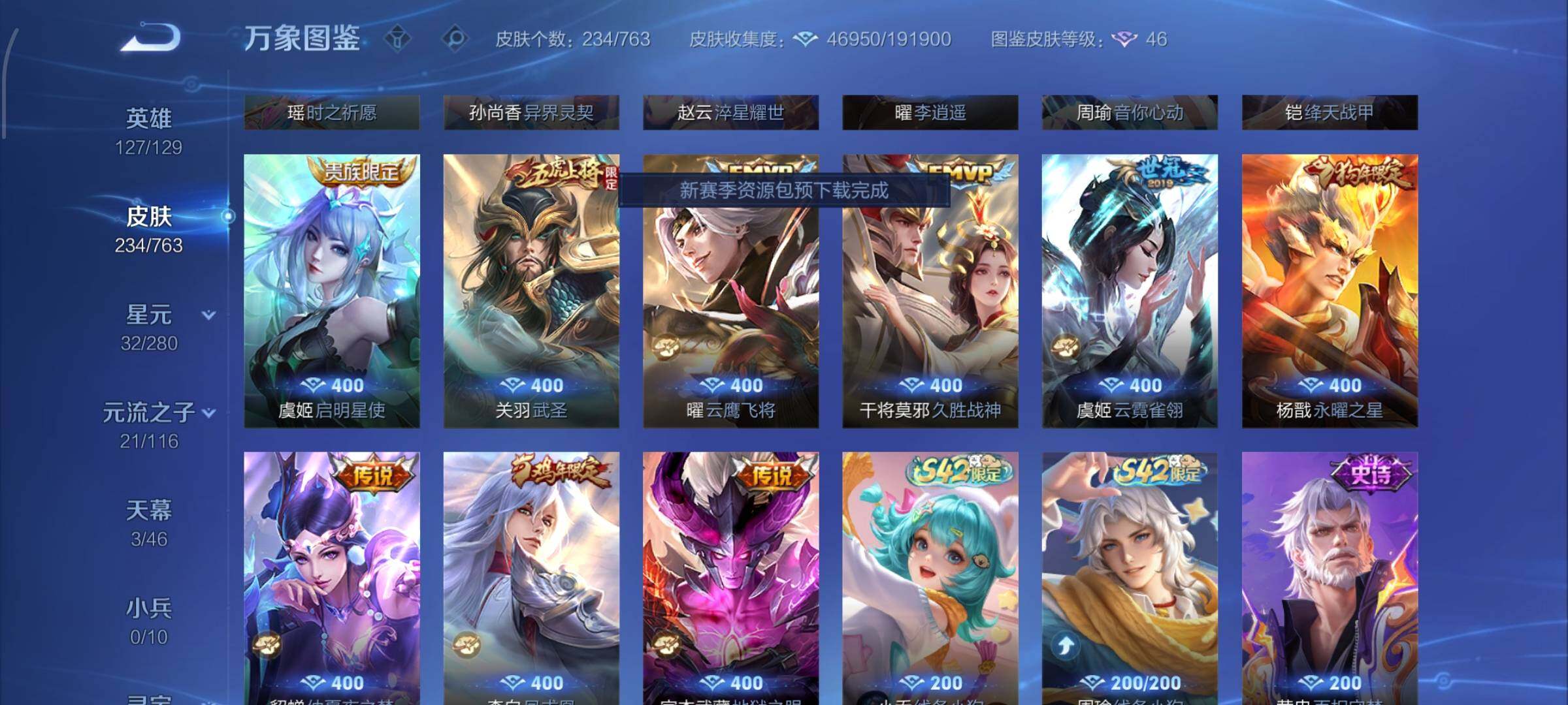 【极品带妹打野号·无尽之约天幕·秋月华灯天幕·青丘九尾·千魇归渊·全息碎影·无限飓风号·鸣剑曳影·银白咏叹调·幻阙歌·4星传说·玉鸾吟·黛羽霜翎·乘龙淬吴钩·张飞百相守梦·记忆之芯·虞姬无限倾心·项羽无限倾心·炽翼辉光·齐天大圣·山海琳琅生·山海苍雷引·山海炽霜斩·怒海麟威·时之祈愿·异界灵契·李逍遥·武圣·永曜之星·凤求凰·满兔年限定·可二次】