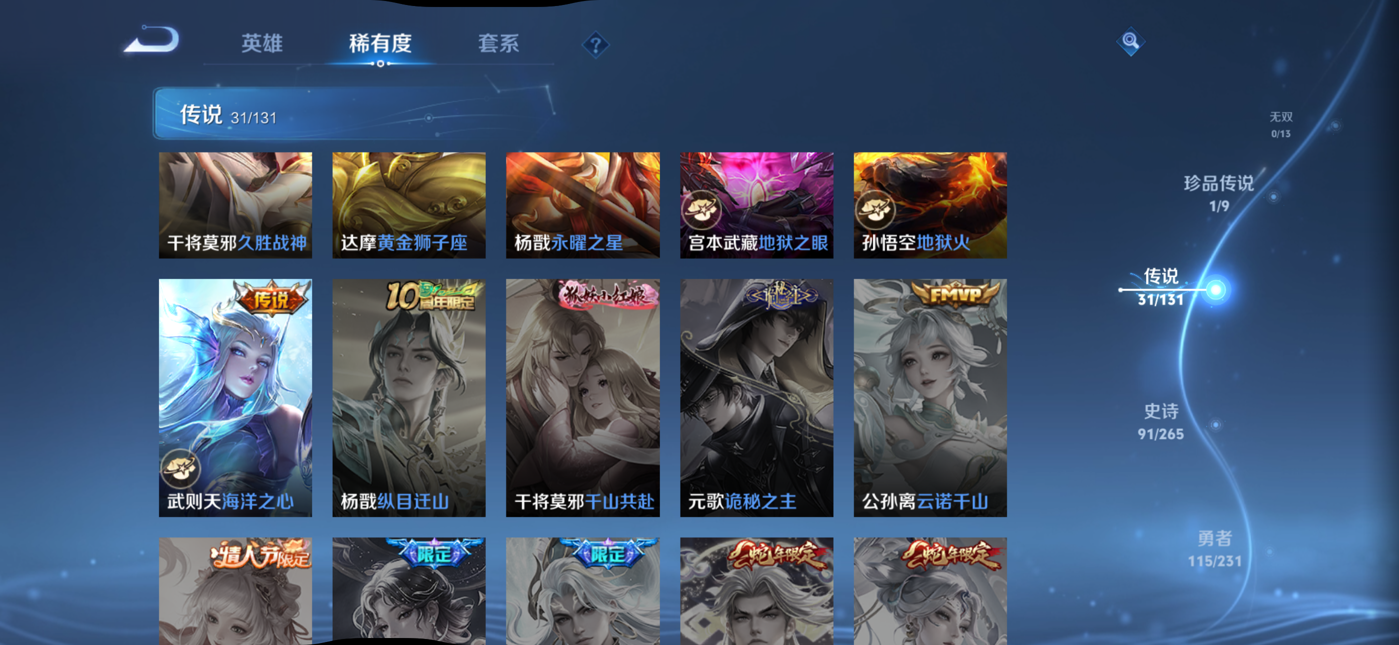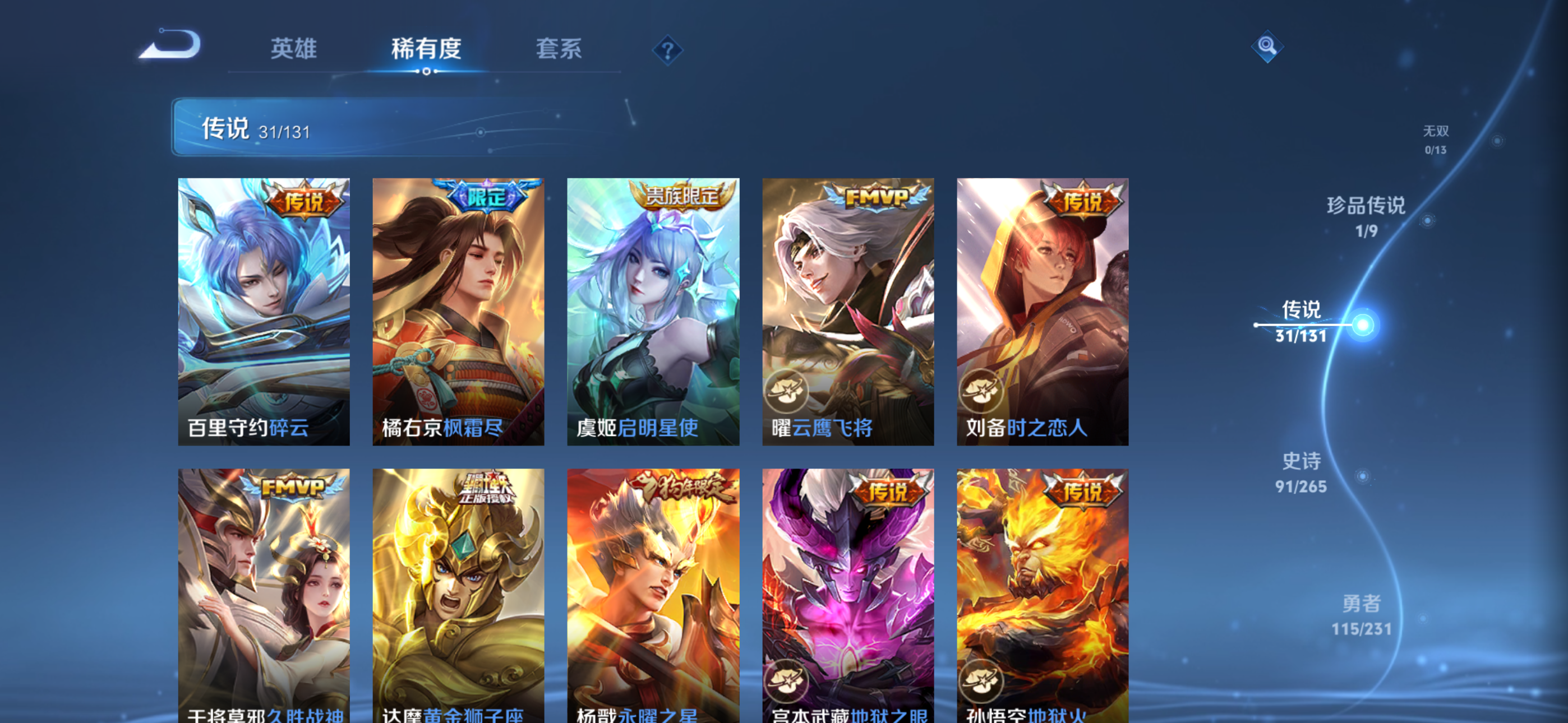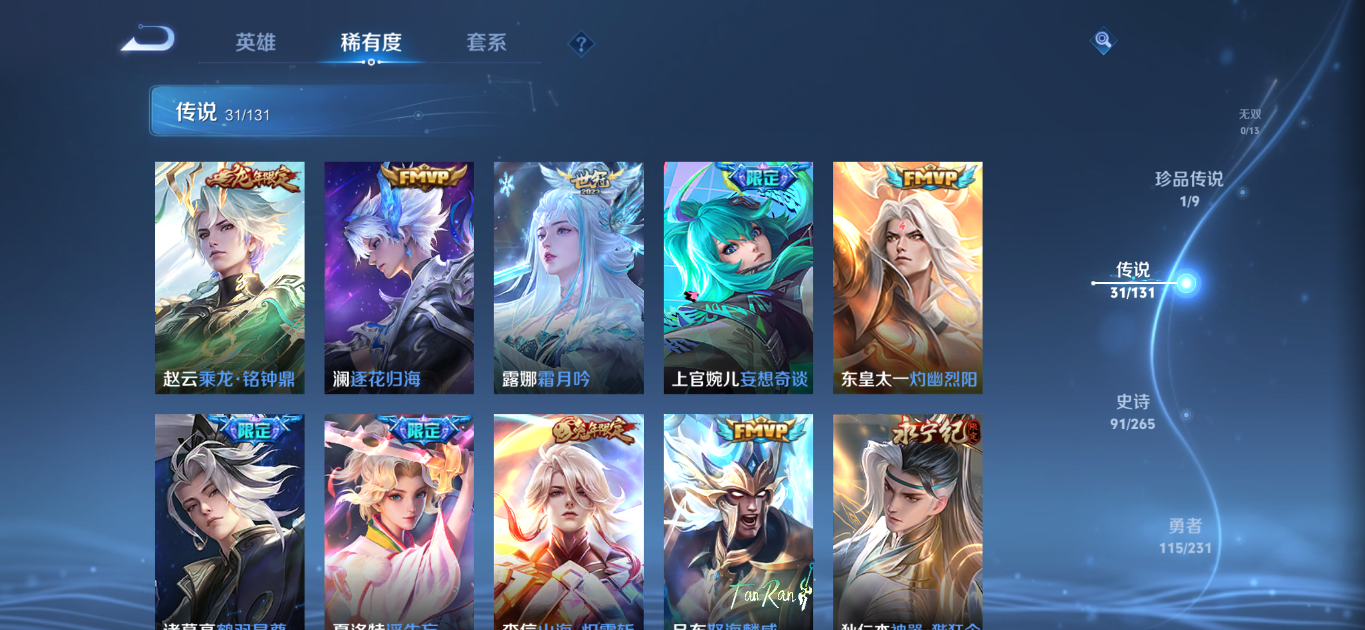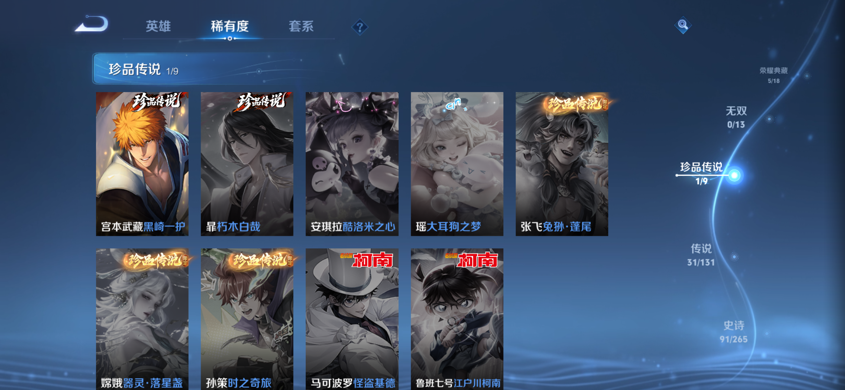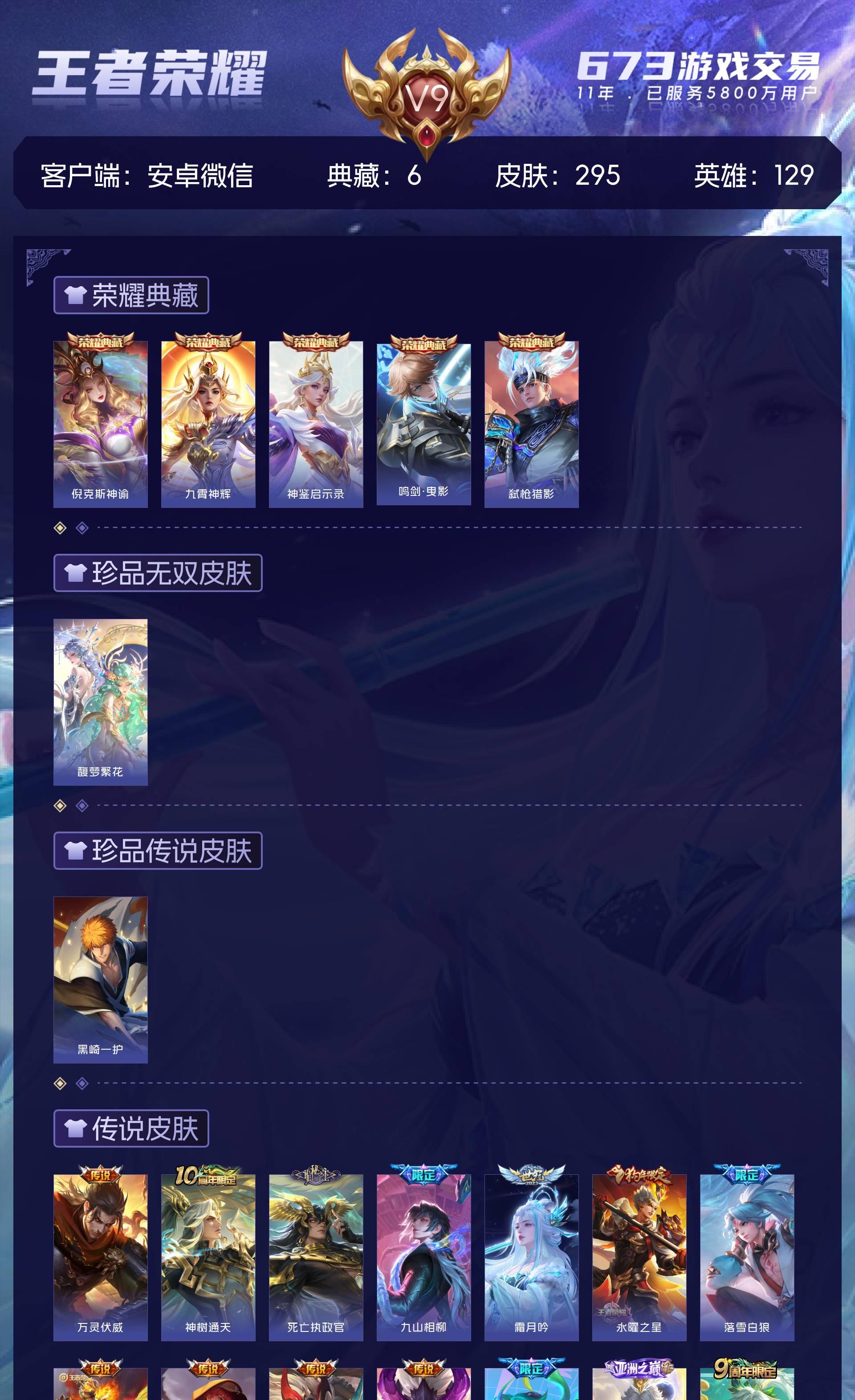 V9 皮肤295 英雄129 至尊星耀 荣耀典藏6 珍品无双1 珍品传说1 星传说3 传说31 其他皮肤264