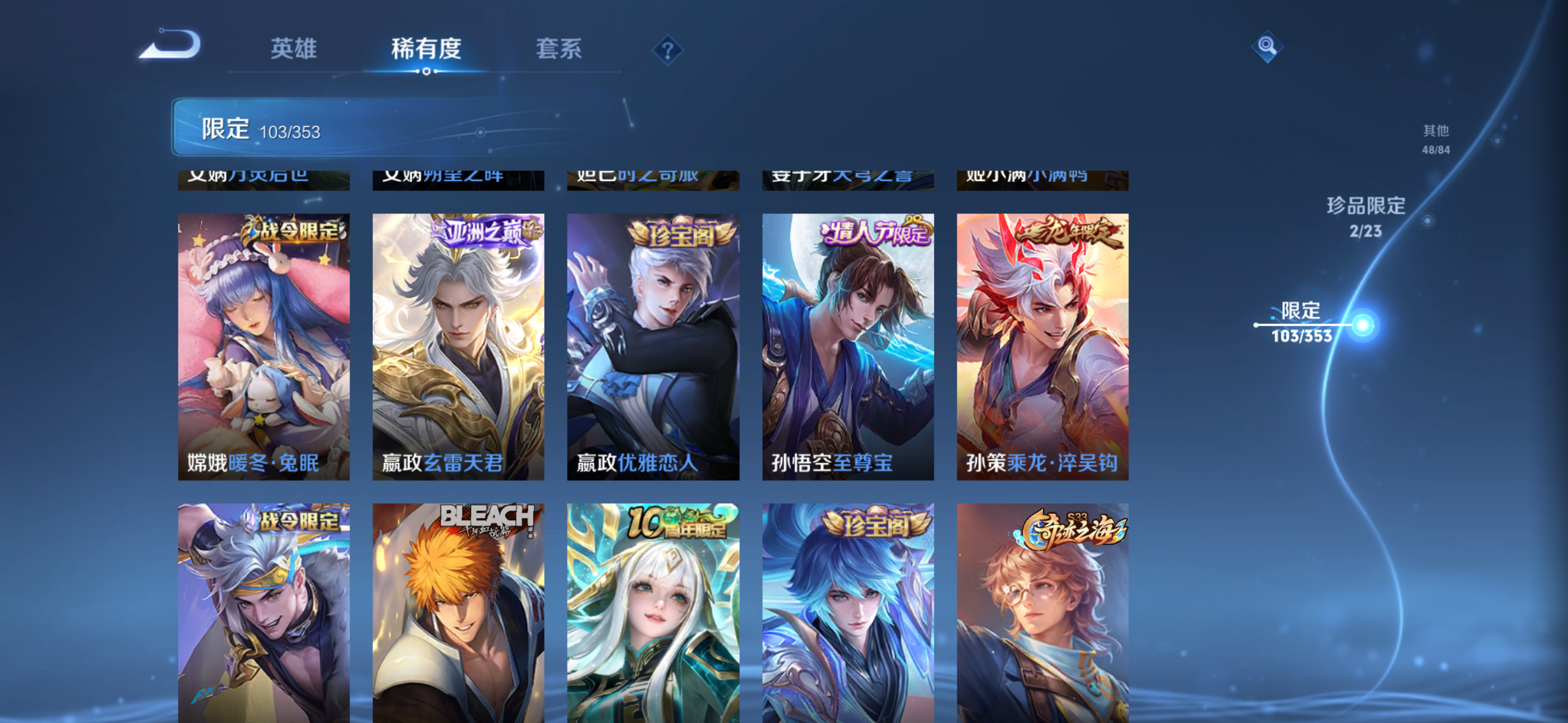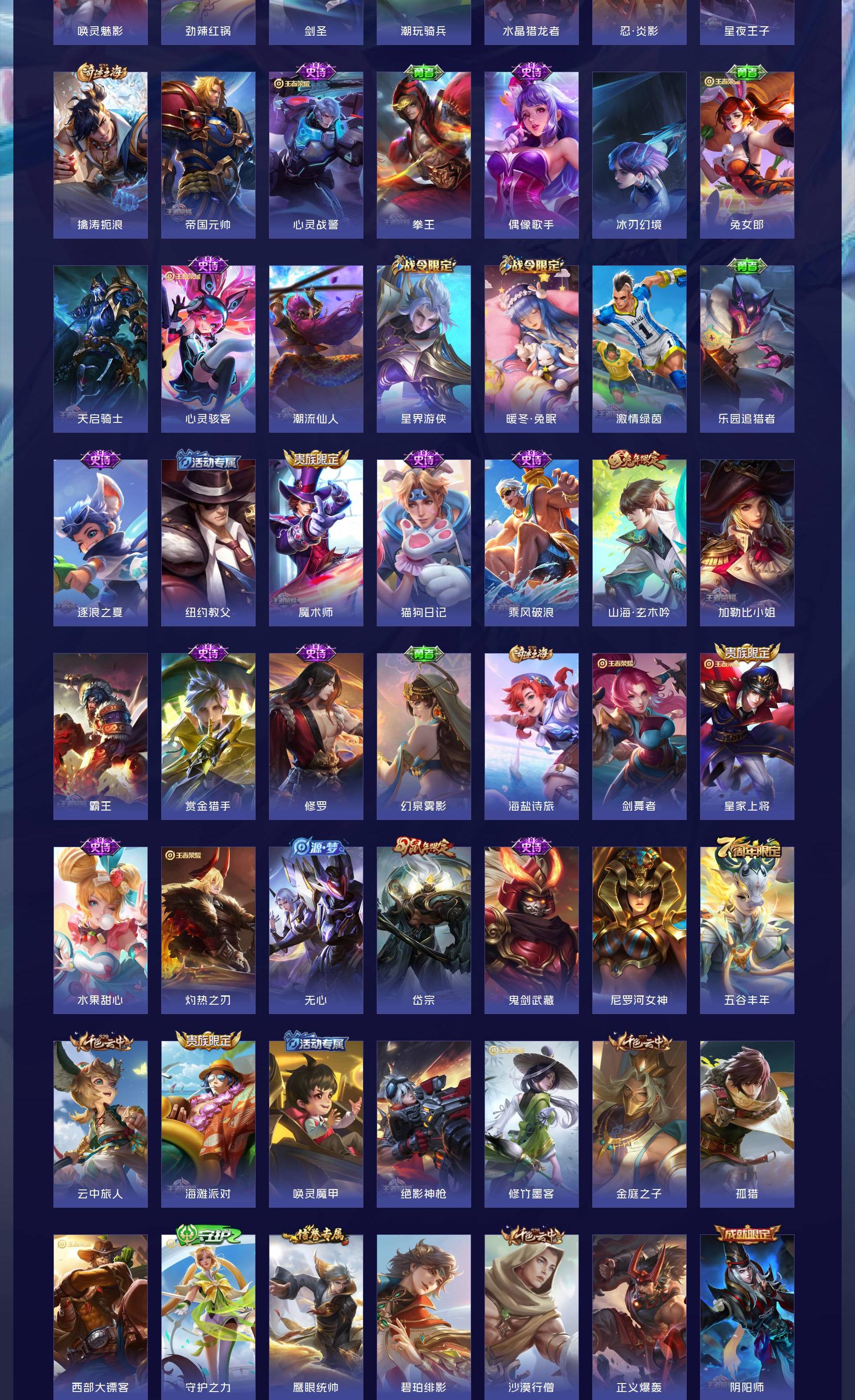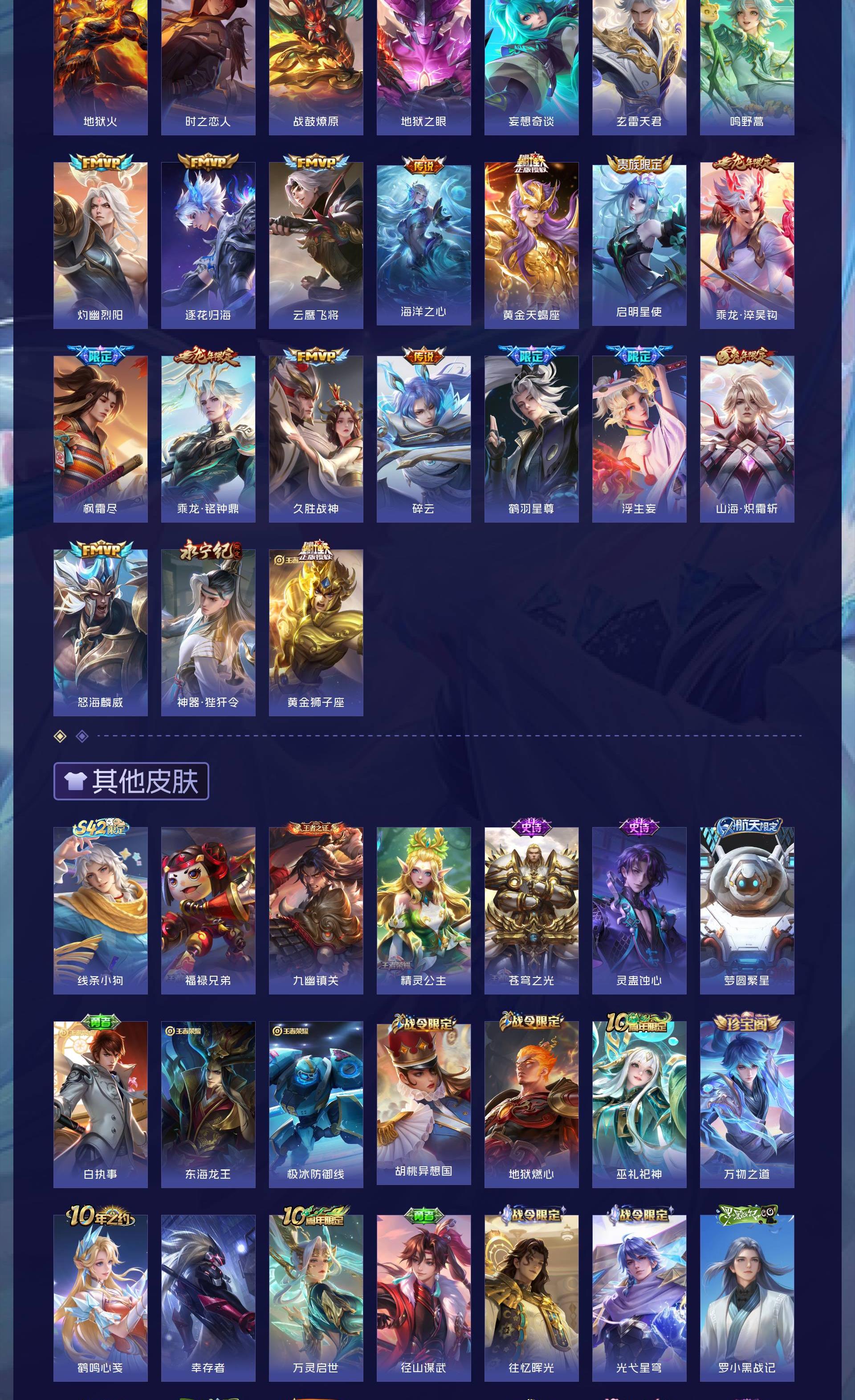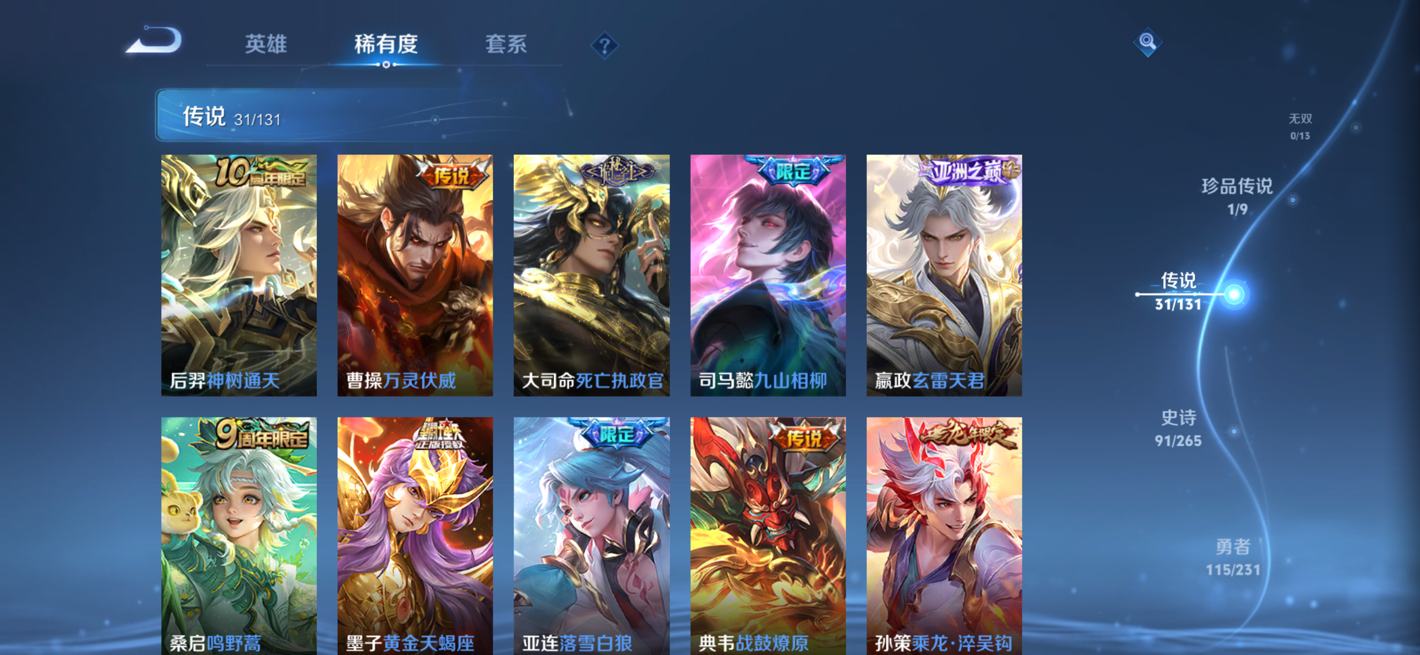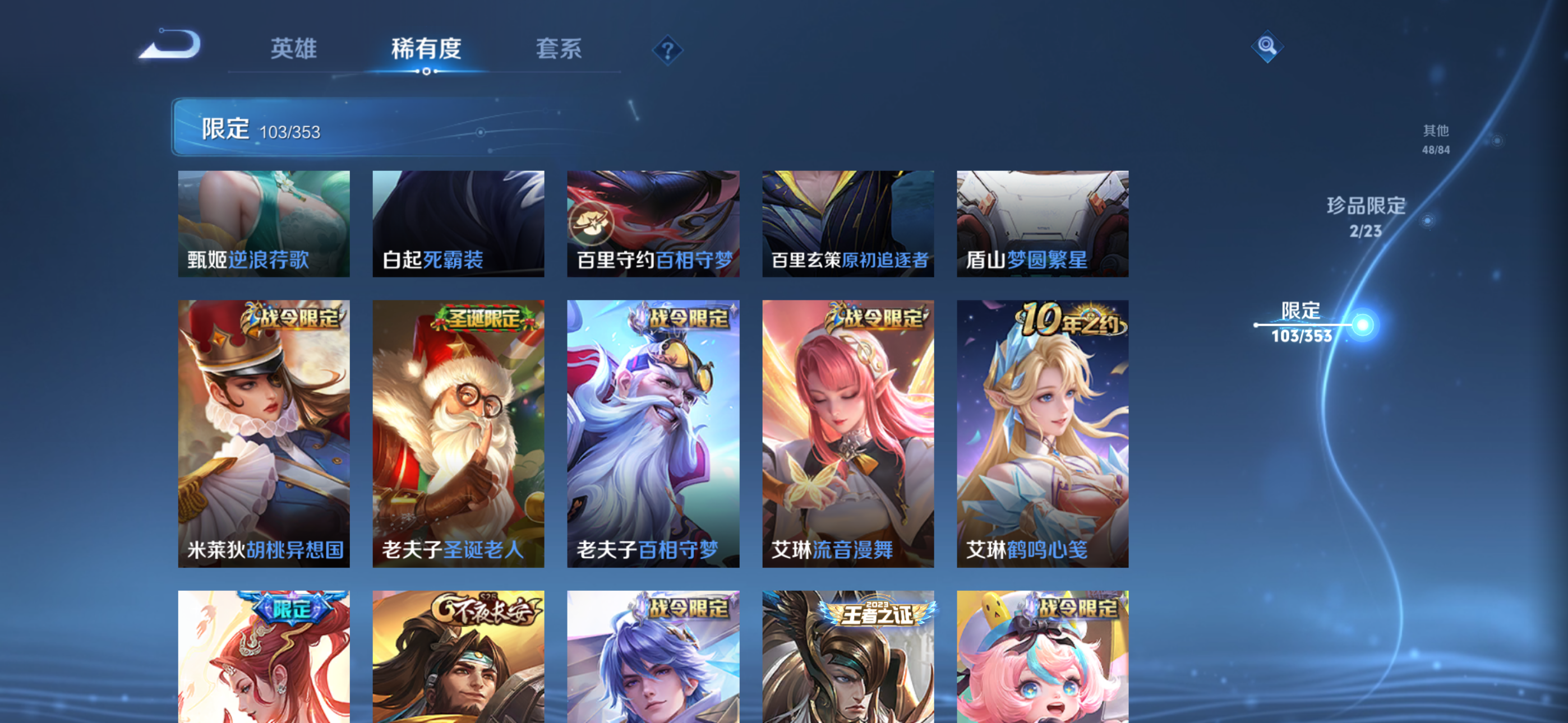 V9 皮肤295 英雄129 至尊星耀 荣耀典藏6 珍品无双1 珍品传说1 星传说3 传说31 其他皮肤264