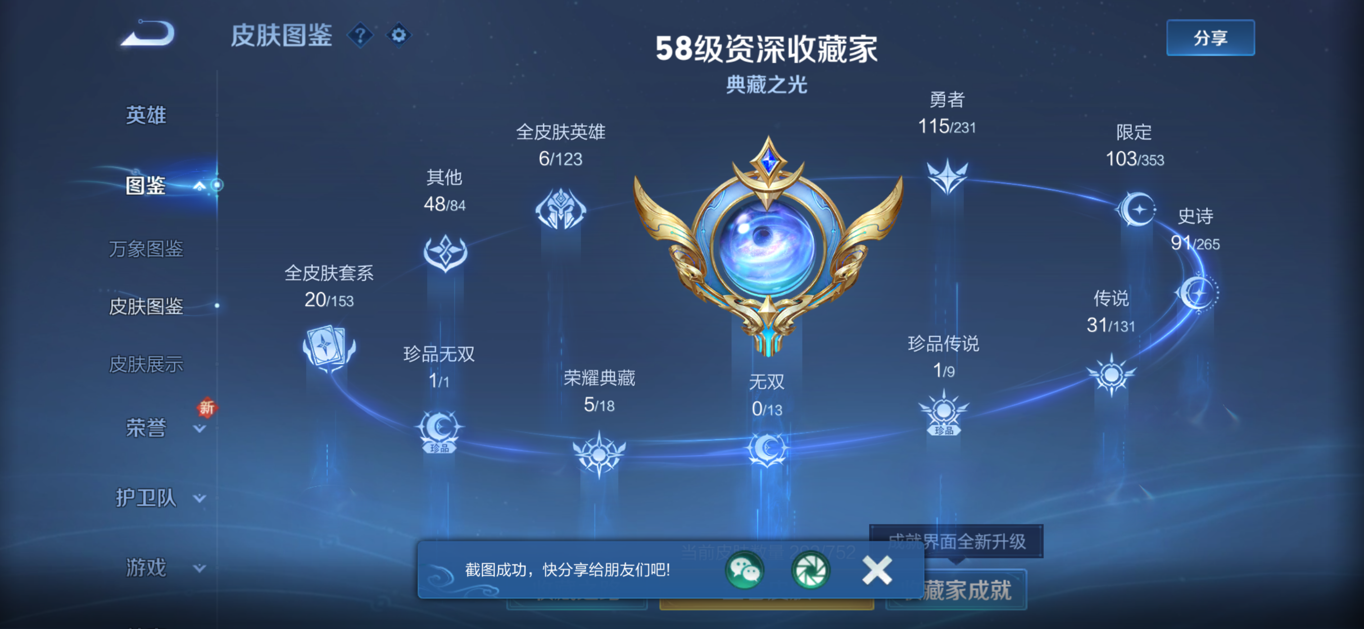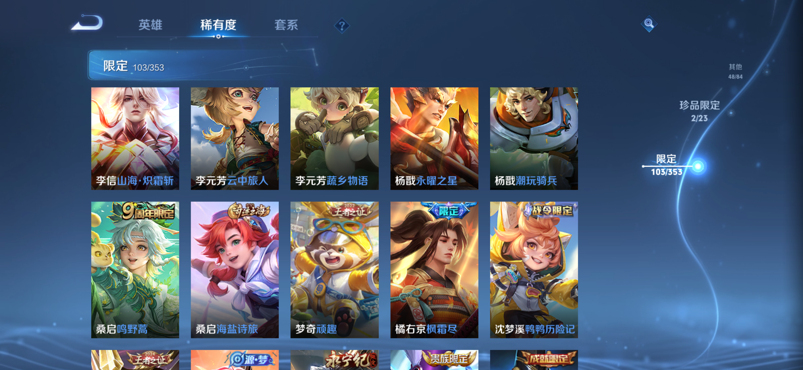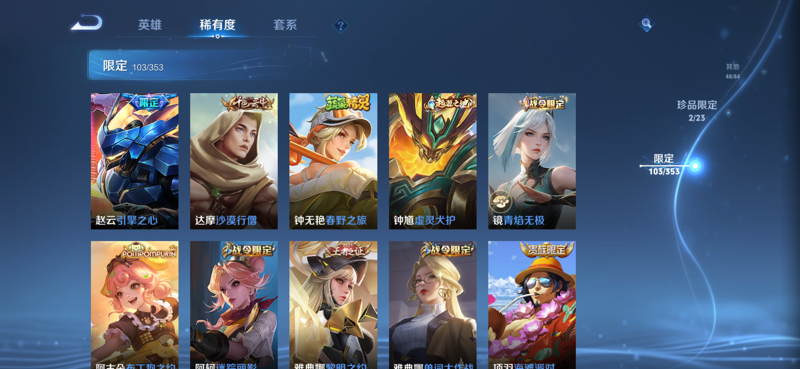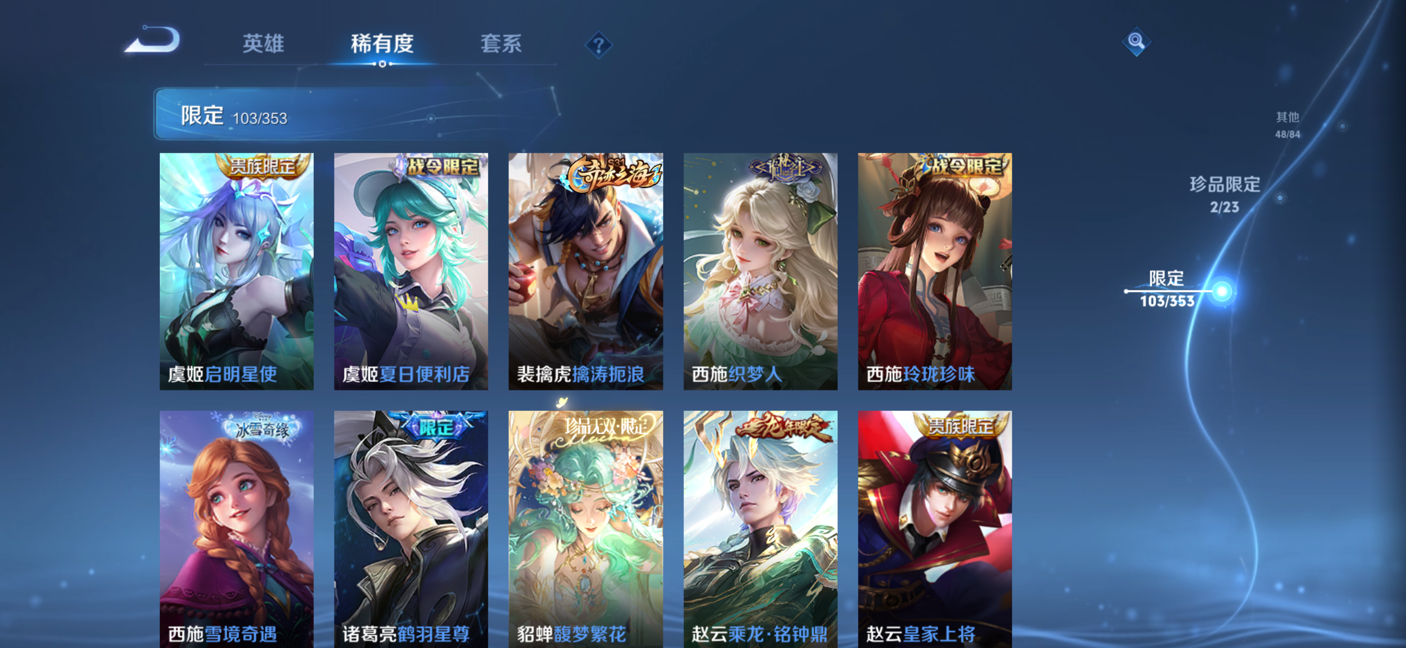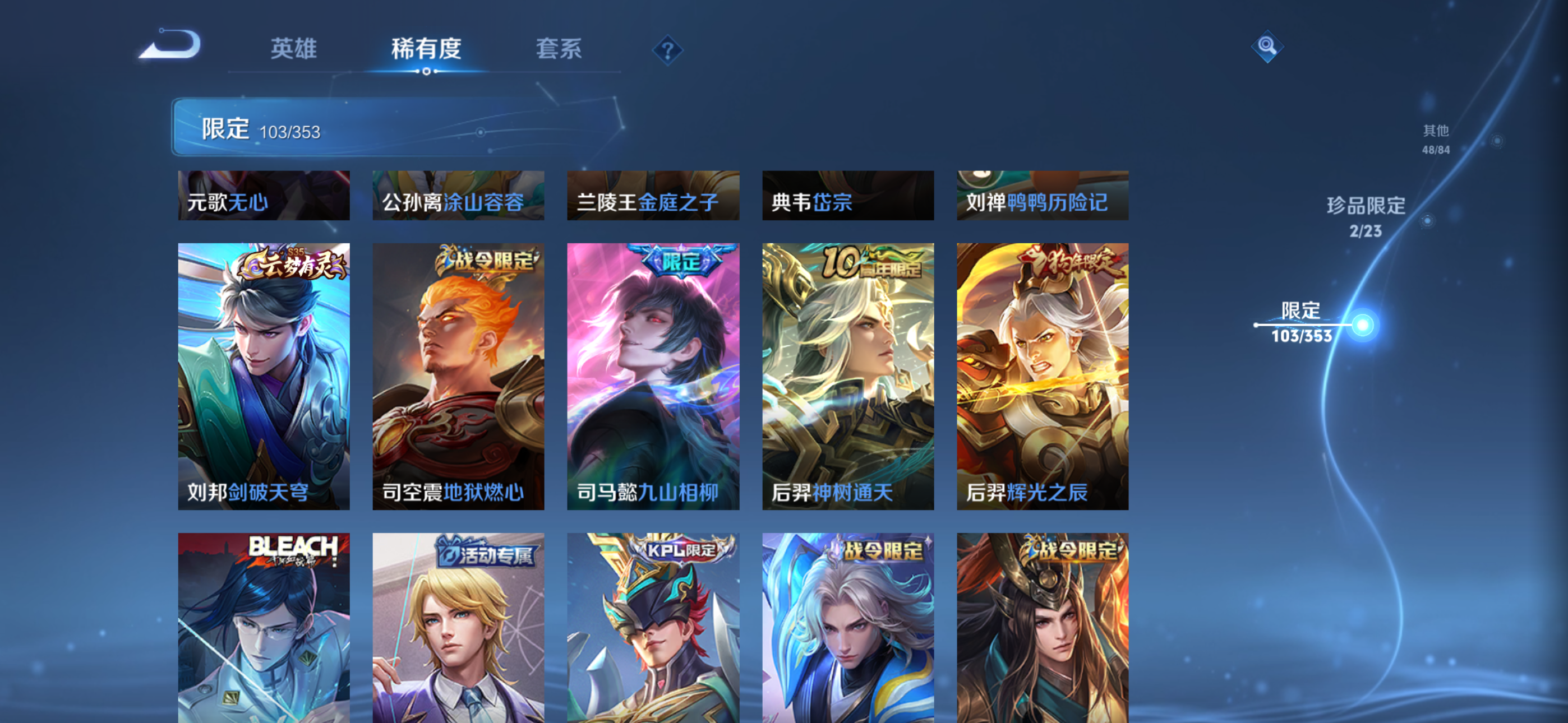 V9 皮肤295 英雄129 至尊星耀 荣耀典藏6 珍品无双1 珍品传说1 星传说3 传说31 其他皮肤264