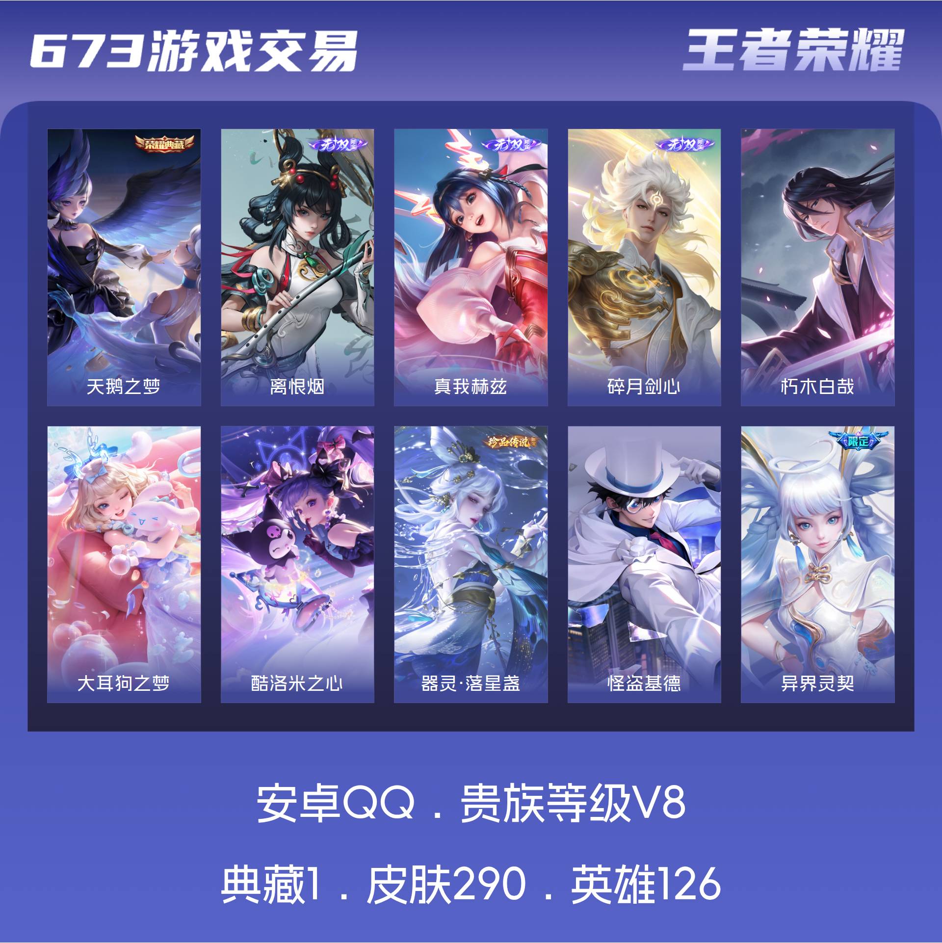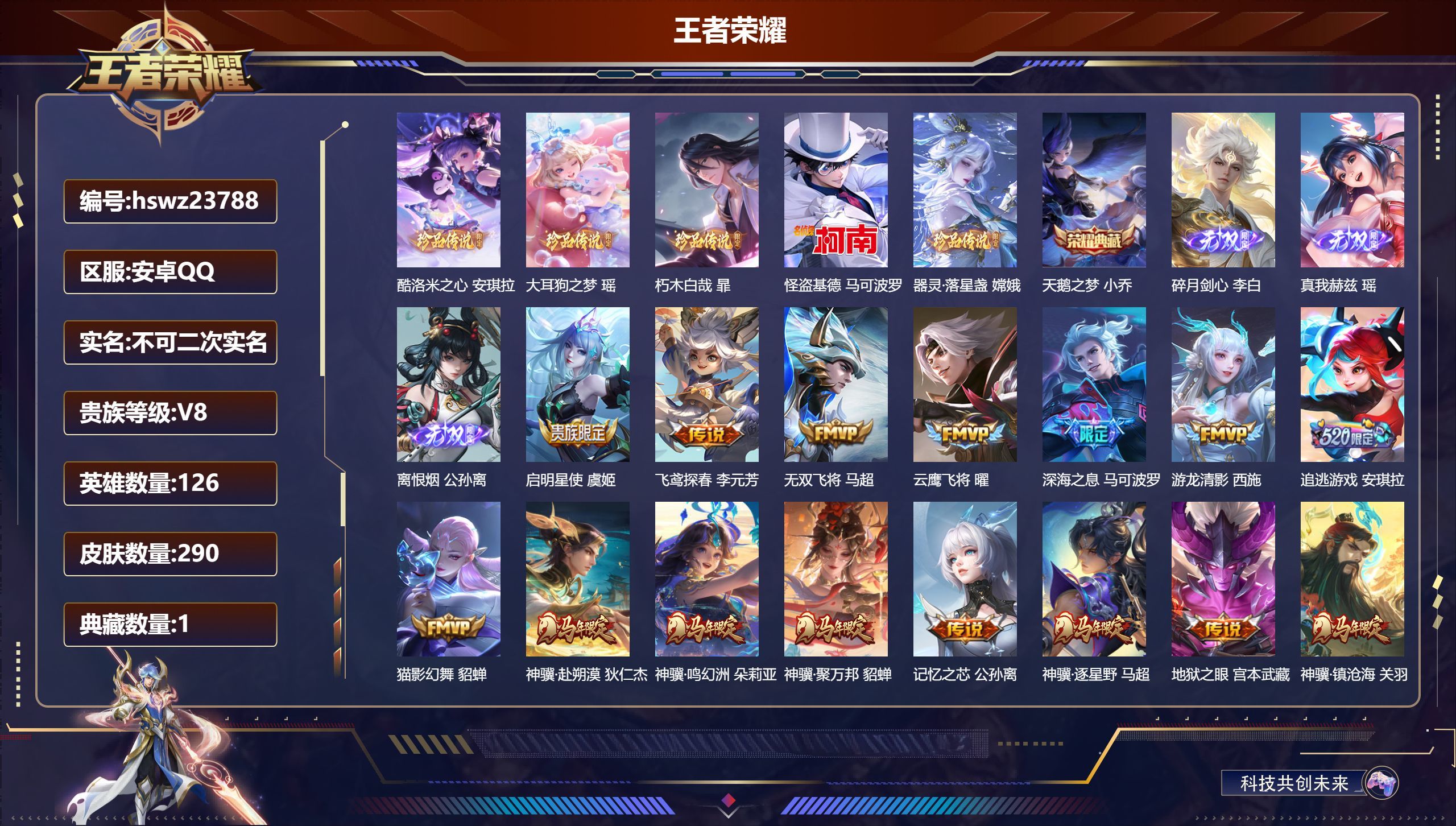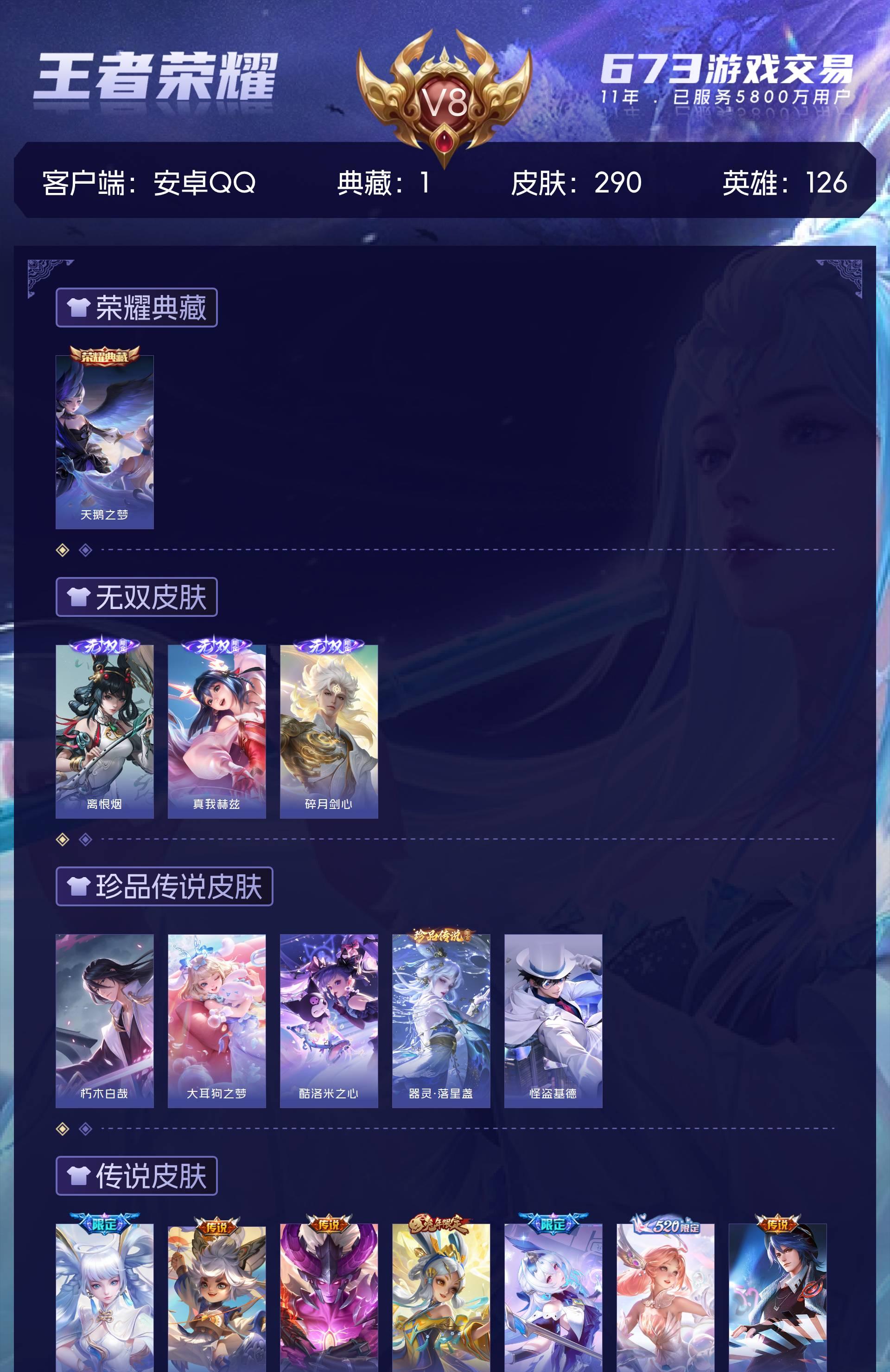 安卓QQ/永恒钻石/290皮肤/126英雄/1典藏/0珍品无双/3无双/5珍品传说/31传说/91史
