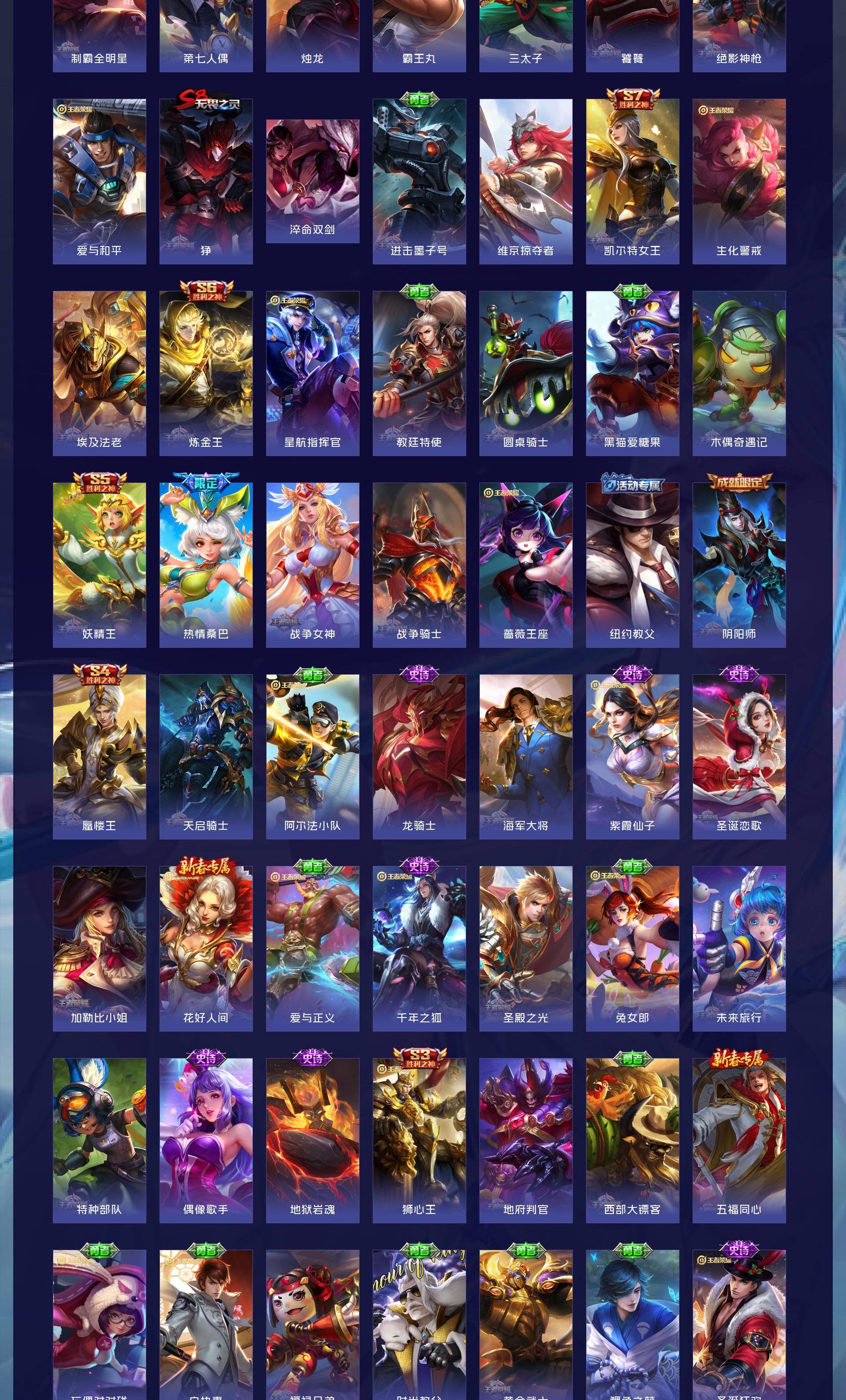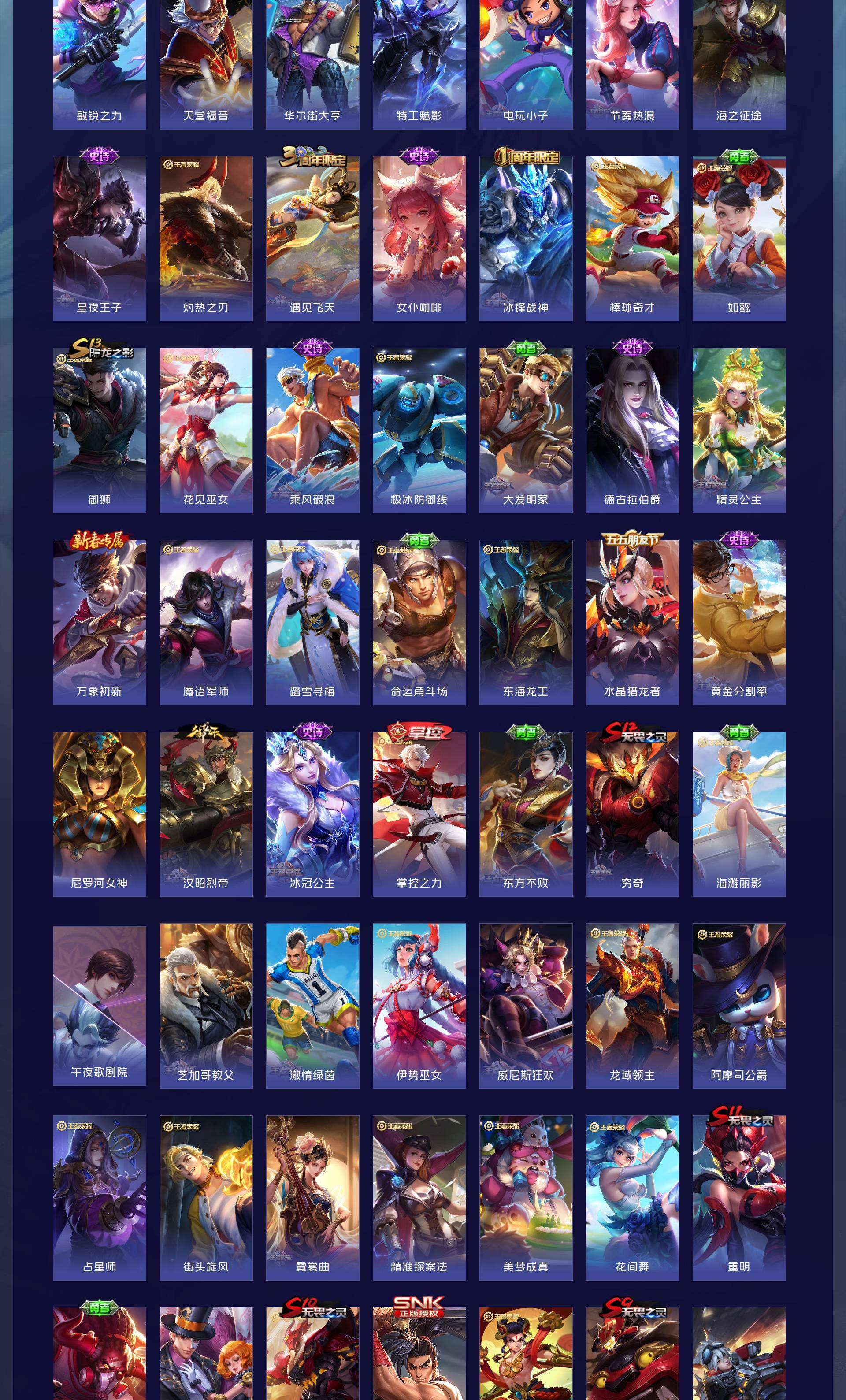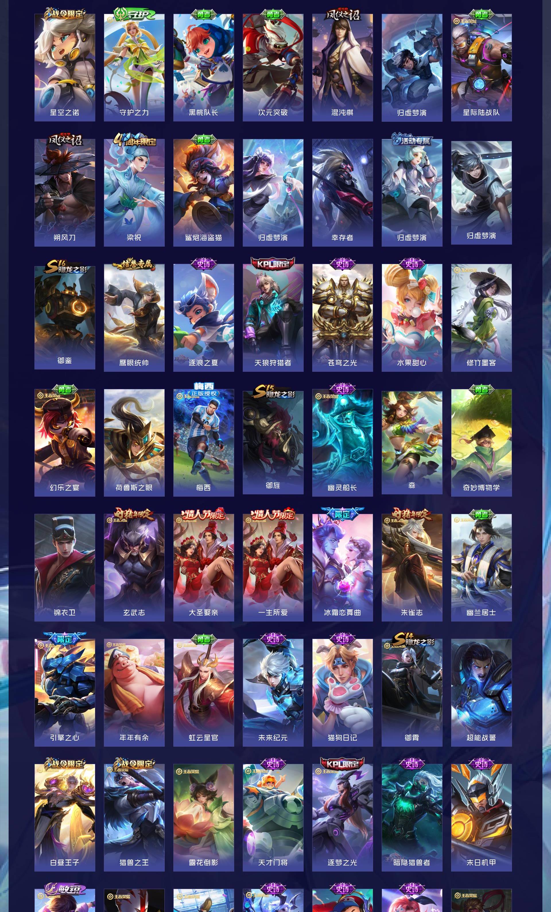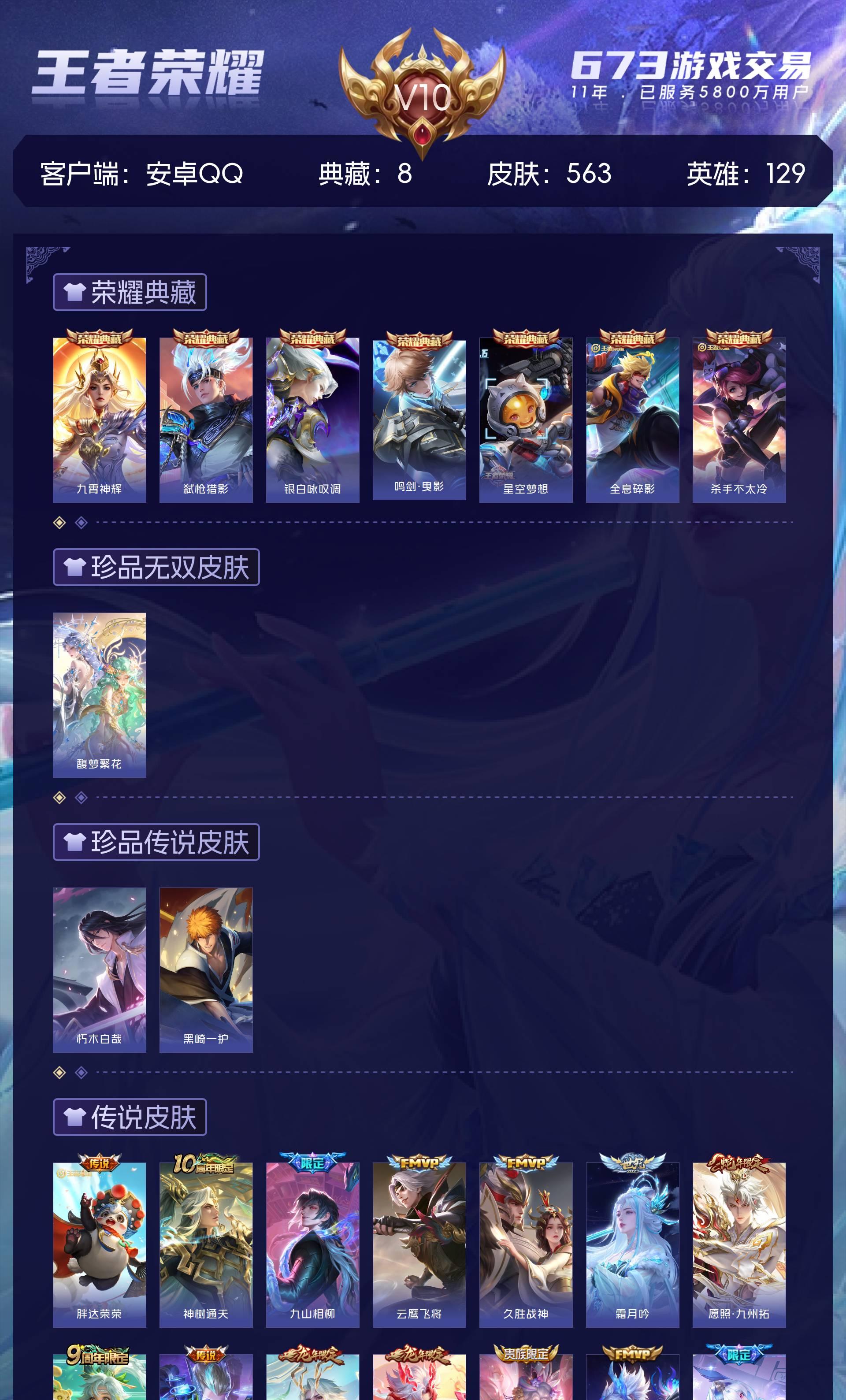 V10 皮肤563 英雄129 绝世王者 荣耀典藏8 珍品无双1 珍品传说2 传说63 其他皮肤493