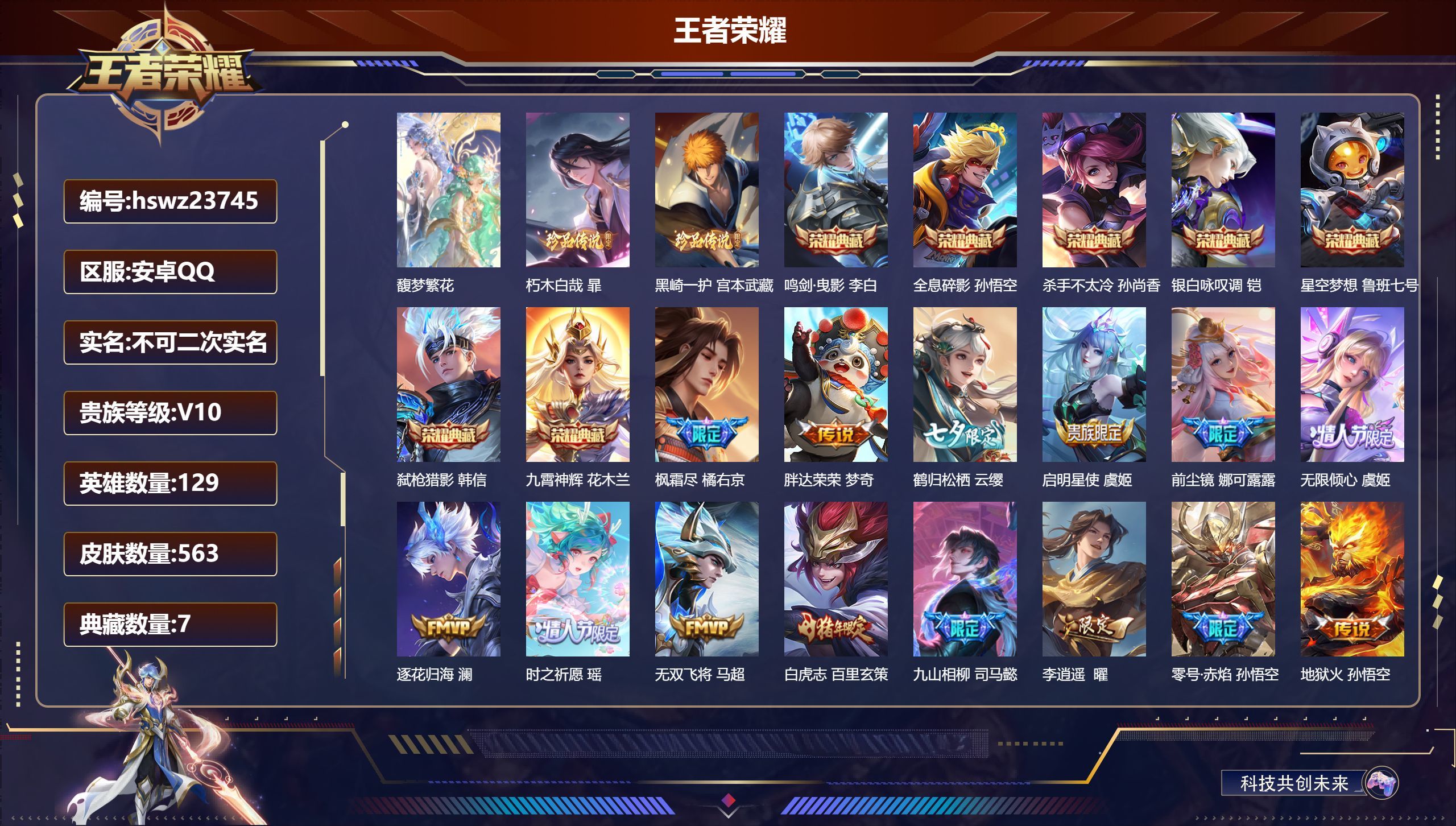 安卓QQ/绝世王者/563皮肤/129英雄/7典藏/1珍品无双/0无双/2珍品传说/64传说/184
