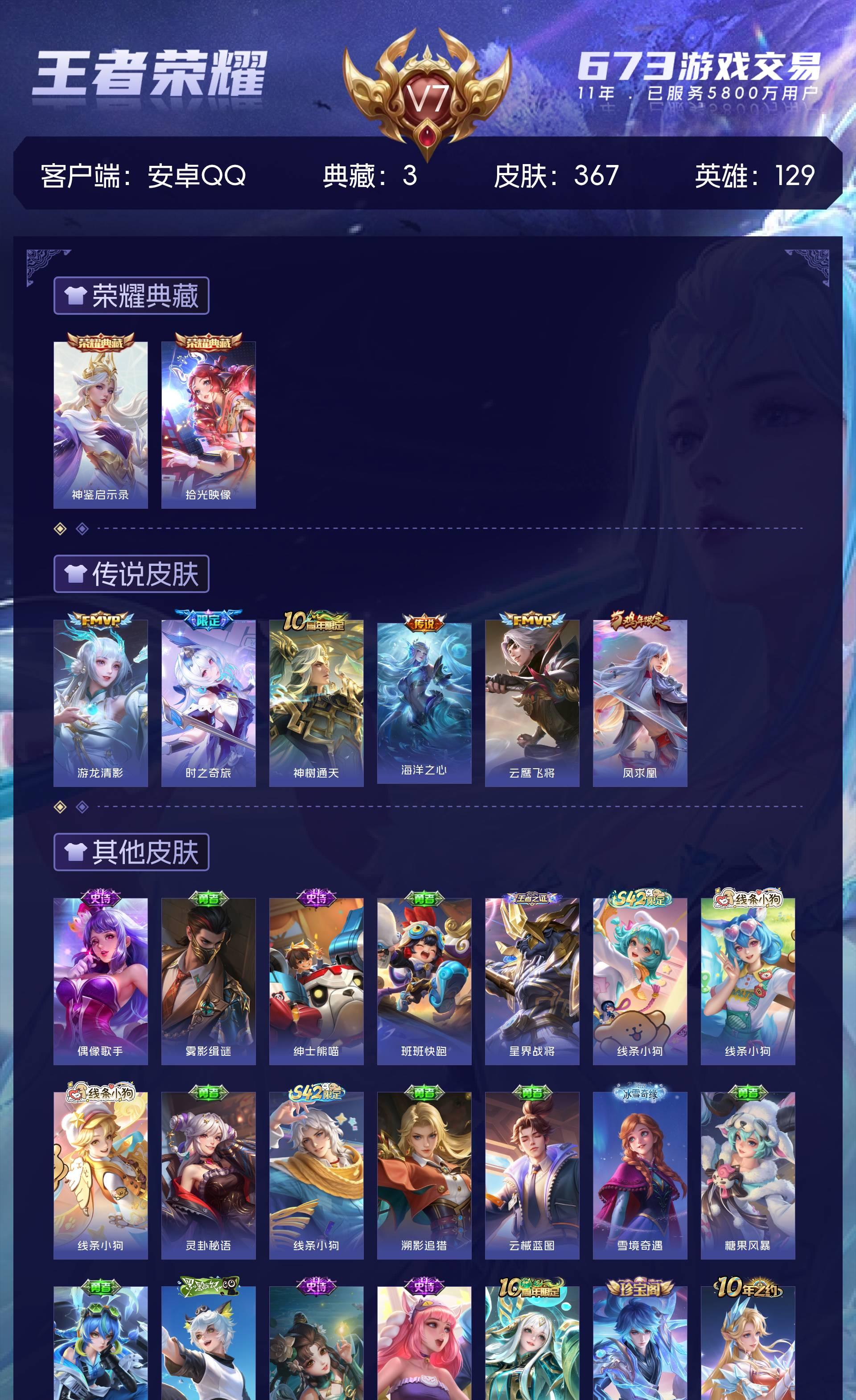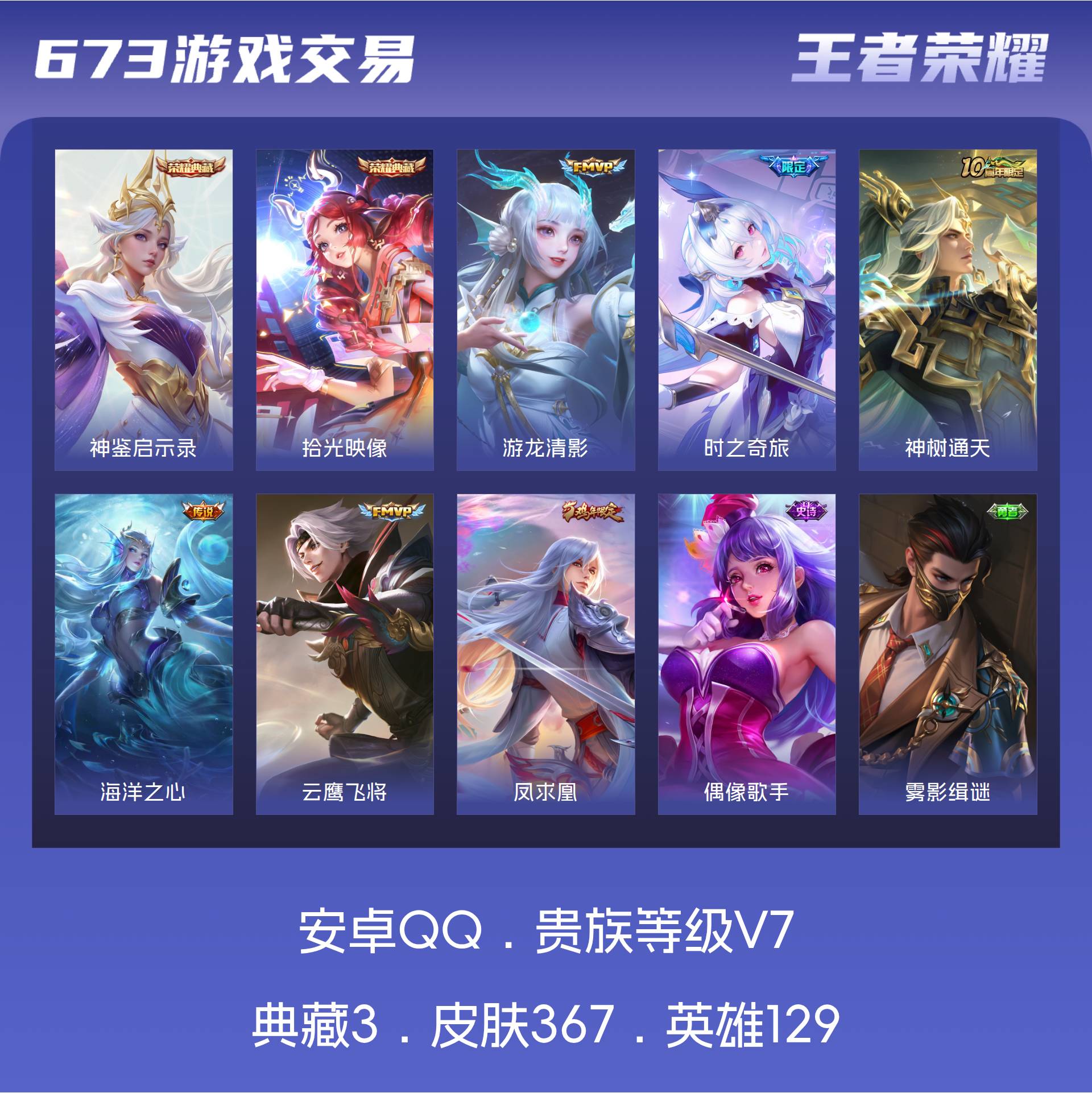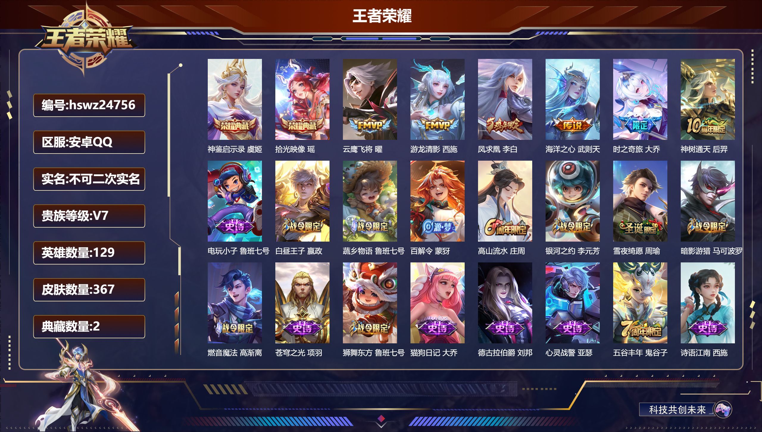 安卓QQ/非凡王者/367皮肤/129英雄/2典藏/0珍品无双/0无双/0珍品传说/6传说/103史