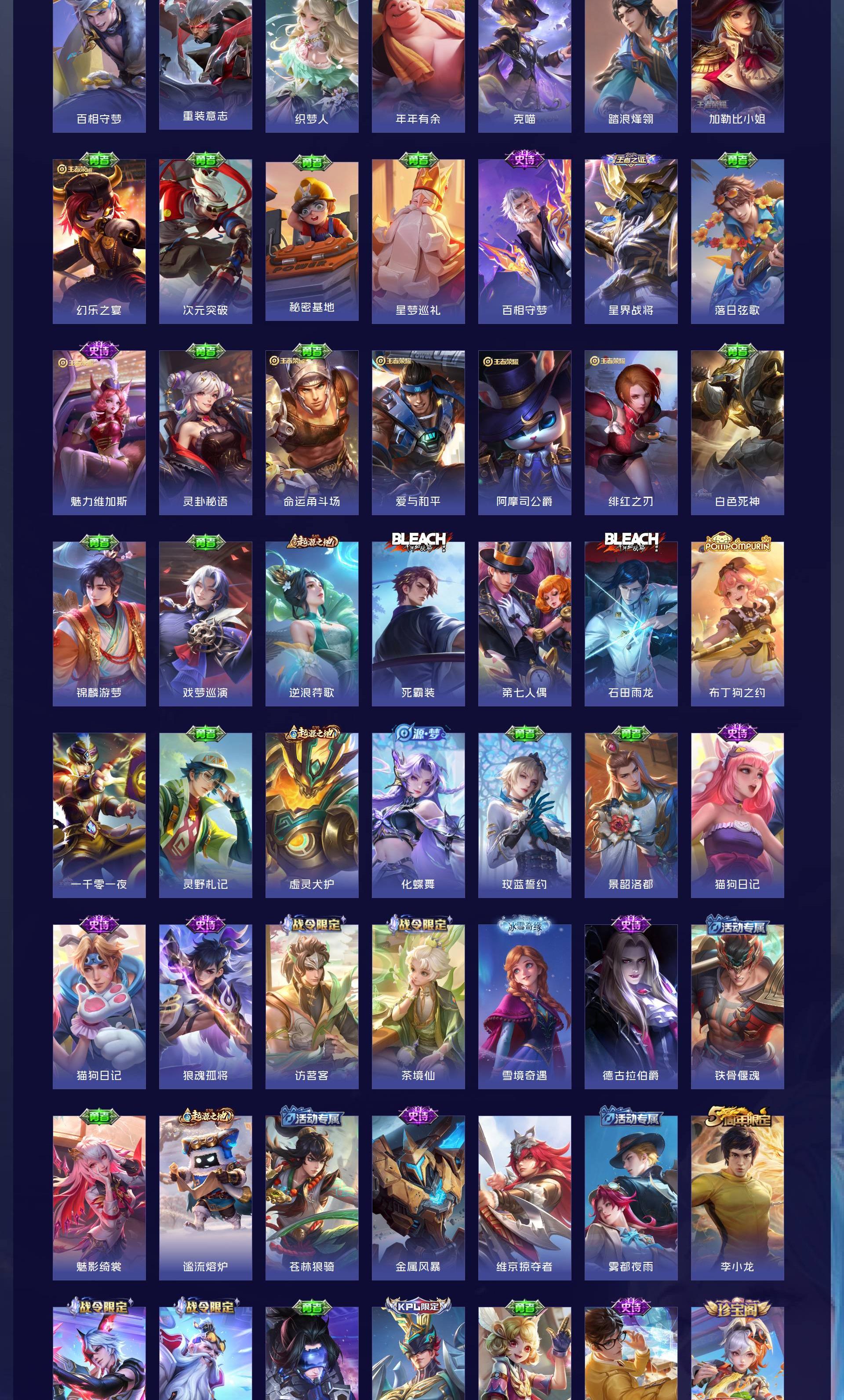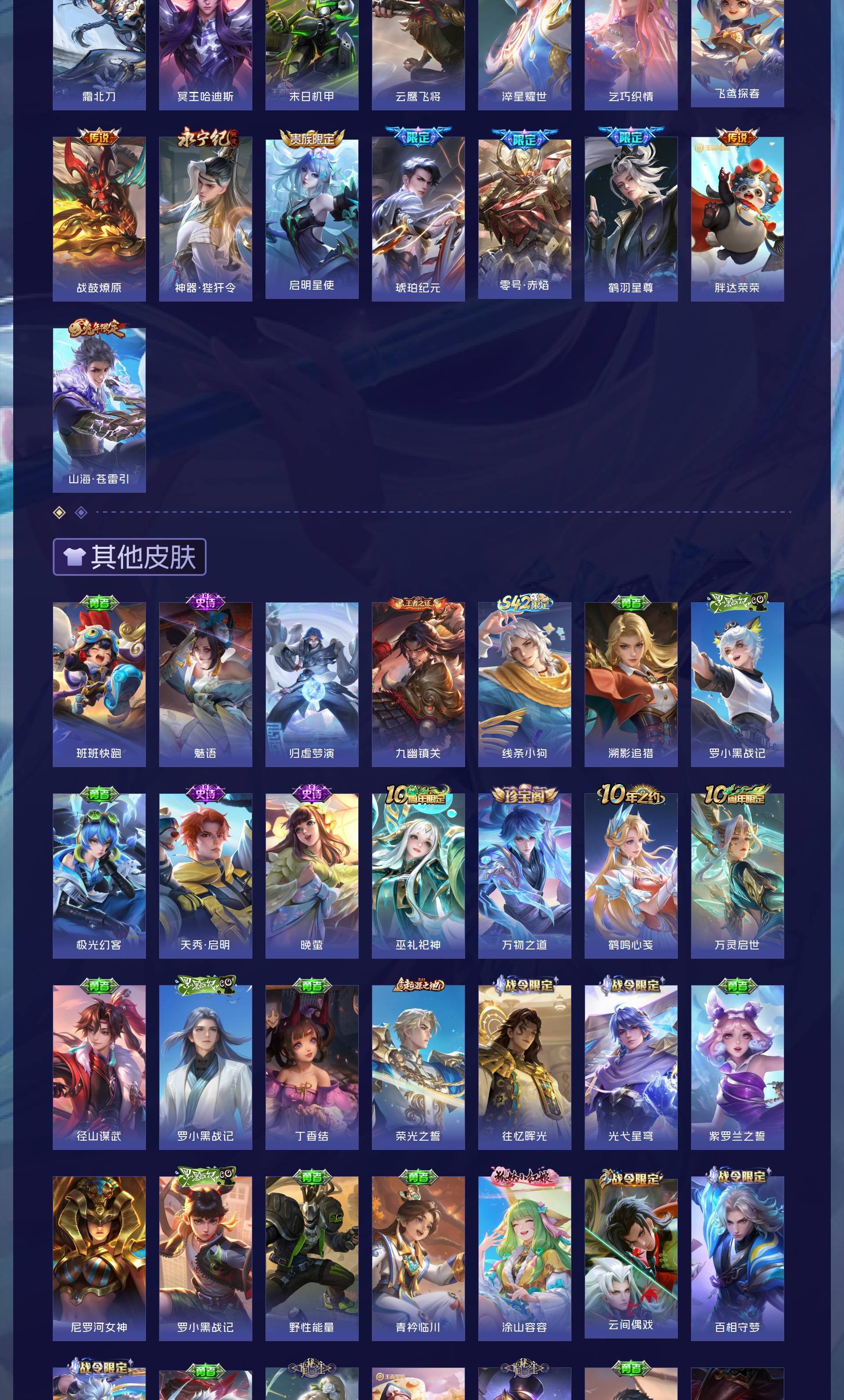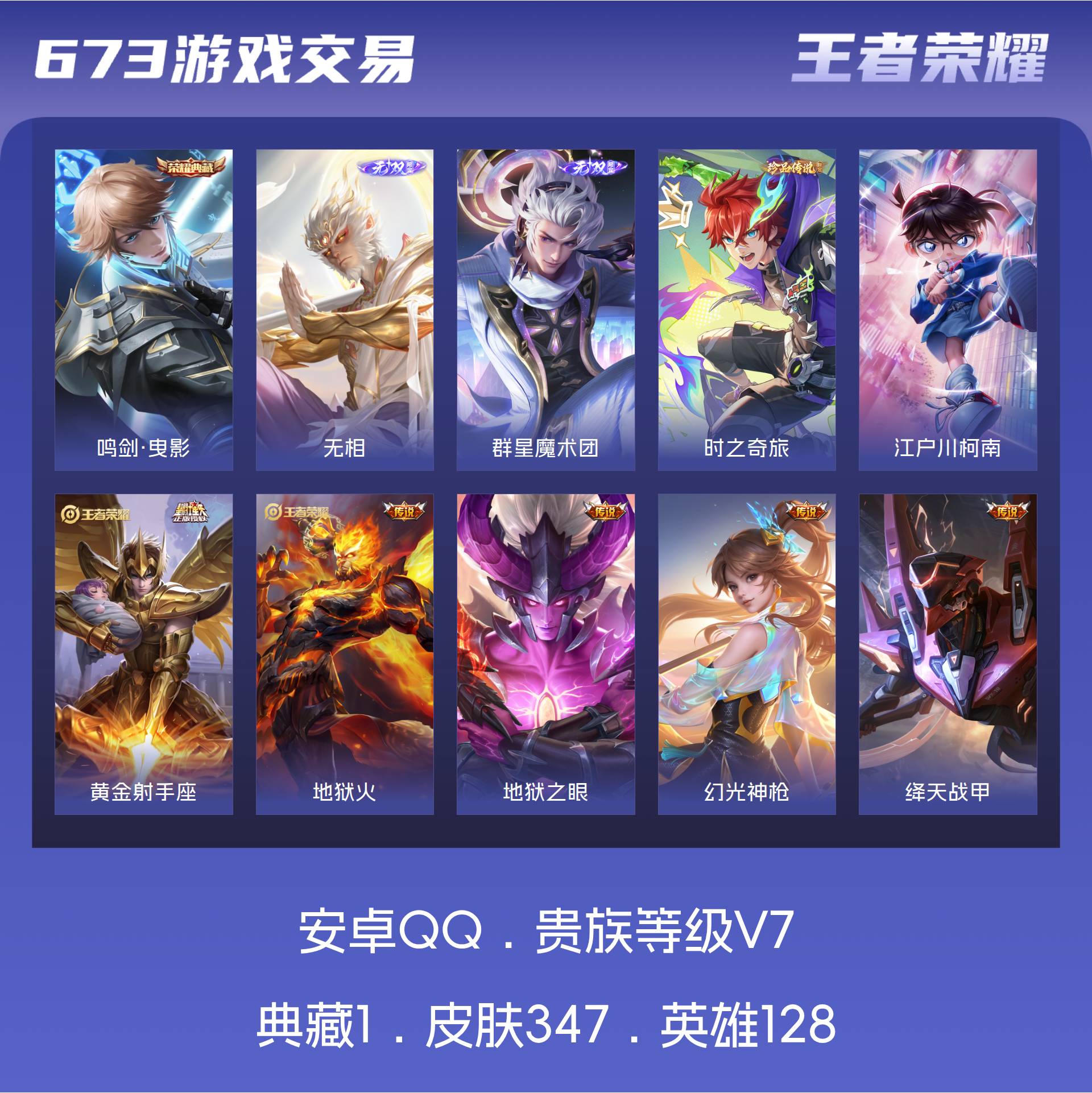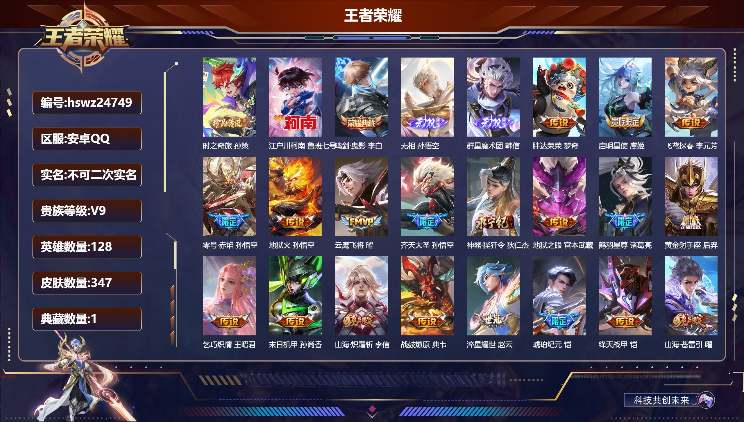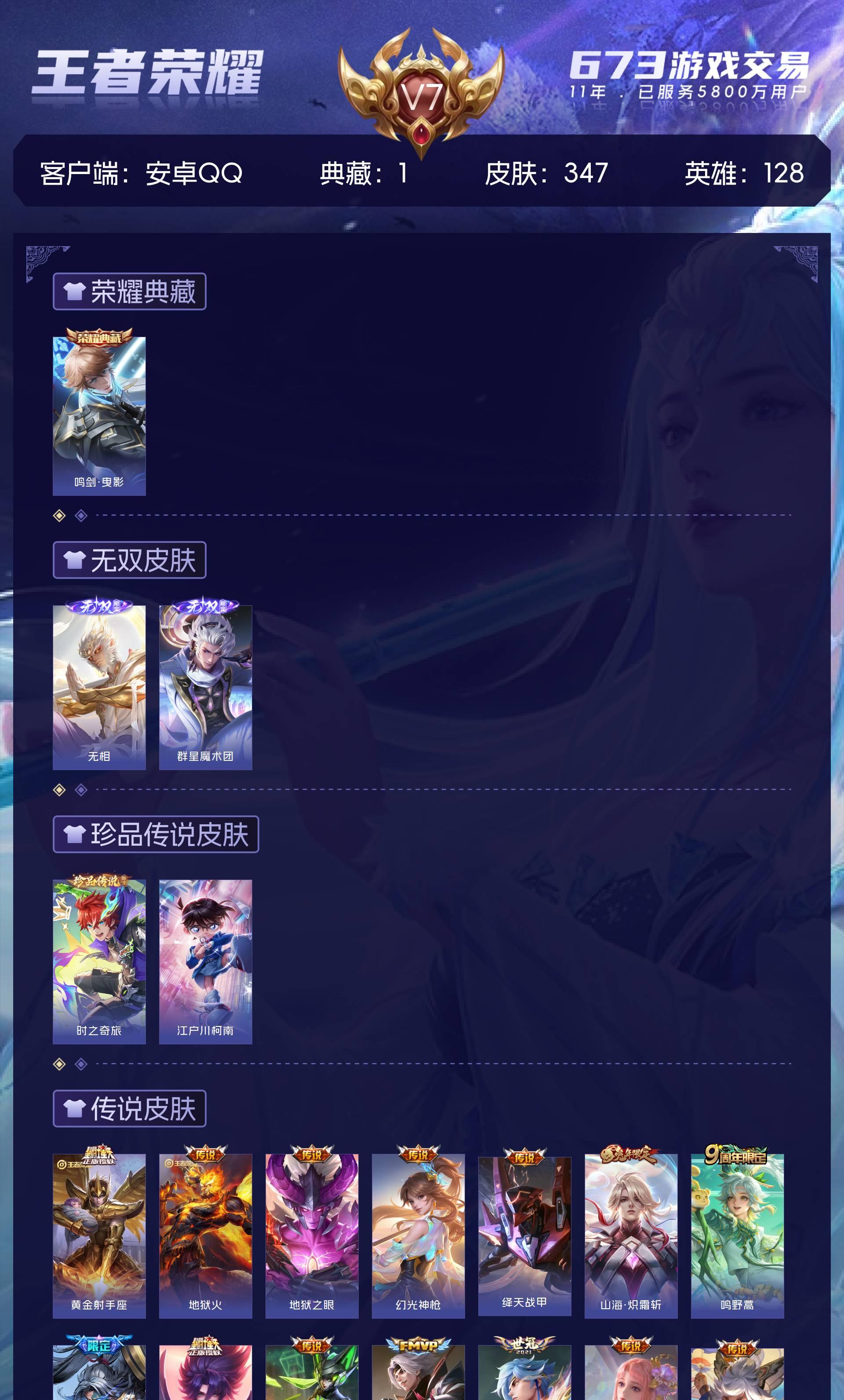 安卓QQ/非凡王者/347皮肤/128英雄/1典藏/0珍品无双/2无双/2珍品传说/23传说/110