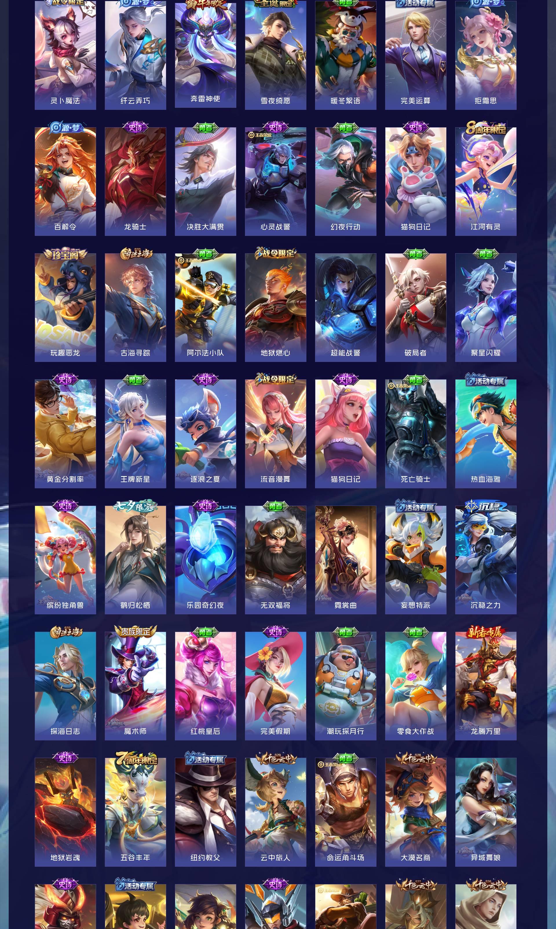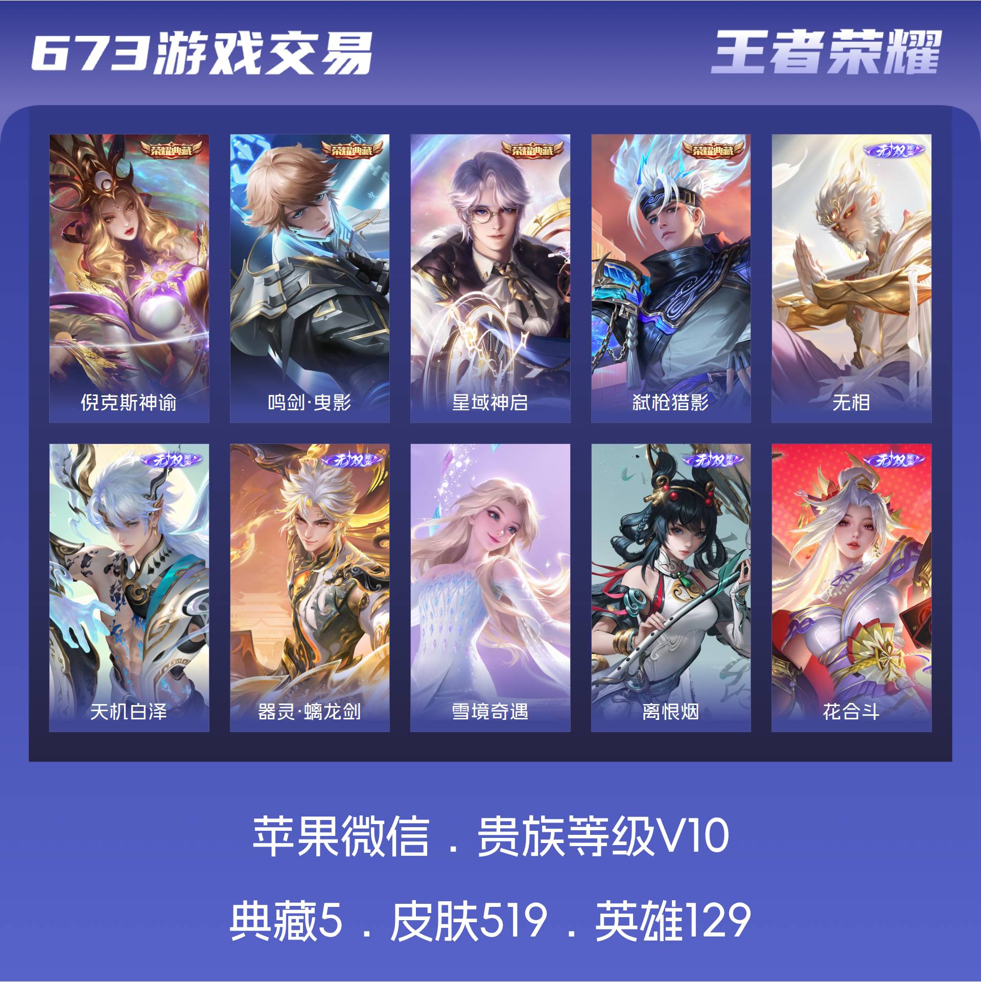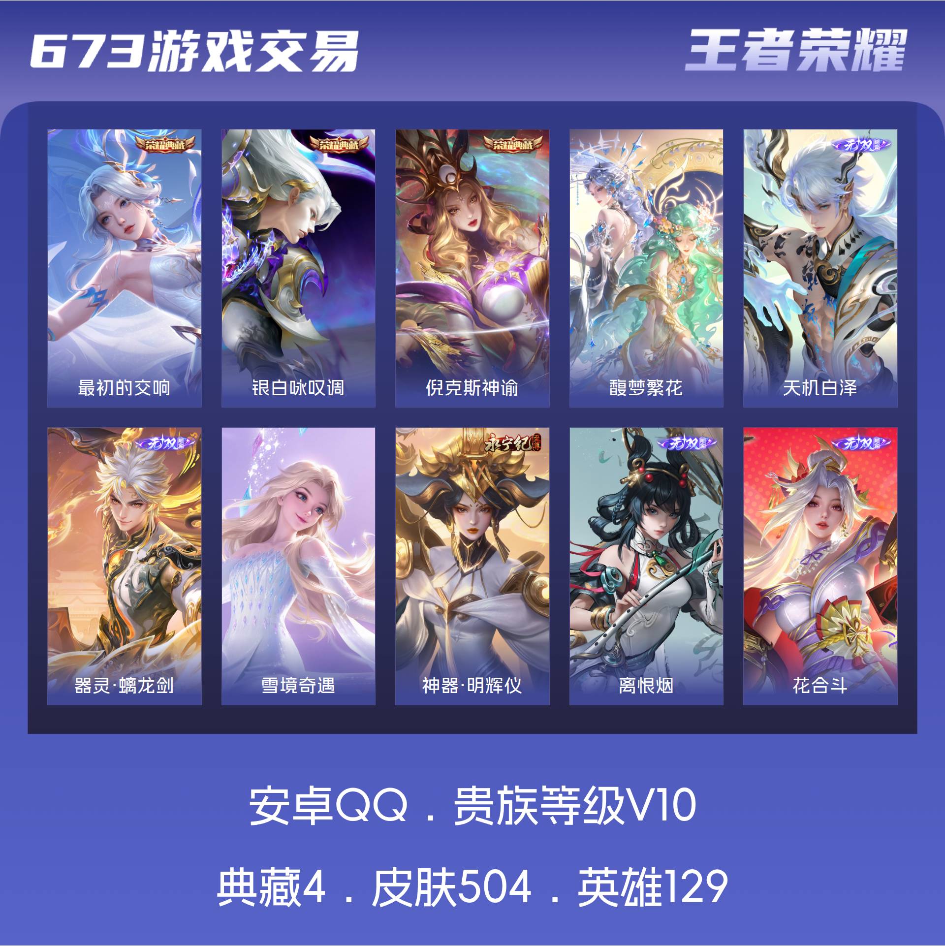V10 皮肤504 英雄129 至尊星耀 荣耀典藏4 珍品无双1 无双皮肤6 珍品传说9 传说68 其他皮肤422