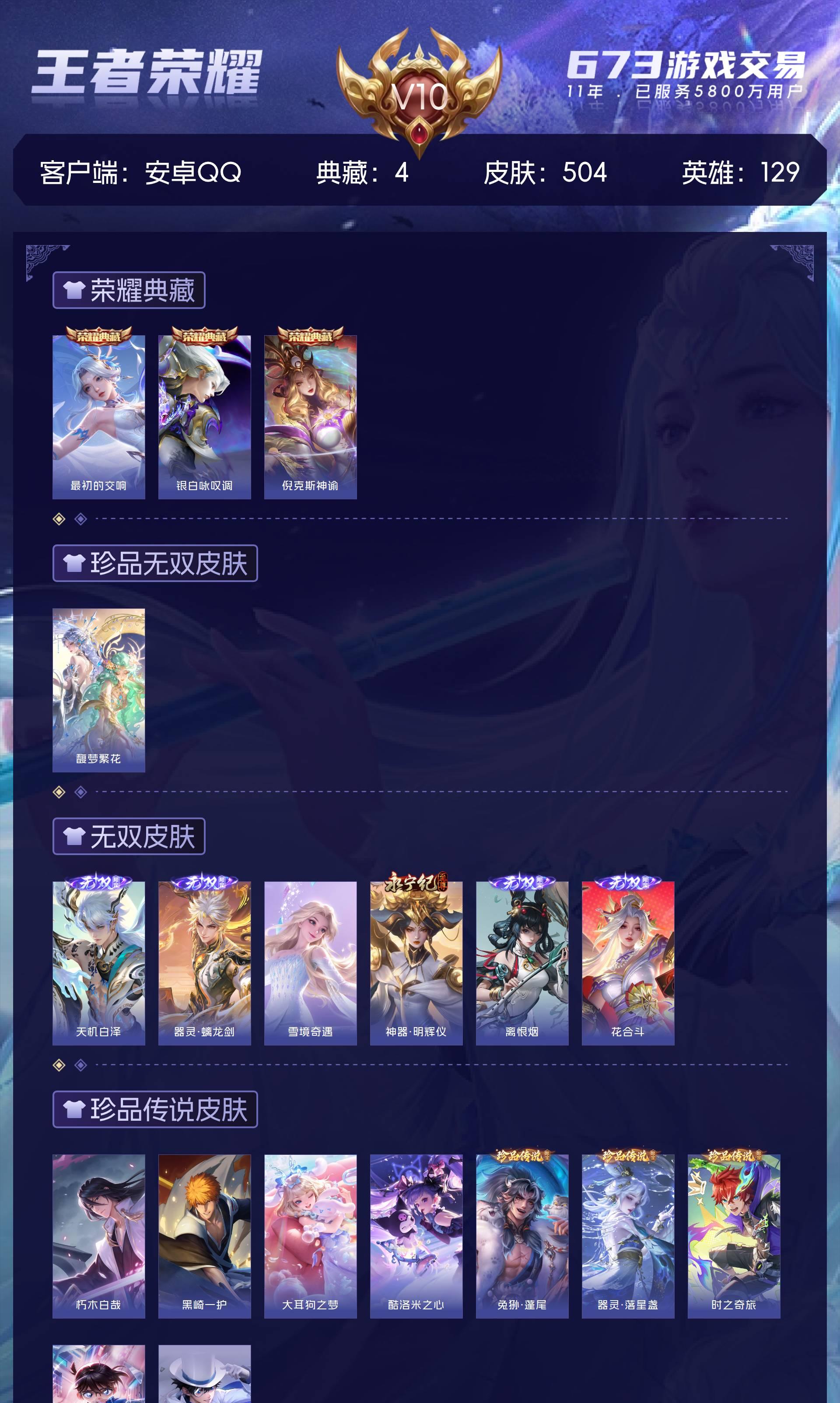 安卓QQ/至尊星耀/504皮肤/129英雄/3典藏/1珍品无双/6无双/9珍品传说/69传说/165