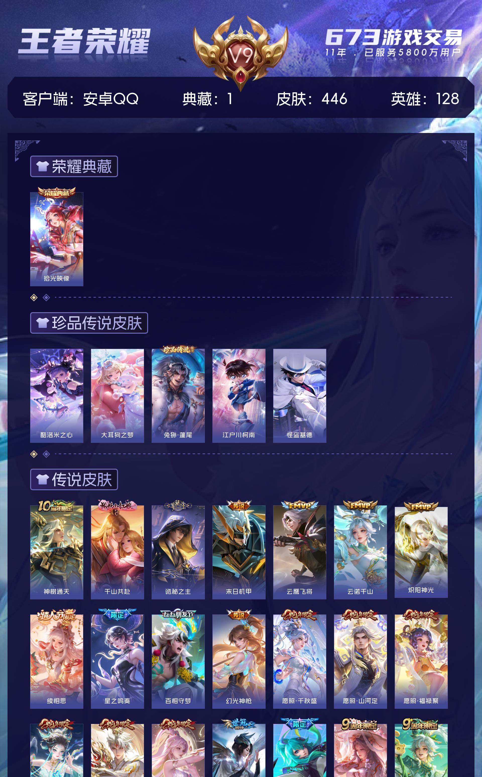 V9 皮肤446 英雄128 至尊星耀 荣耀典藏1 珍品传说5 传说37 其他皮肤407