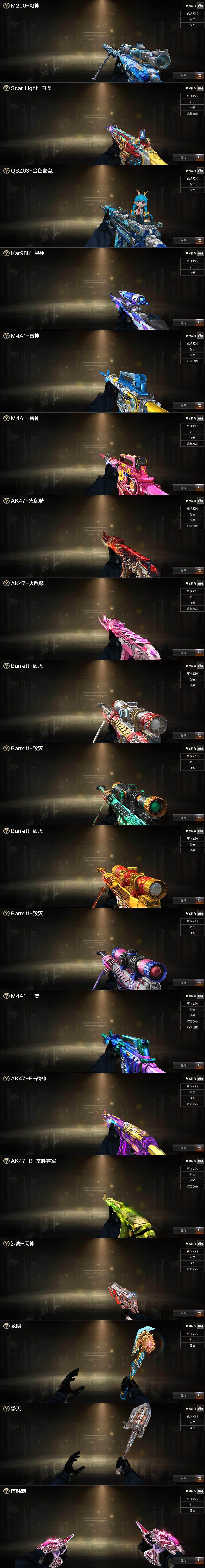 【热门武器】:QBZ03-金色蔷薇,HK417-朱雀,M200-幻神,金色蔷薇-古蛇迷踪,修罗-古蛇迷踪,死亡之眼,白虎-电玩蓝兔,Kar98K-星神