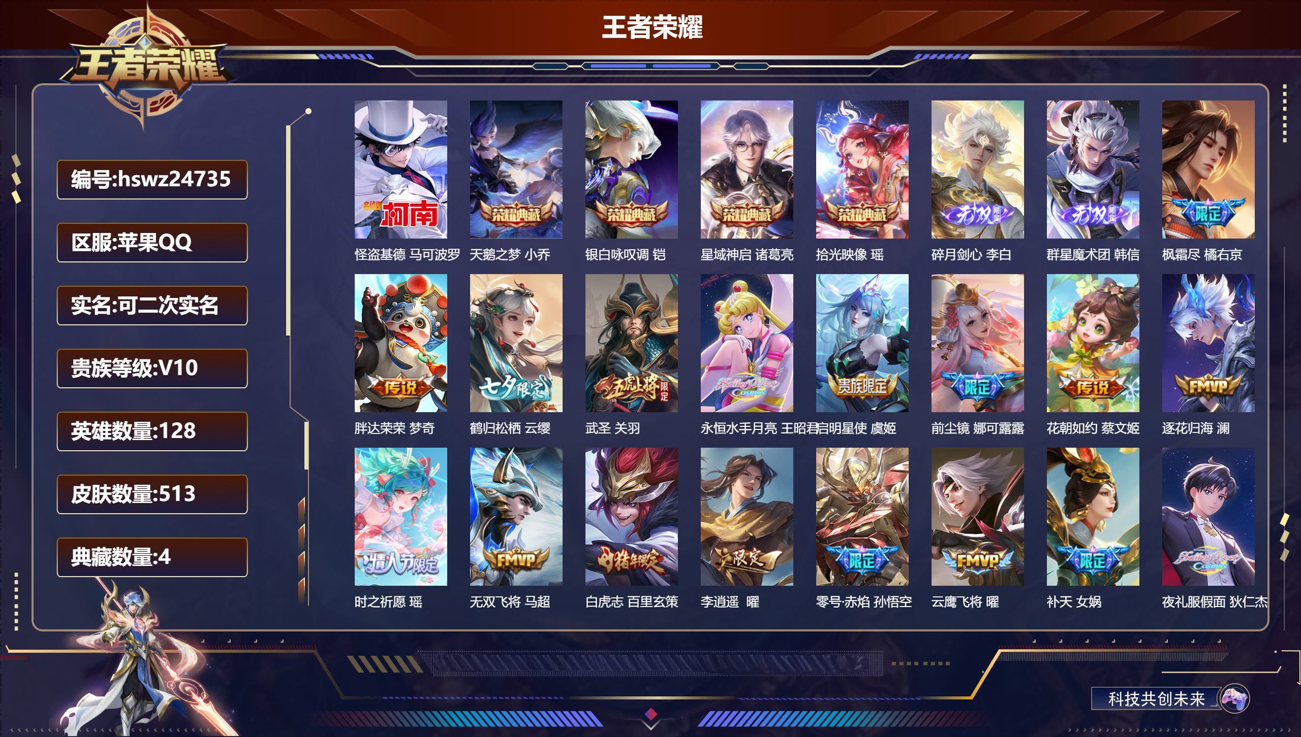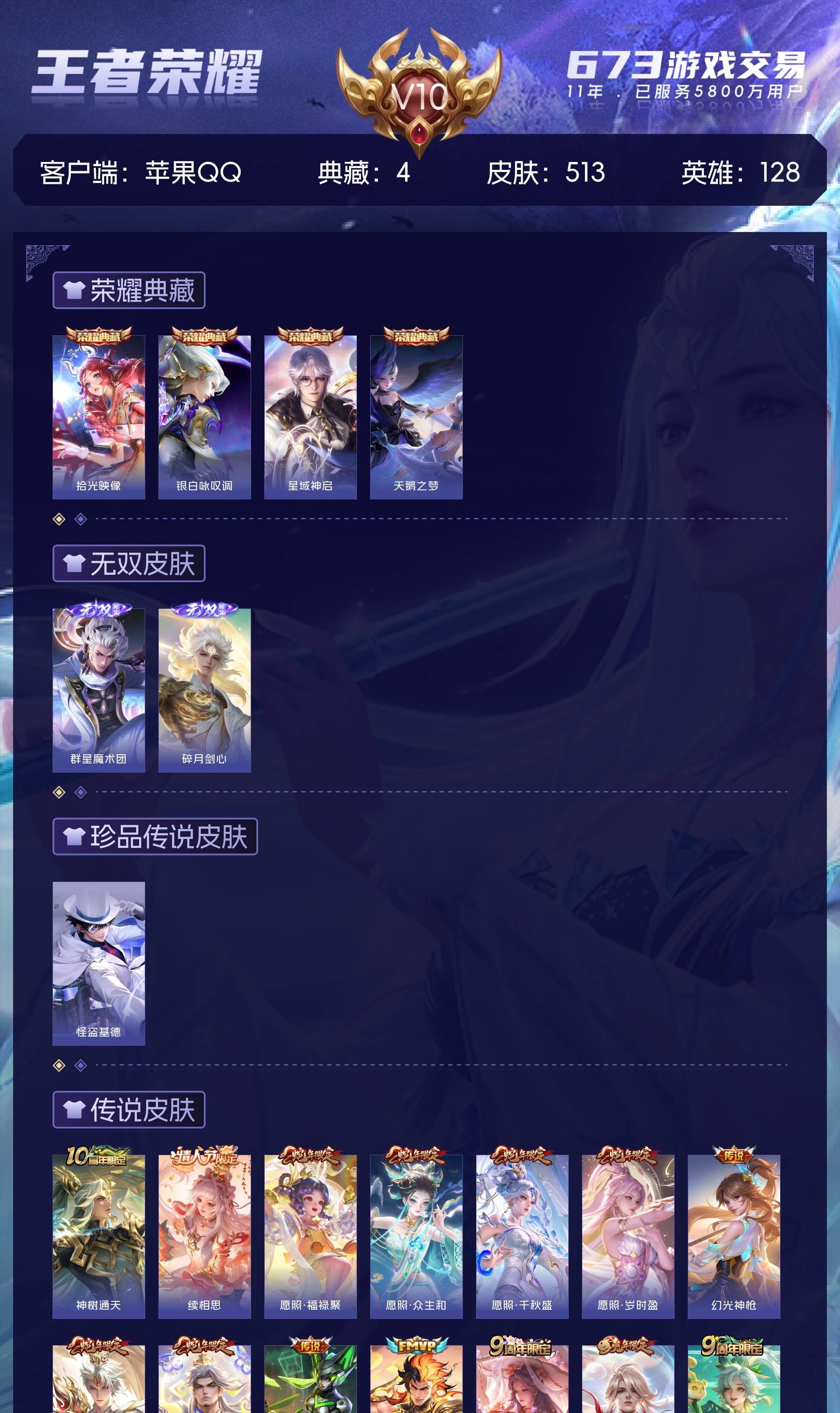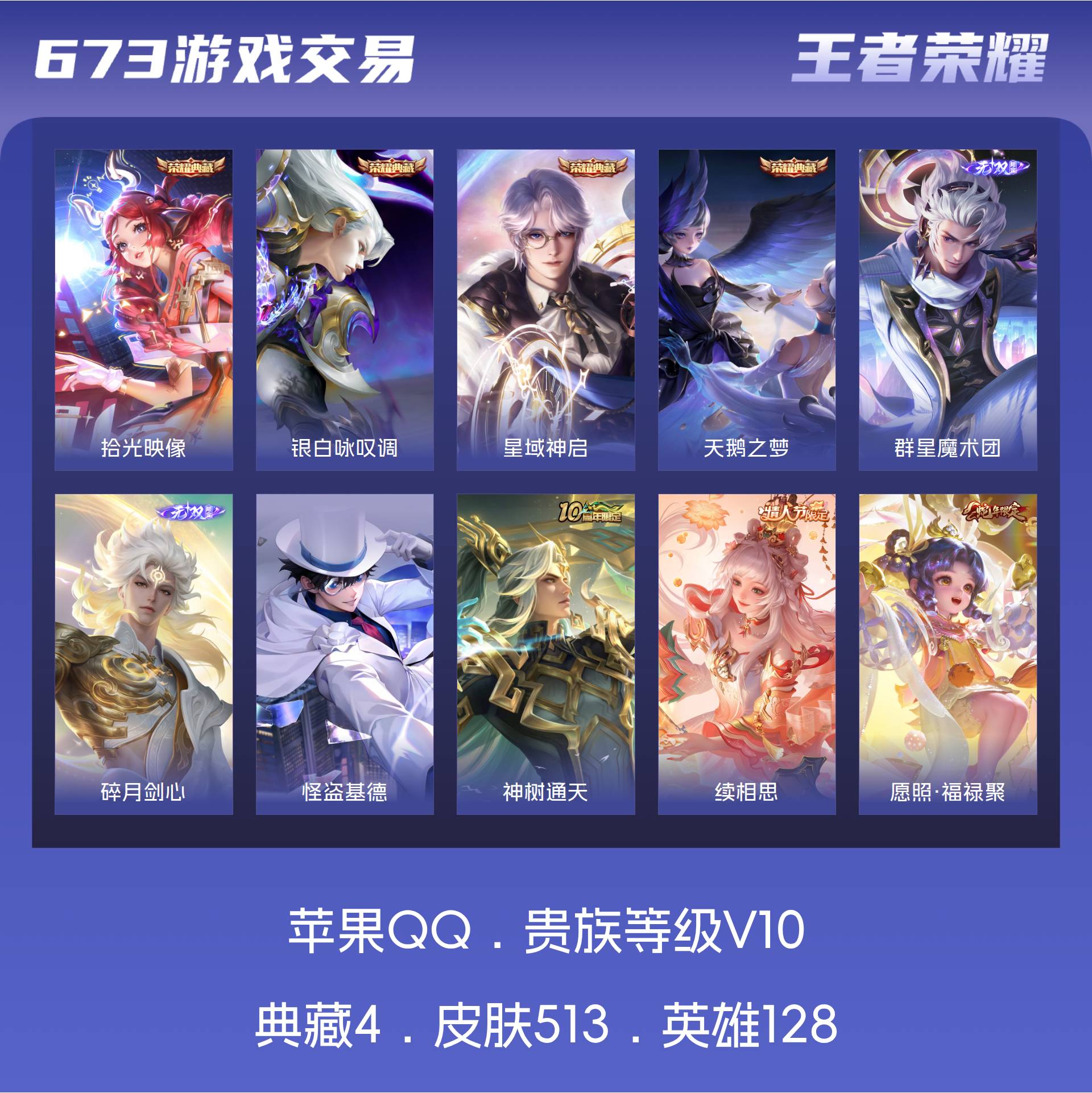 苹果QQ/至尊星耀/513皮肤/128英雄/4典藏/0珍品无双/2无双/1珍品传说/82传说/154