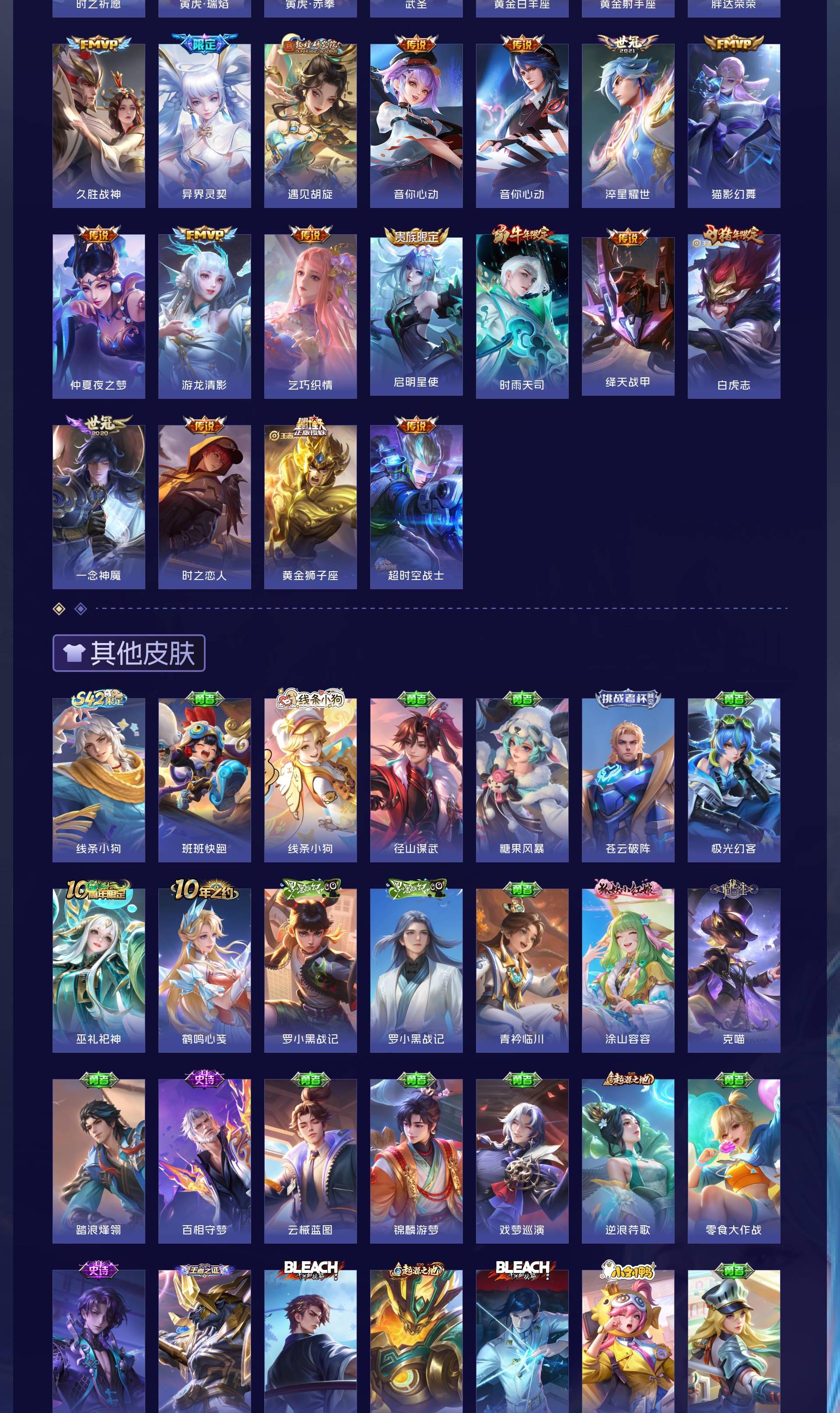V10 皮肤513 英雄128 至尊星耀 荣耀典藏4 无双皮肤2 珍品传说1 传说82 其他皮肤430