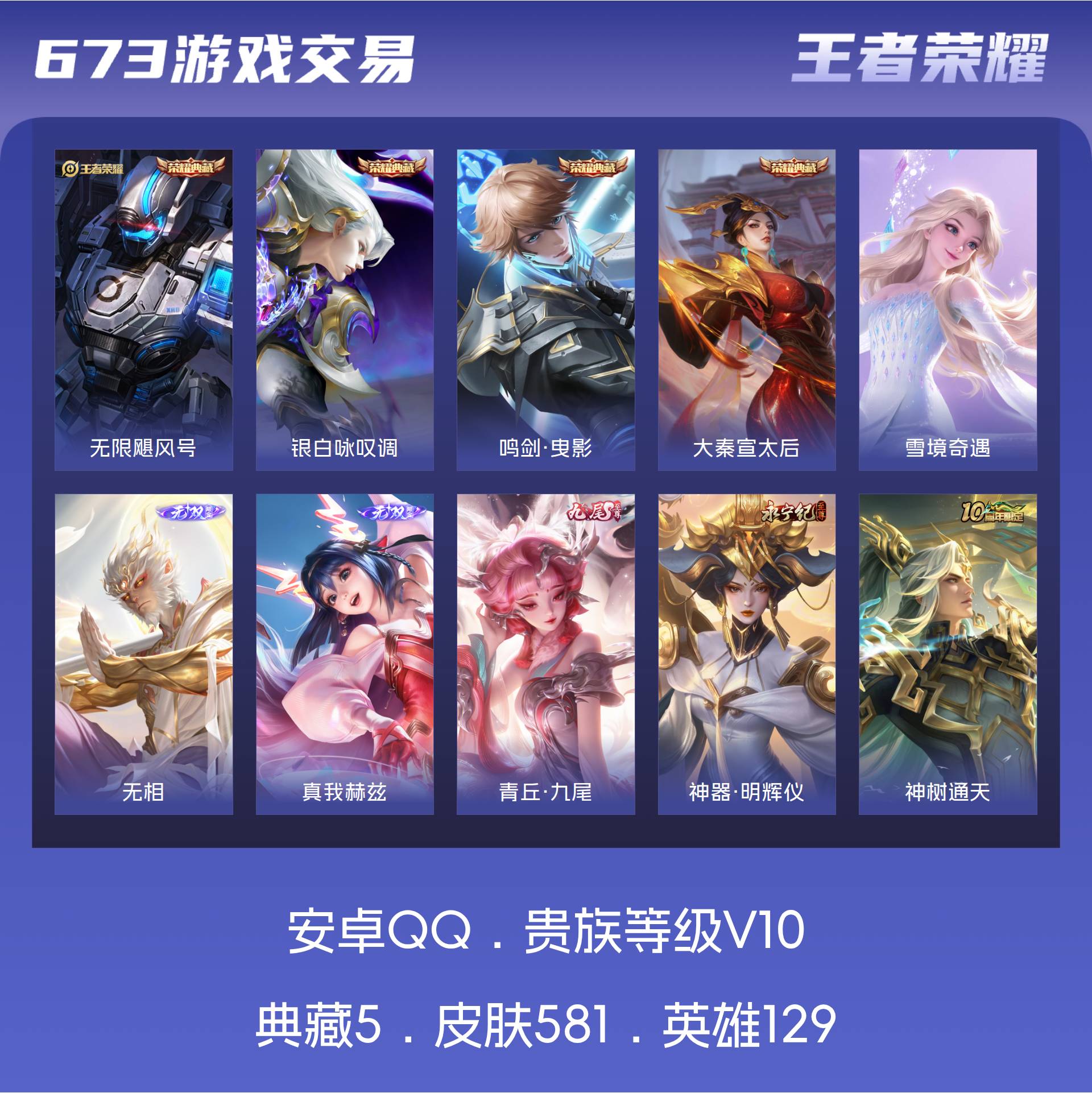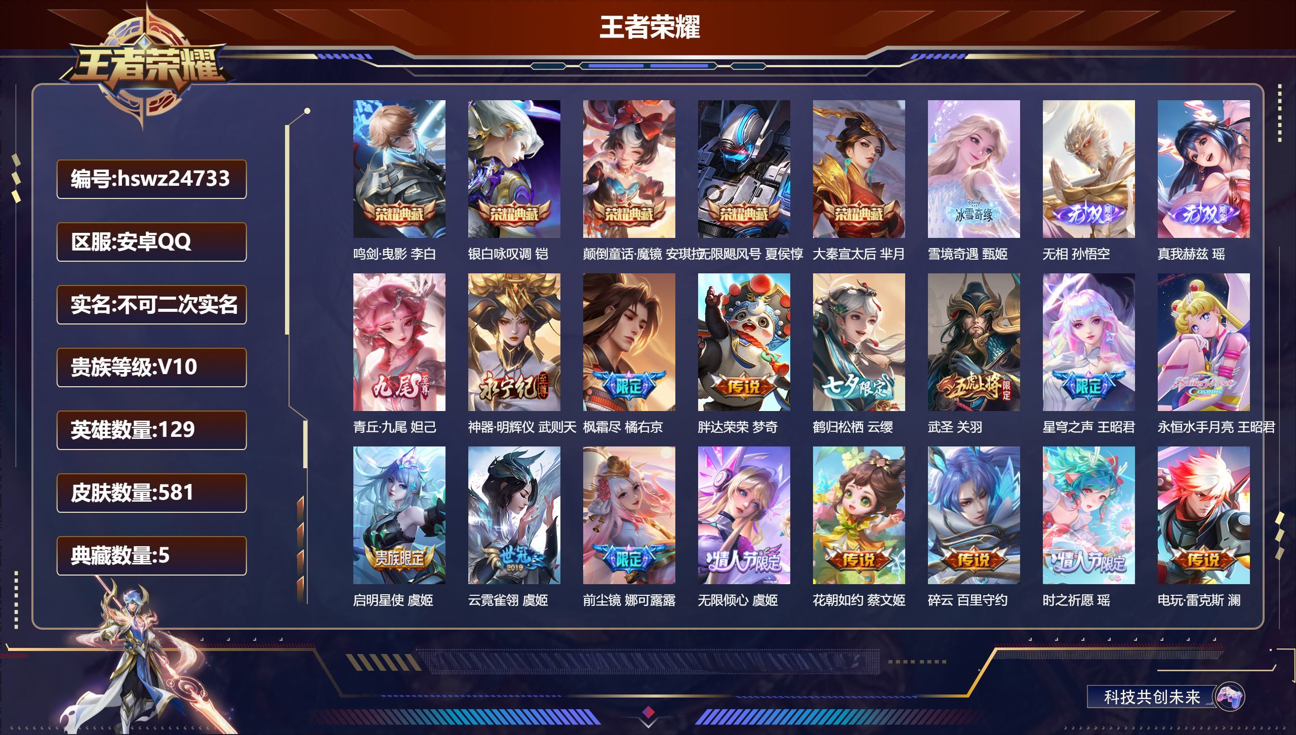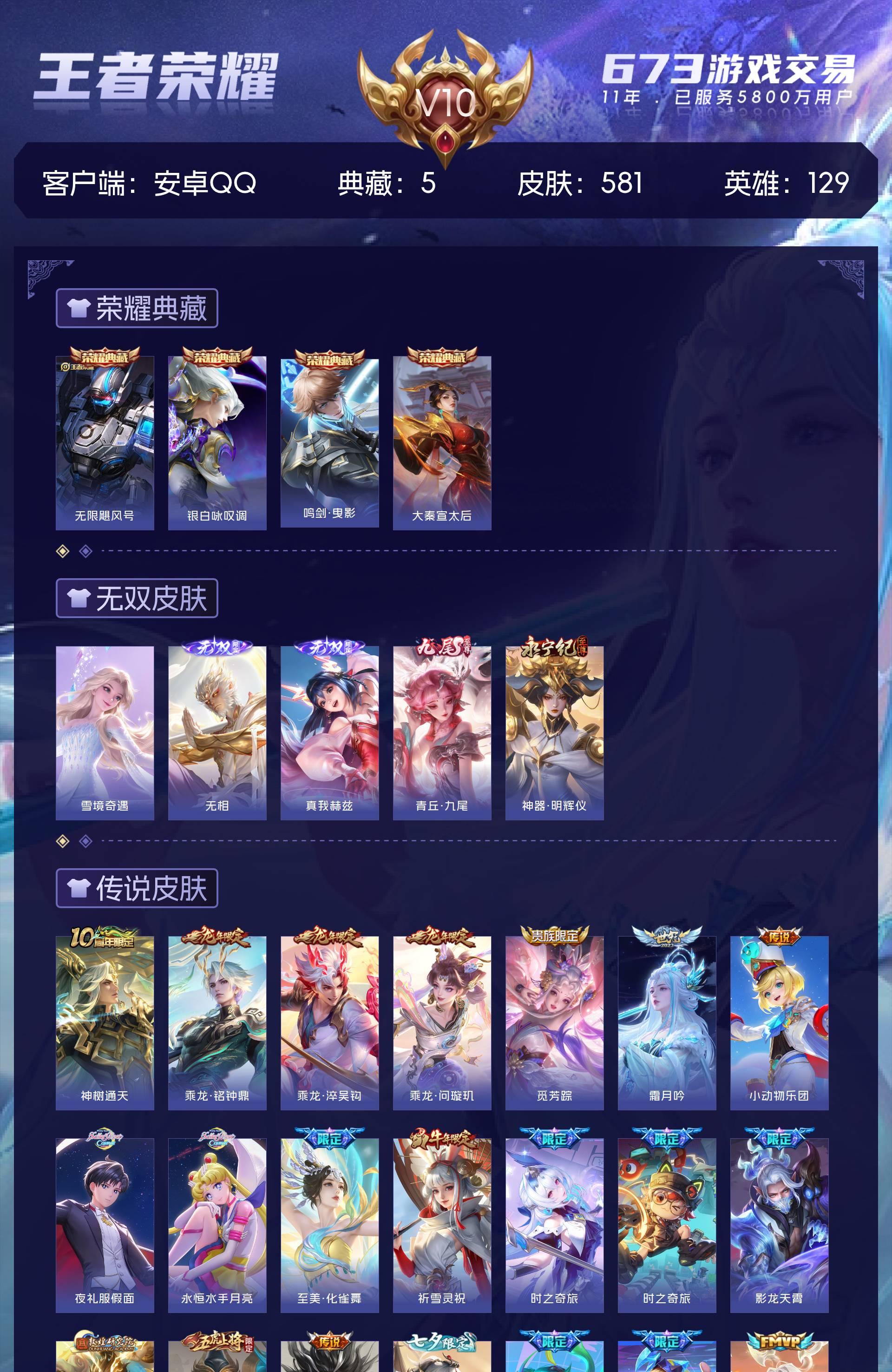 安卓QQ/绝世王者/581皮肤/129英雄/5典藏/0珍品无双/5无双/0珍品传说/99传说/209