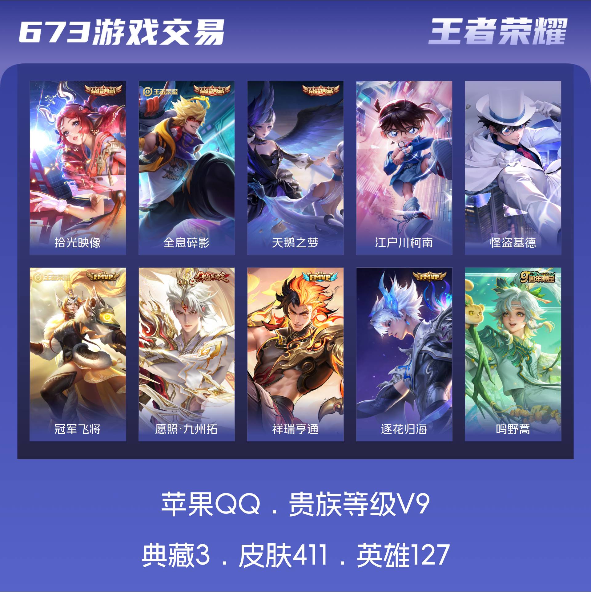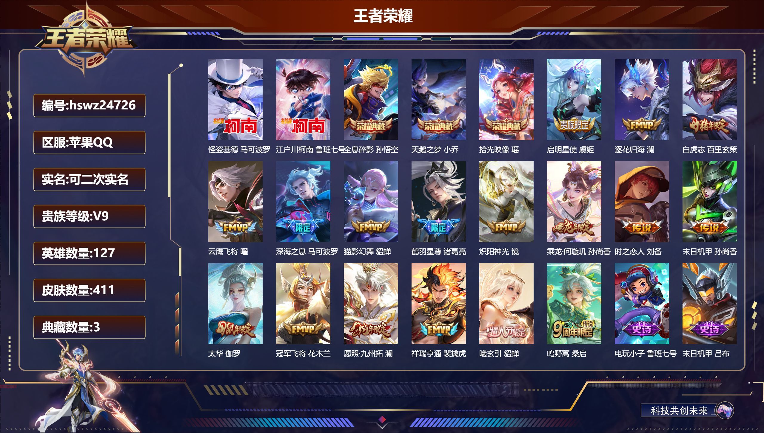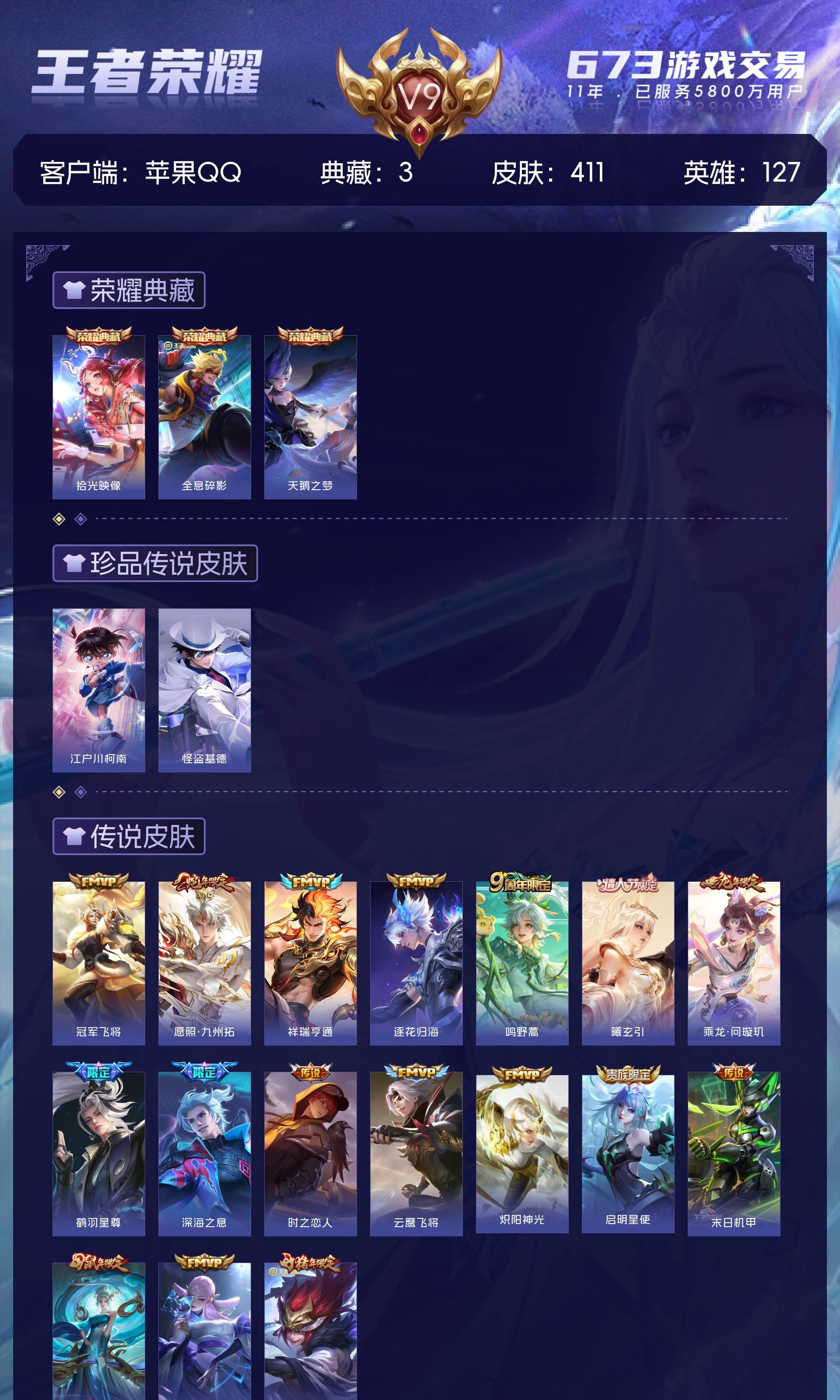 苹果QQ/至尊星耀/411皮肤/127英雄/3典藏/0珍品无双/0无双/2珍品传说/17传说/120