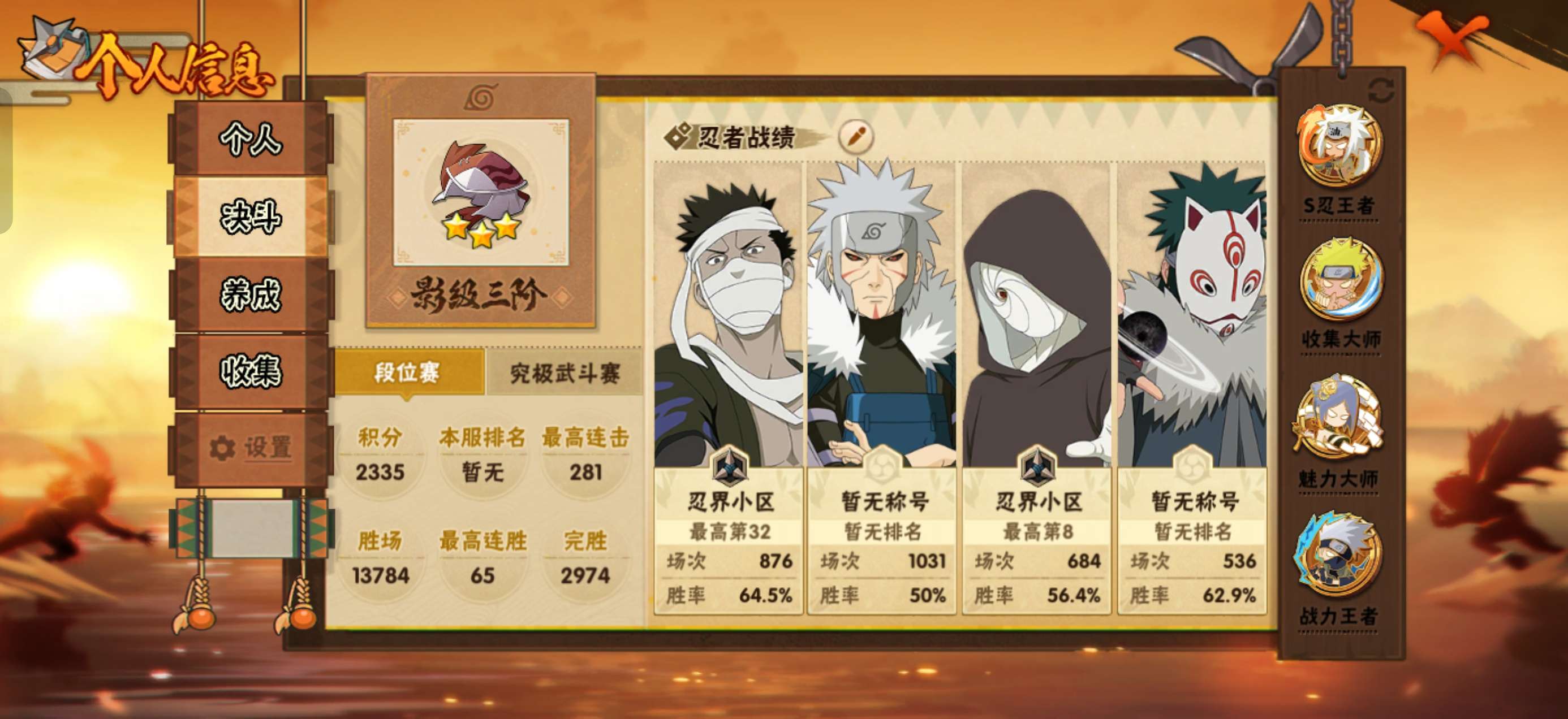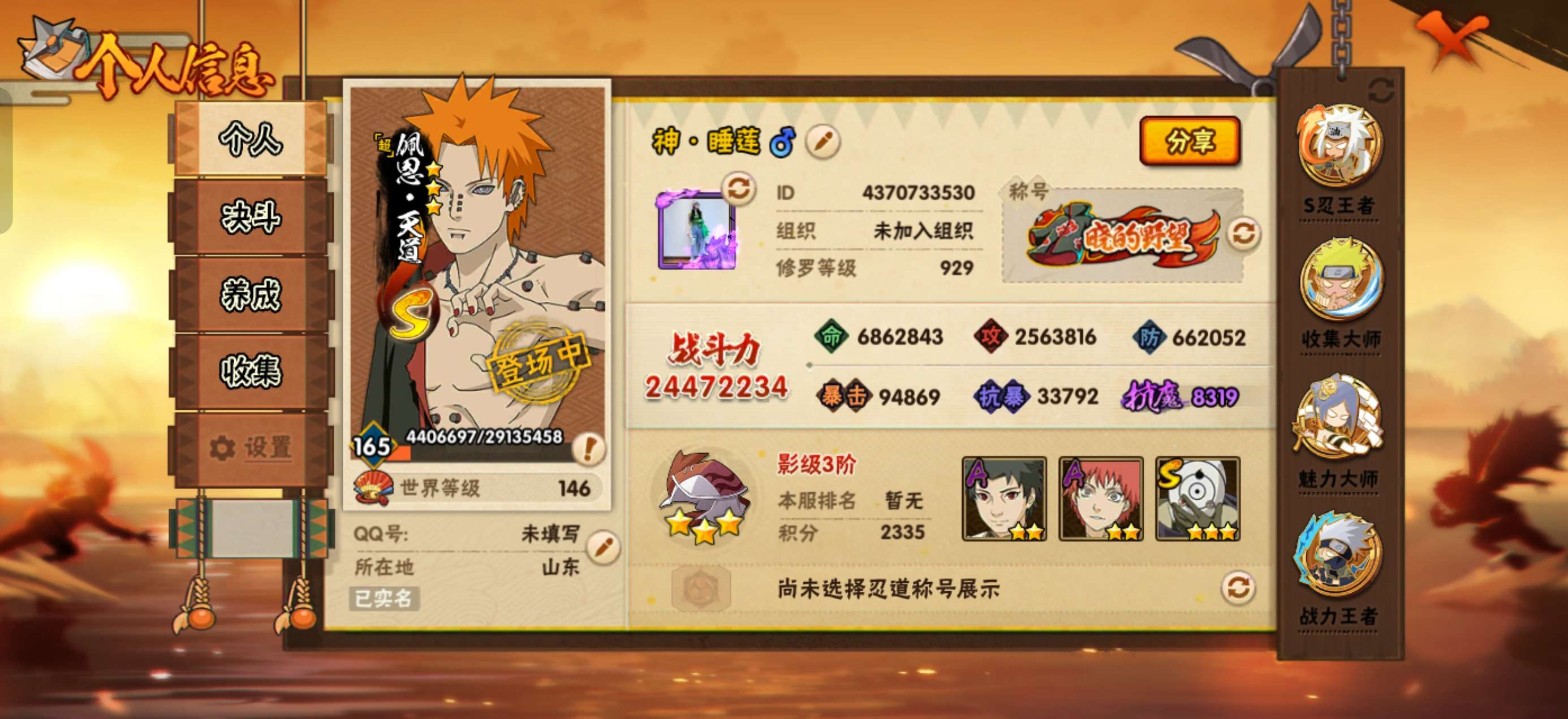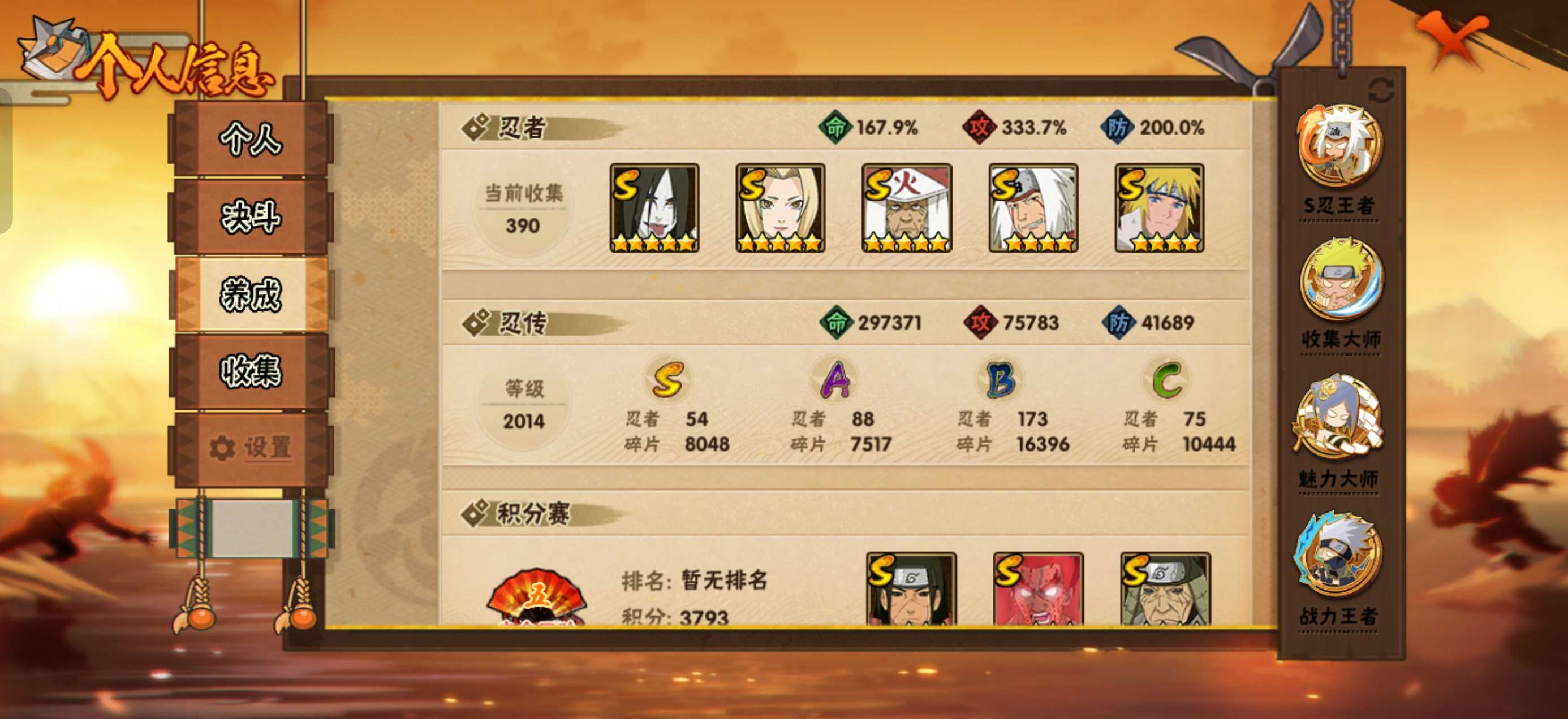 角色等级165 战斗力2400 S忍54 A忍88 15 段位影级