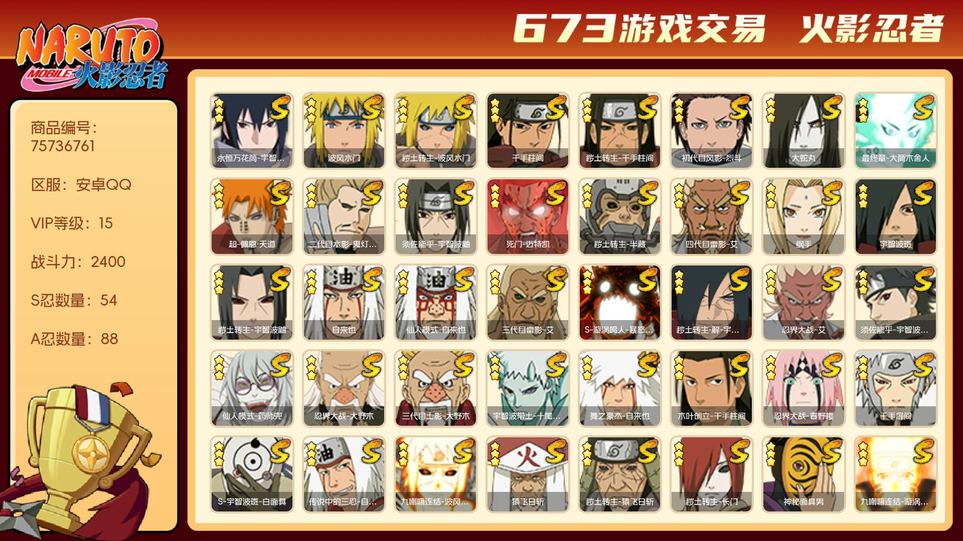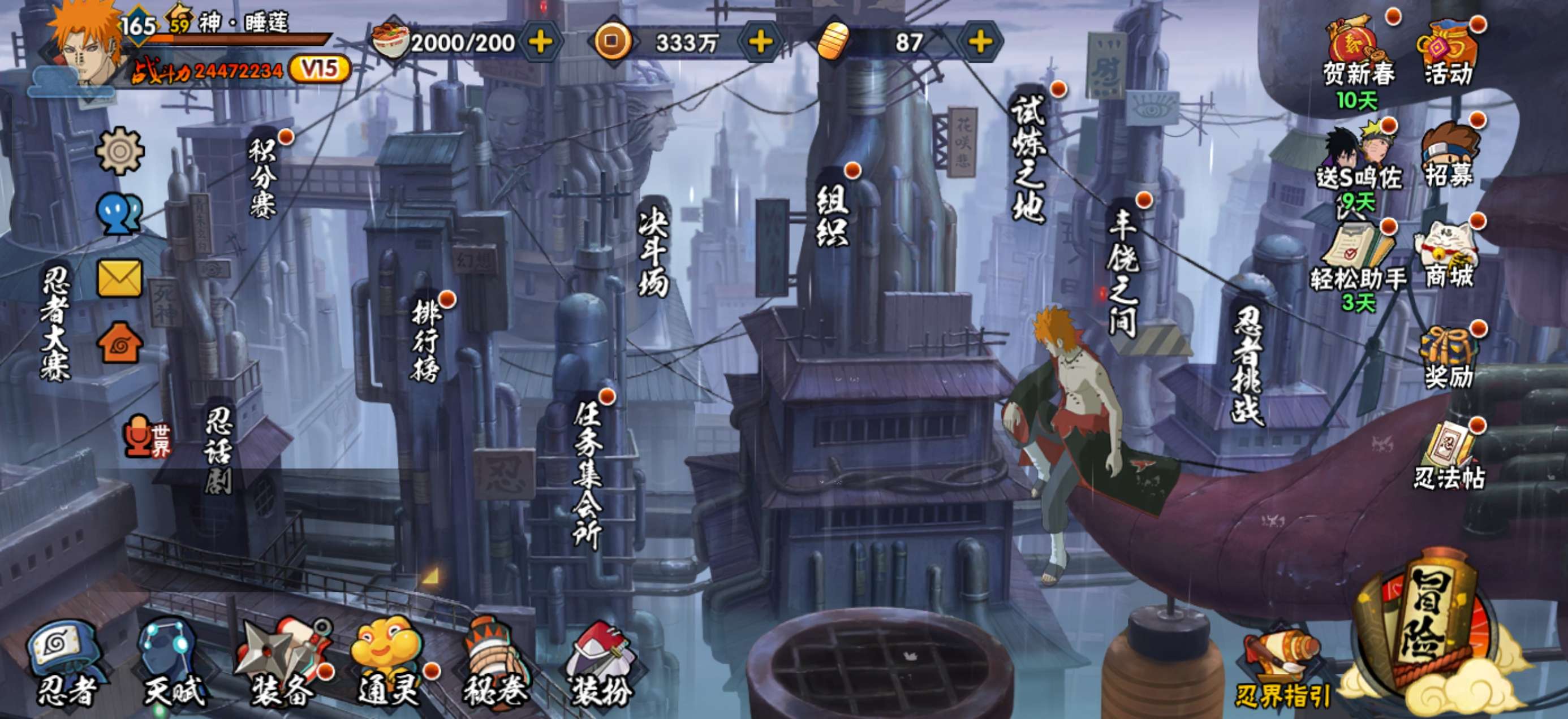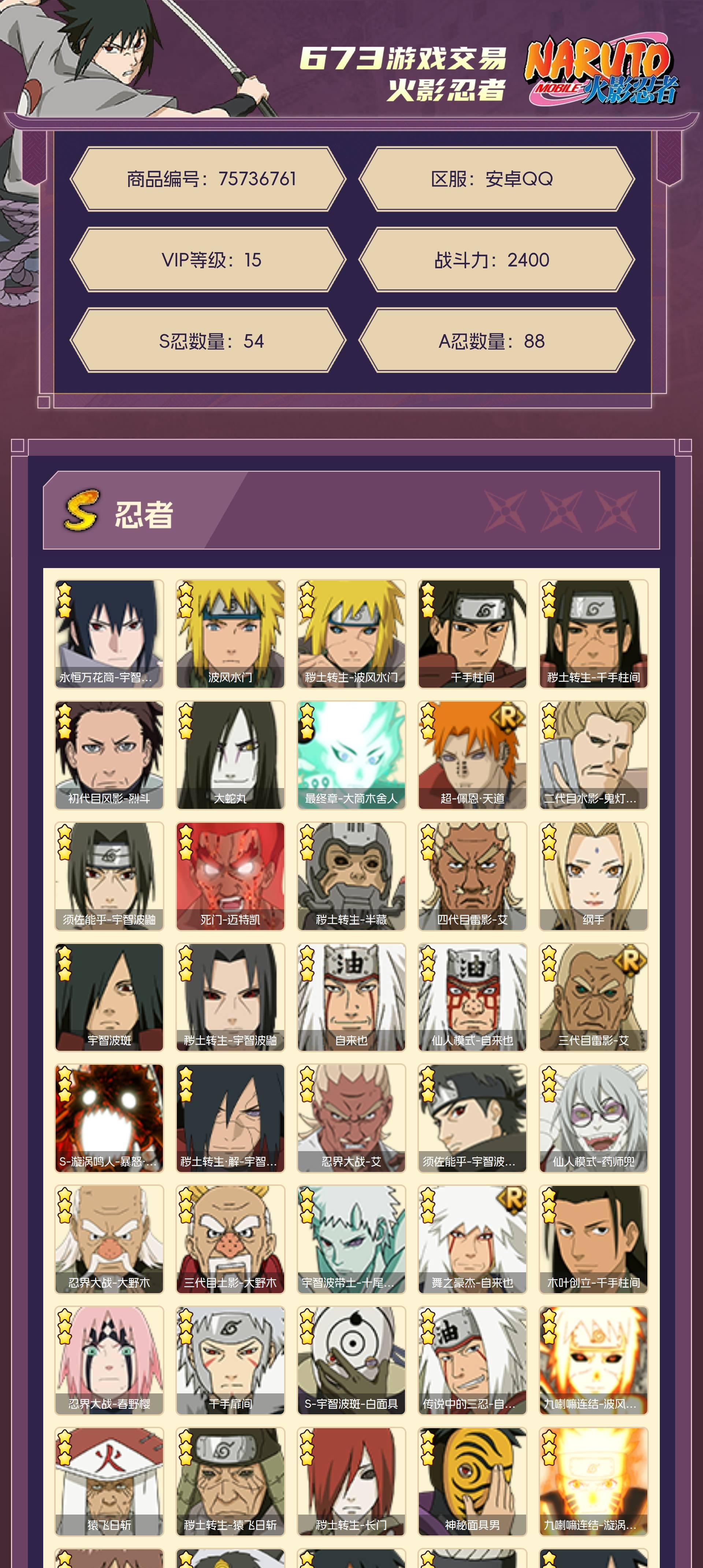 角色等级165 战斗力2400 S忍54 A忍88 15 段位影级