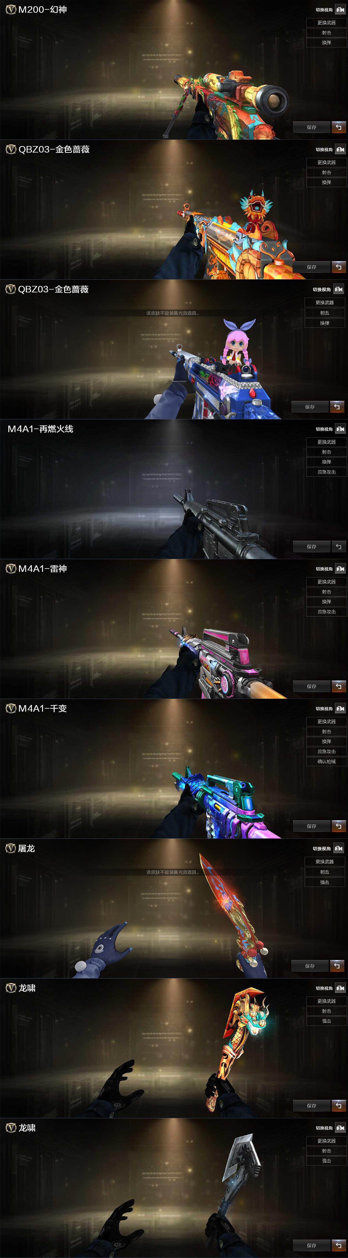 【皮肤】:幻神-纸灯龙皮肤,金色蔷薇-纸灯龙皮肤,金色蔷薇-电竞之星 皮肤,M4A1-再燃火线,雷神-神秘按键 皮肤,M4A1-千变-孔明皮肤,屠龙-惊鸿 皮肤,龙啸-纸