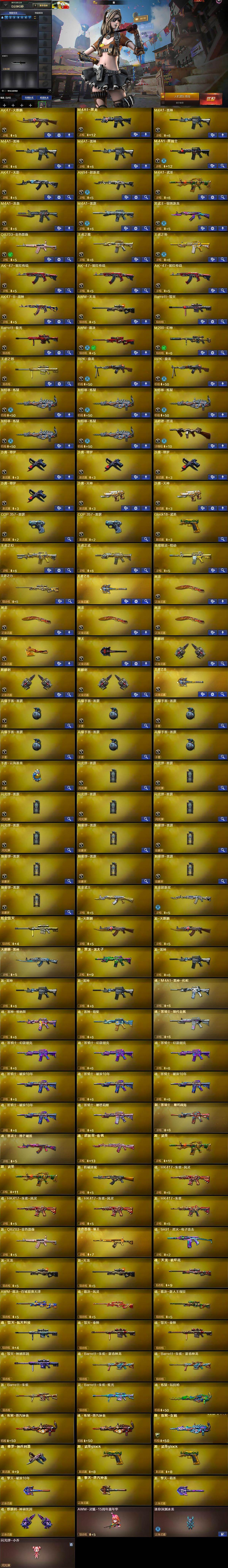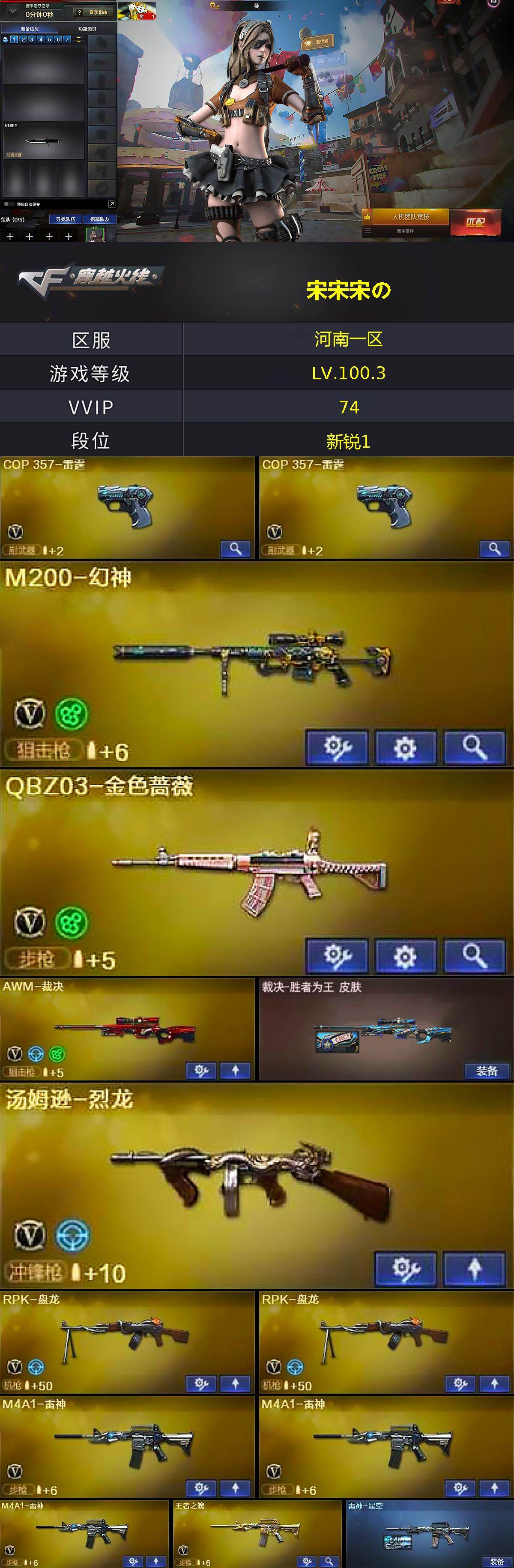 【热门武器】:QBZ03-金色蔷薇,M200-幻神,M4A1-黑骑士,汤姆逊-烈龙,RPK-盘龙*2,加特林-炼狱*5,沙鹰-修罗*4