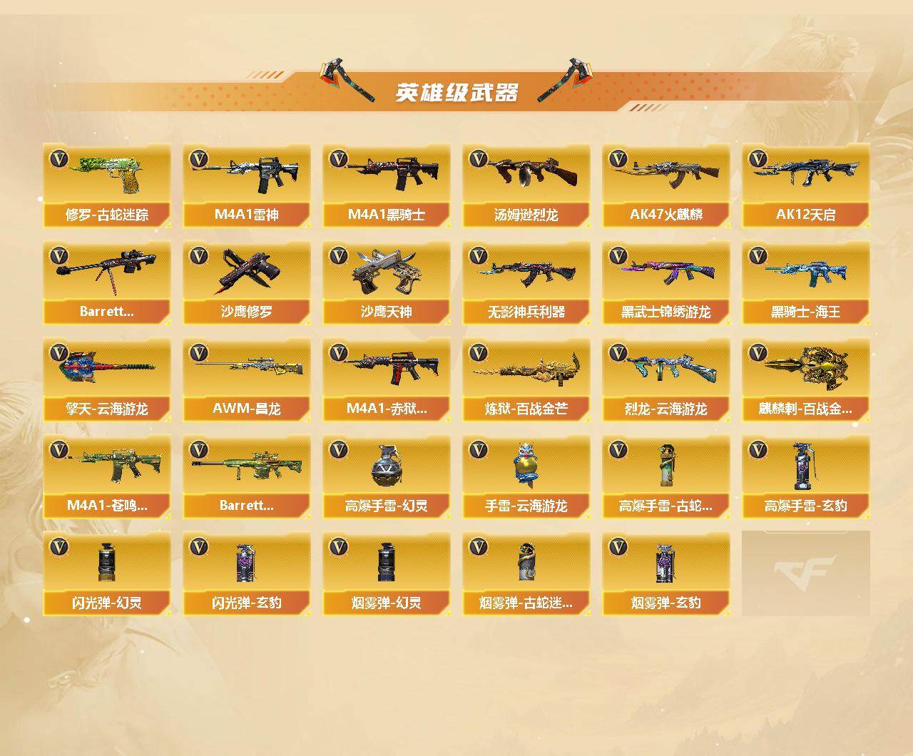 【音效卡】:M4A1-雷神音效卡,Barrett-碧霄极光音效卡,炼狱-百战金芒-庆典舞曲音效卡,AWM-昌龙-怀旧音效卡