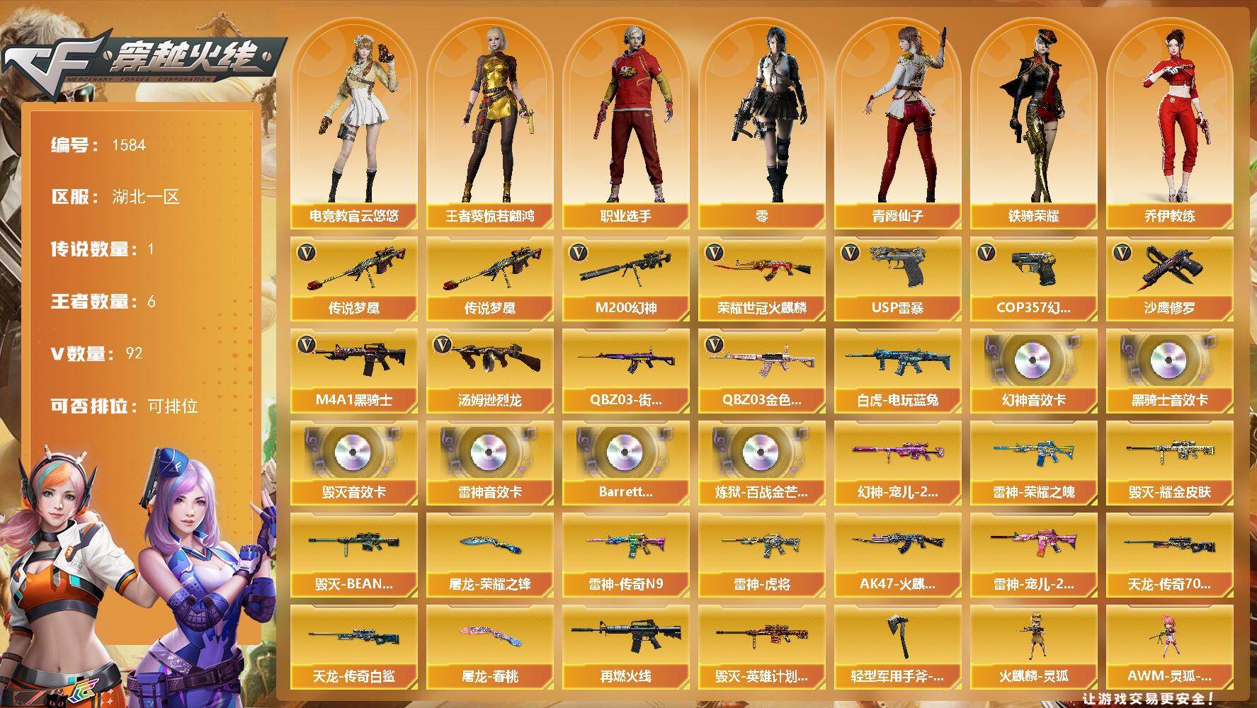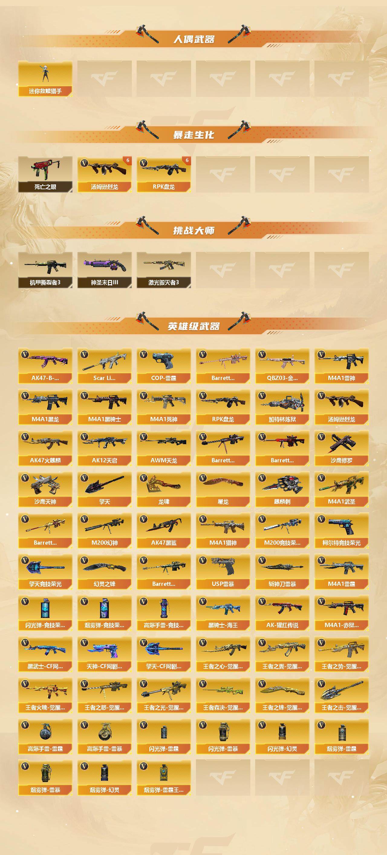 【热门武器】:传说圣灵,传说辉光,QBZ03-金色蔷薇,Scar Light-白虎,M200-幻神,M200-竞技荣光,死亡之眼*4,M4A1-黑骑士,汤姆逊-烈龙*6,RPK-盘龙*6,加特林-炼狱,斯泰尔-蝴蝶,USP-雷暴,沙鹰-修罗*2