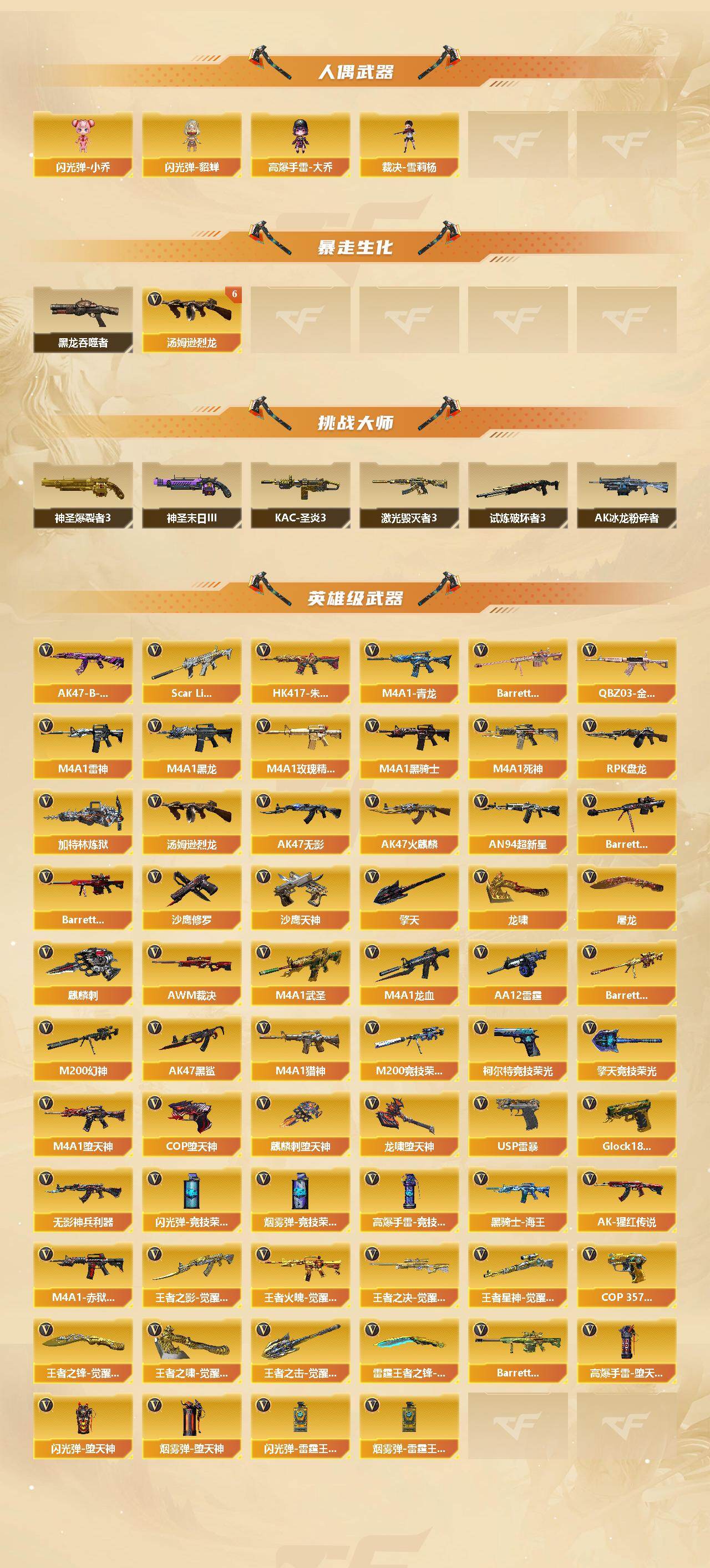 【热门武器】:QBZ03-金色蔷薇*3,Scar Light-白虎,HK417-朱雀,M4A1-青龙,M200-幻神,M200-竞技荣光,C.A.T,M4A1-黑骑士*2,汤姆逊-烈龙*6,RPK-盘龙*3,加特林-炼狱*3,斯泰尔-蝴蝶,裁决-雪莉杨,USP-雷暴,COP-堕天神,沙鹰-修罗*3,金刚伞
