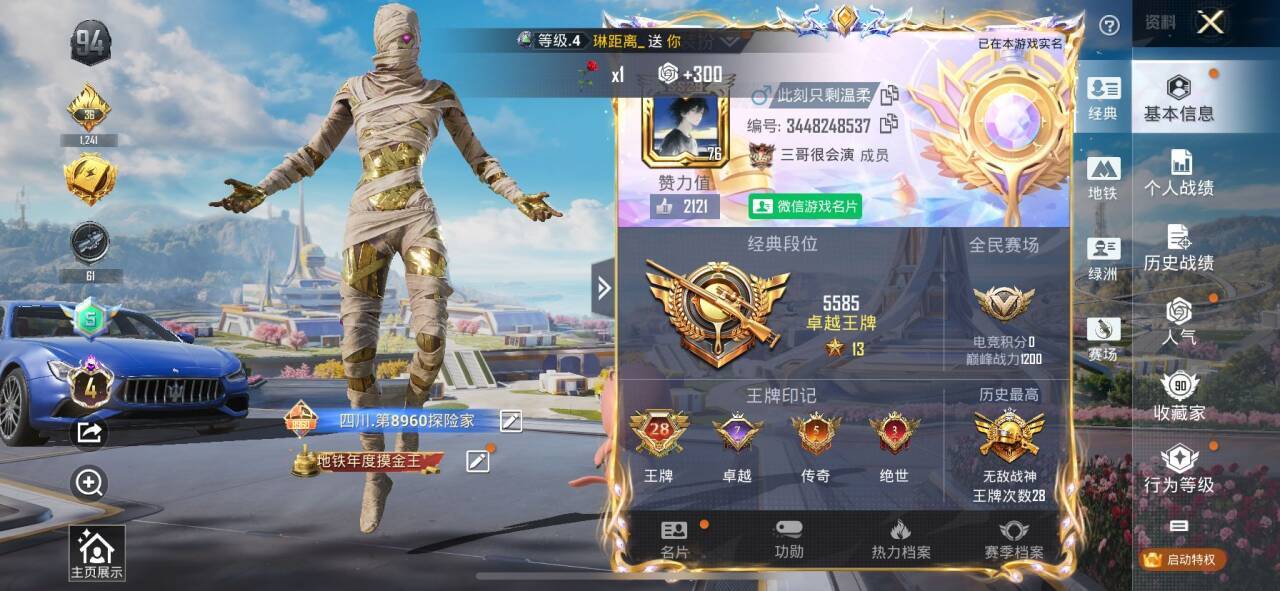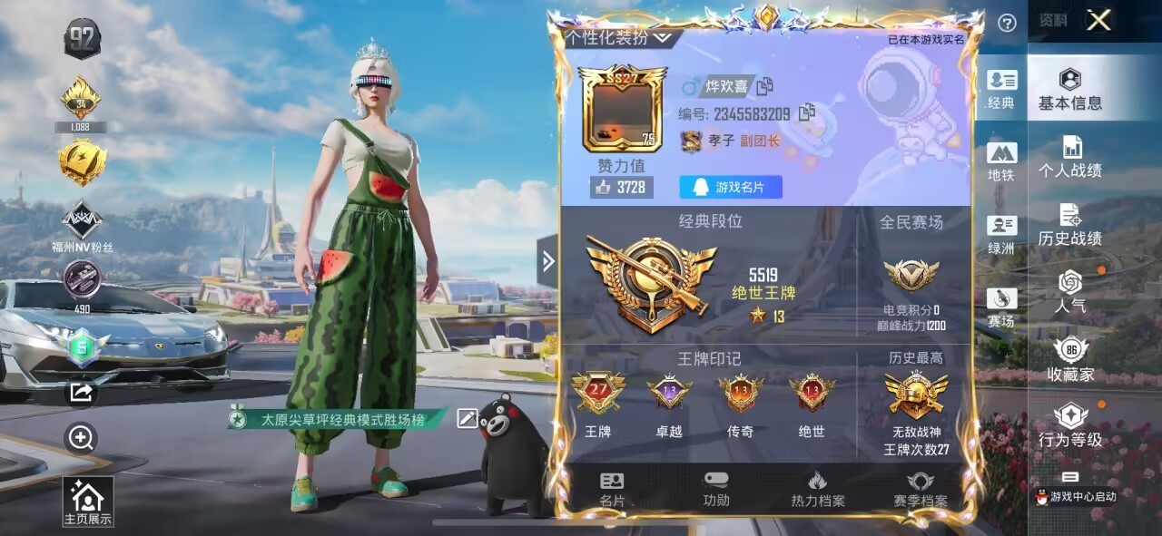 可二次实名【木乃伊小丑螳螂赤蝎金鞋都市男神16特效枪7粉装2载具小熊背包身法素材号 秒换绑不用等】 苹果Q区-76734热力值-11印记-153套装-226枪皮 【2载具】 护世瑞兽 宾利飞驰(布罗德盖棕双色)【8稀有】 木乃伊 赤蝎幽灵 都市猎人 派对舞王(金靴子) 派对舞王 萌熊伴侣背包(小熊背包) Mark.06蓝螳螂 8号机粉螳螂【7粉装】 怪诞乔克(小丑) 角色-初号机 觉醒Ver. 梦幻火箭 圣堂之誓 放客神游 角色-异瞳寒姬 角色-萨利娅【16特效枪】 M416-风花雪月(6级)