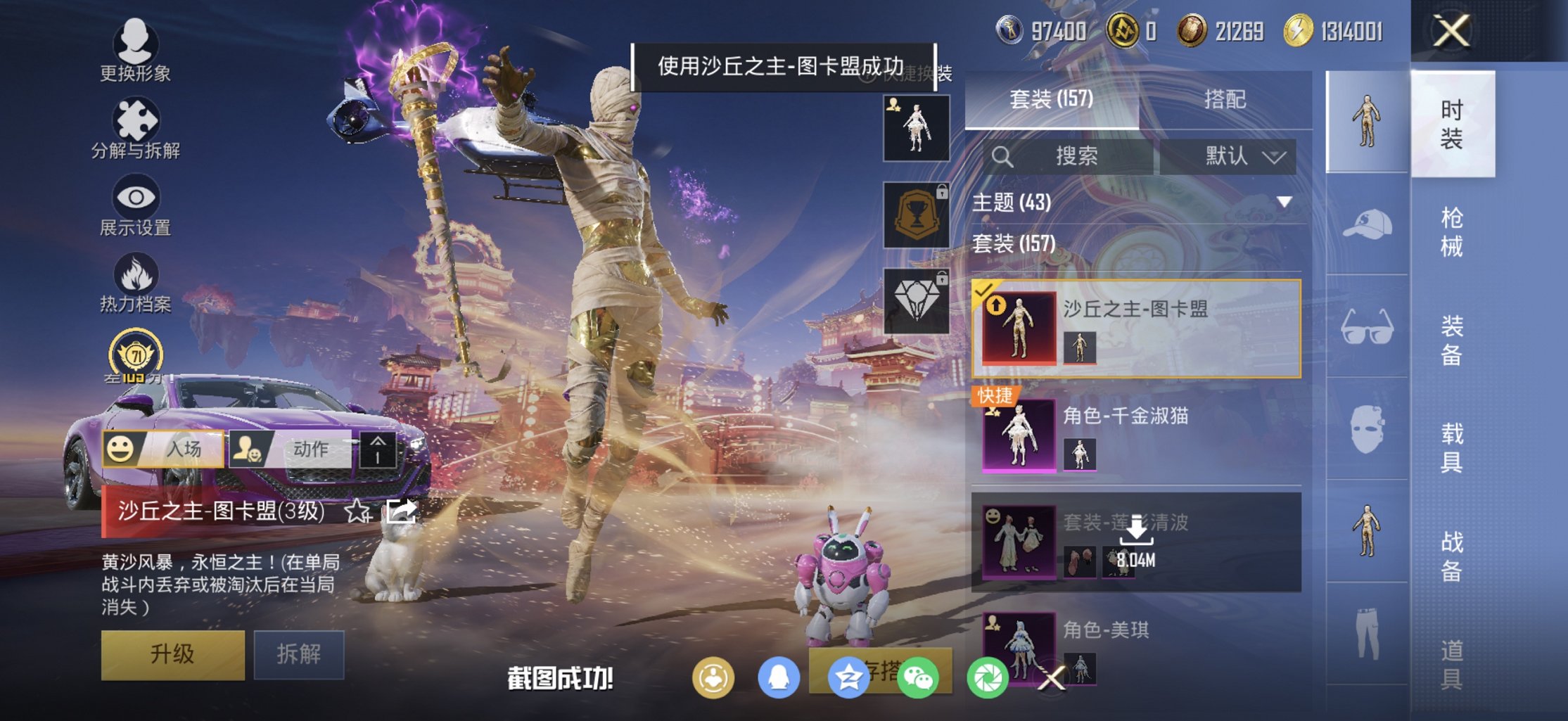 可二次实名【3级图卡盟白木乃伊7载具6粉装7特效枪身法素材号】 苹果V区-78392热力值-16印记-157套装-222枪皮 【1红装】 沙丘之主-图卡盟(3级)【7载具】 兰博轿车灰色 兰博SUV黄色 兰博SVJ绿色 焰龙咆哮 空客蔚蓝之翼僚机 宾利BATTUR(极速紫) 仰望U9(赤霞丹朱)【3稀有】 木乃伊 Mark.06蓝螳螂 8号机粉螳螂【6粉装】 梦幻火箭 沙场疾风 莲影清波 光明术士 角色-美琪 角色-千金淑猫【7特效枪】 P90-沙丘之主(3级) M416-五爪金龙(6级) SC