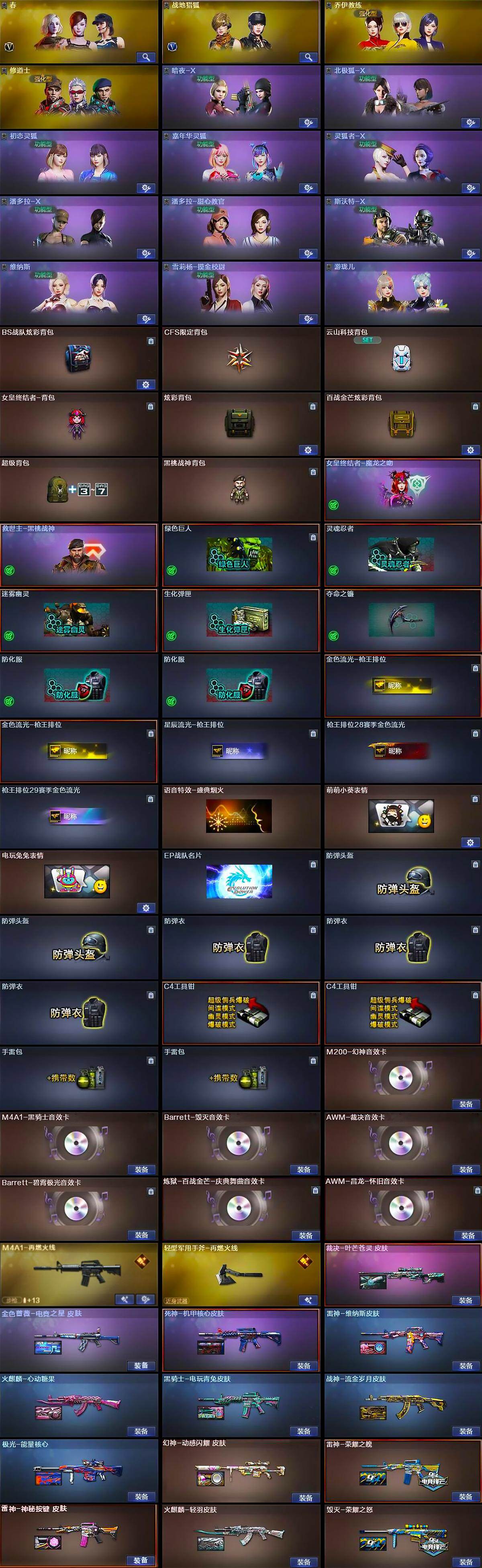 【音效卡】:M200-幻神音效卡,M4A1-黑骑士音效卡,Barrett-毁灭音效卡,AWM-裁决音效卡,Barrett-碧霄极光音